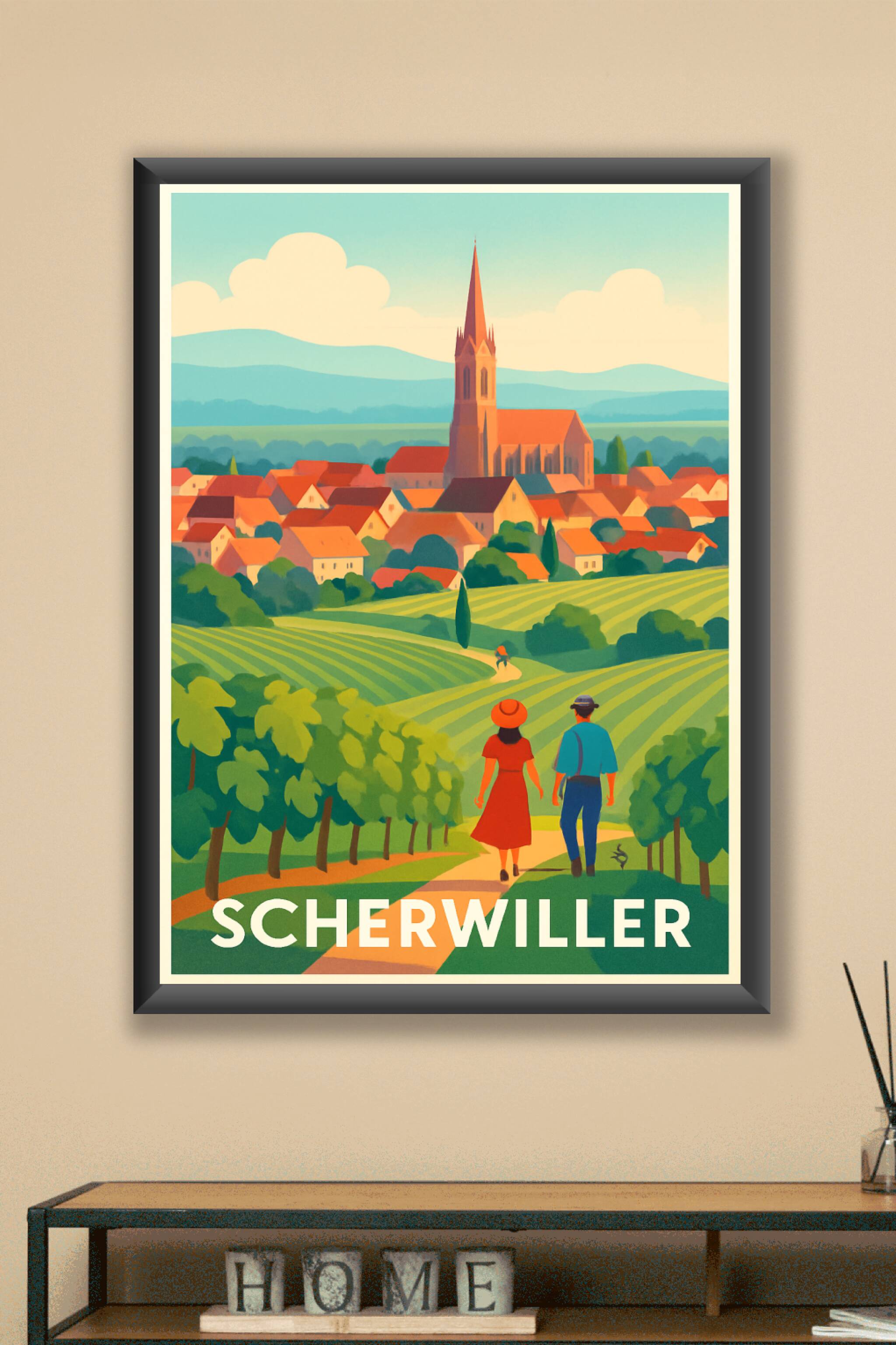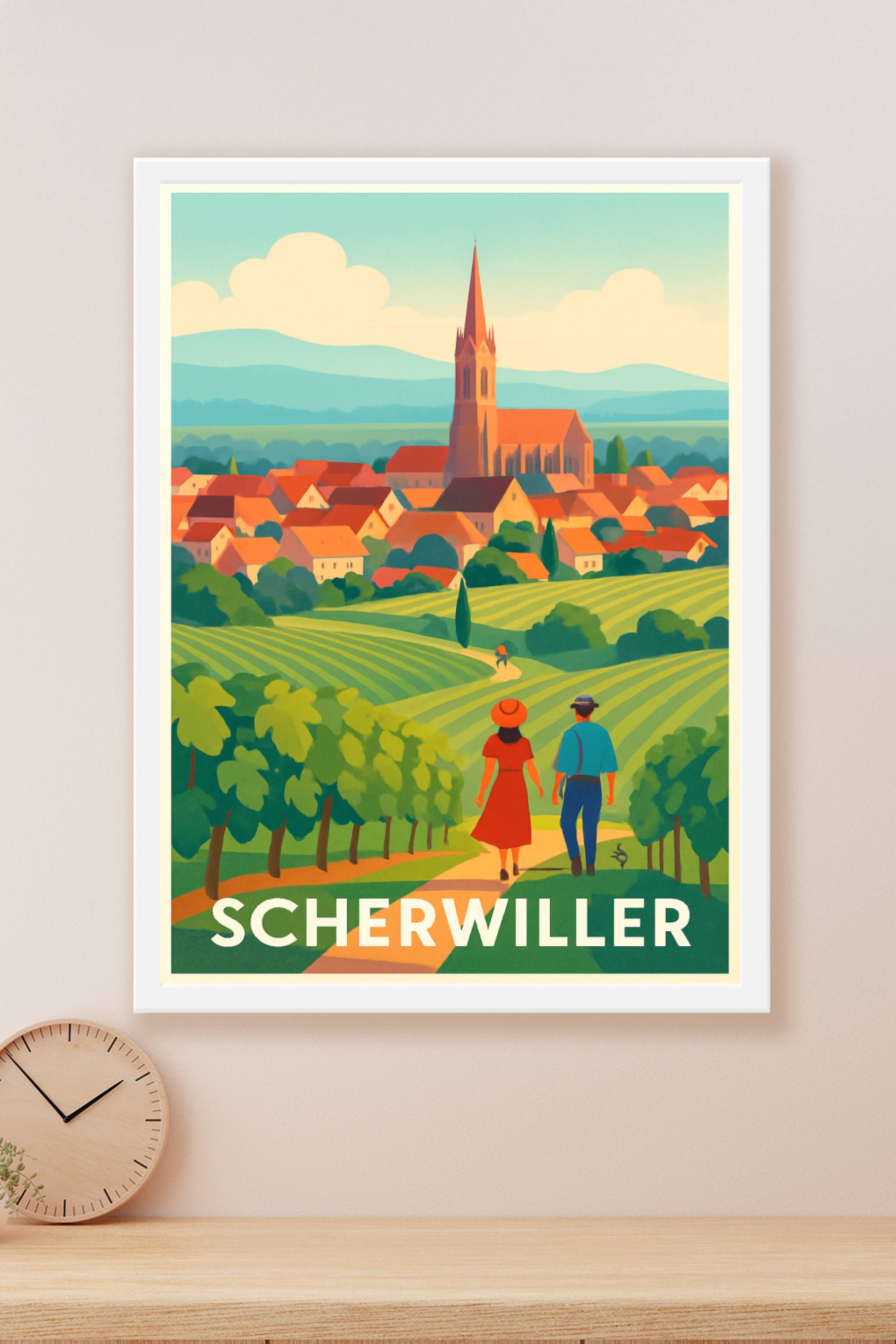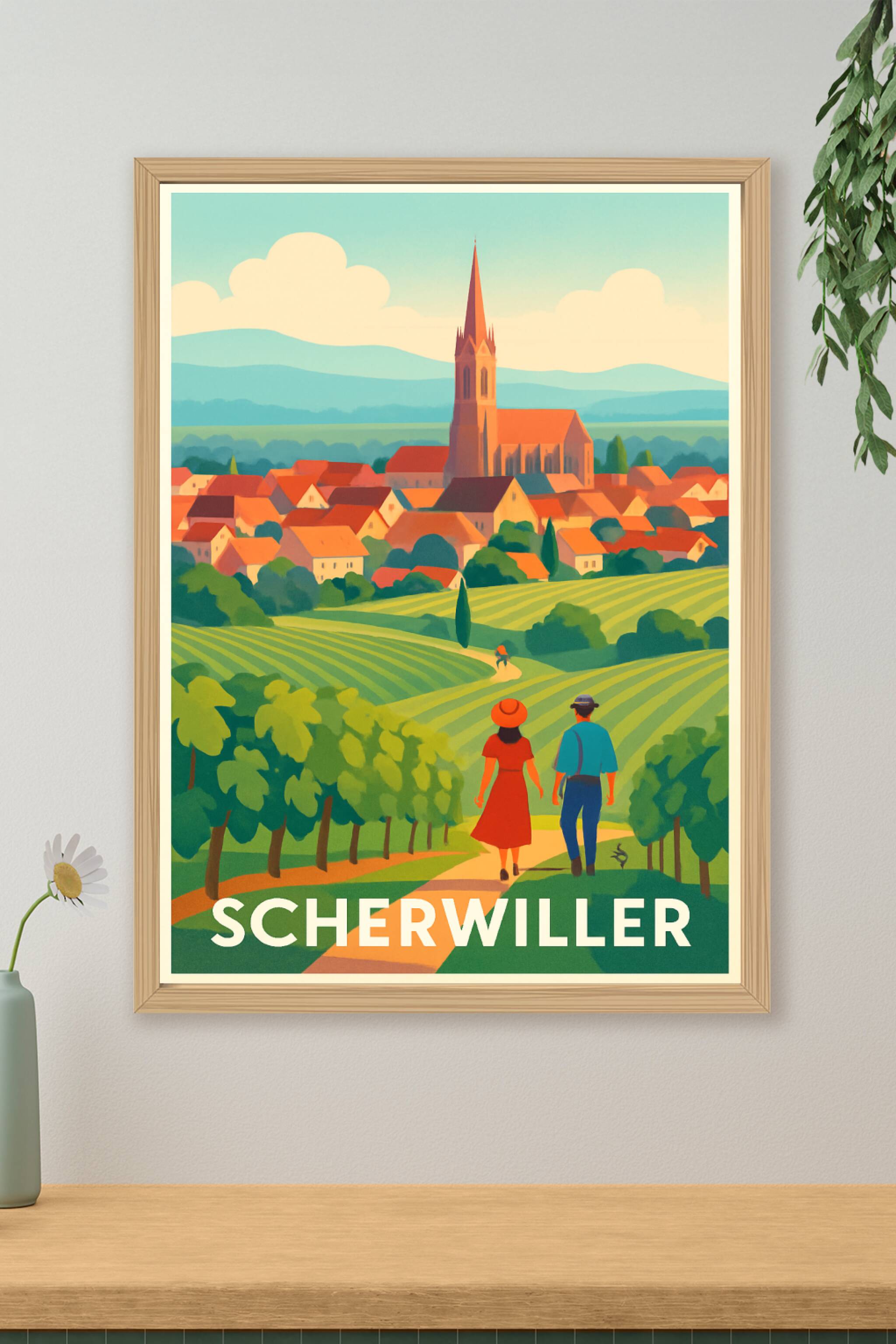 Découvrez l'élégance pastorale de Scherwiller avec cette affiche captivante qui révèle l'harmonie entre la nature et l'architecture traditionnelle....