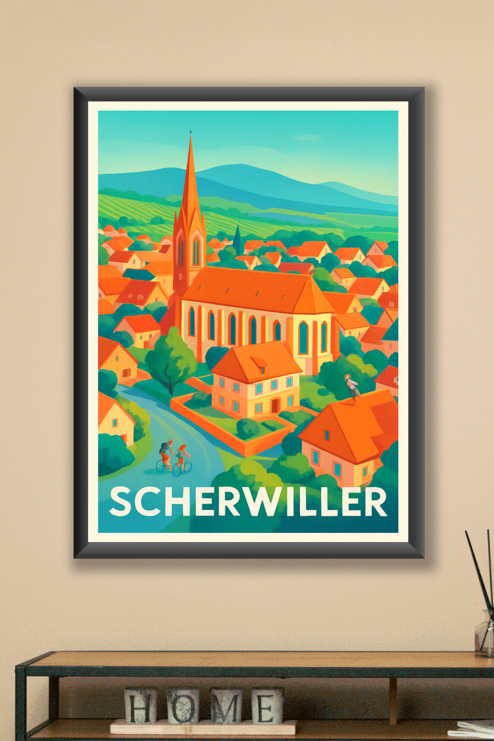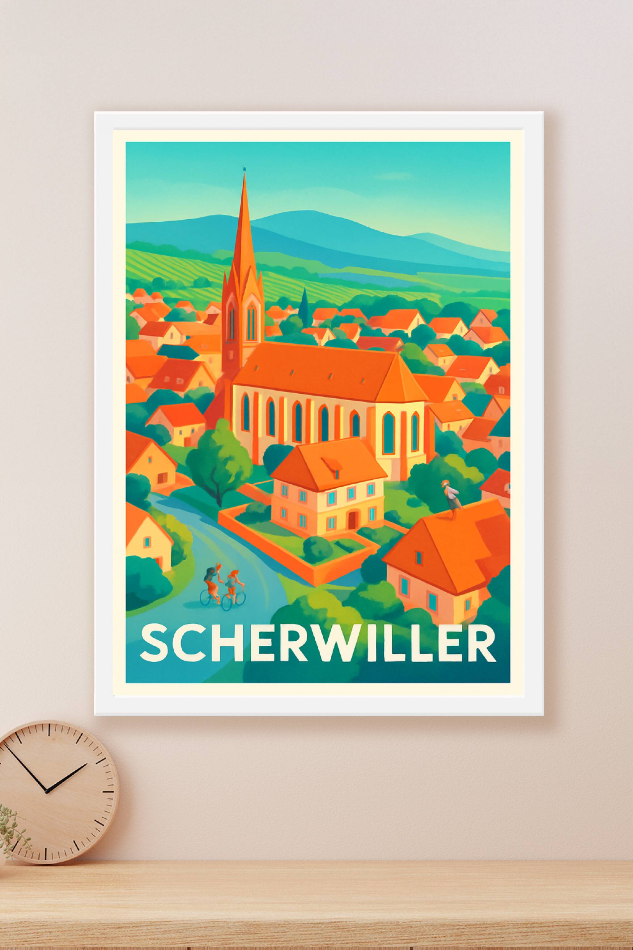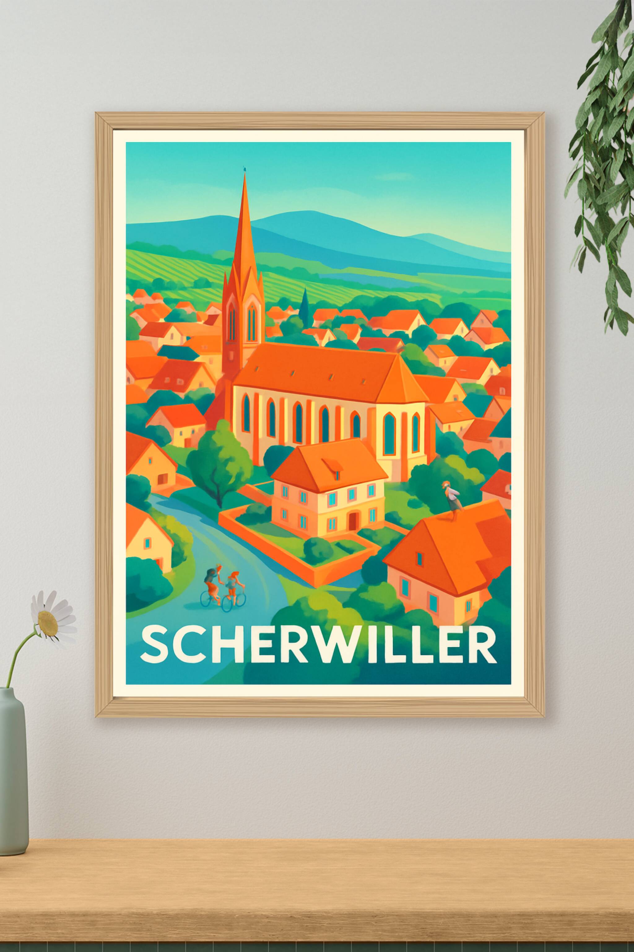 Découvrez l'ambiance paisible et chaleureuse de Scherwiller avec cette affiche illustrée au style vintage coloré. L'église emblématique se dresse a...
