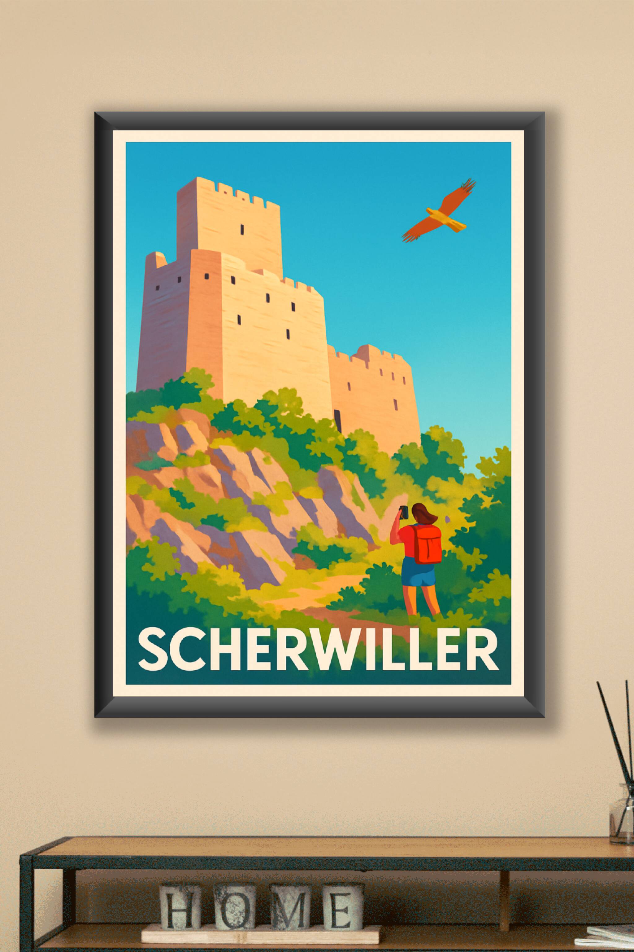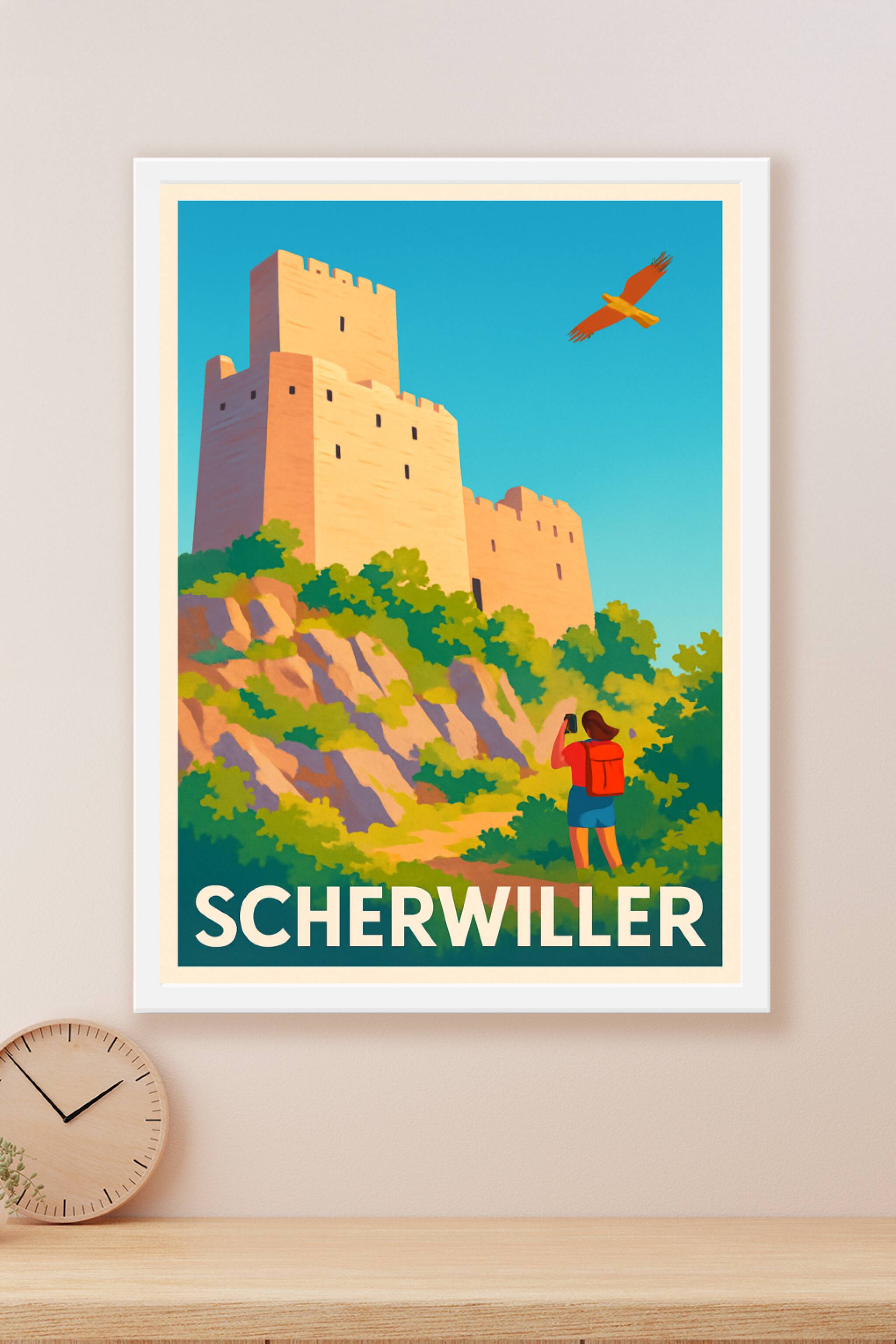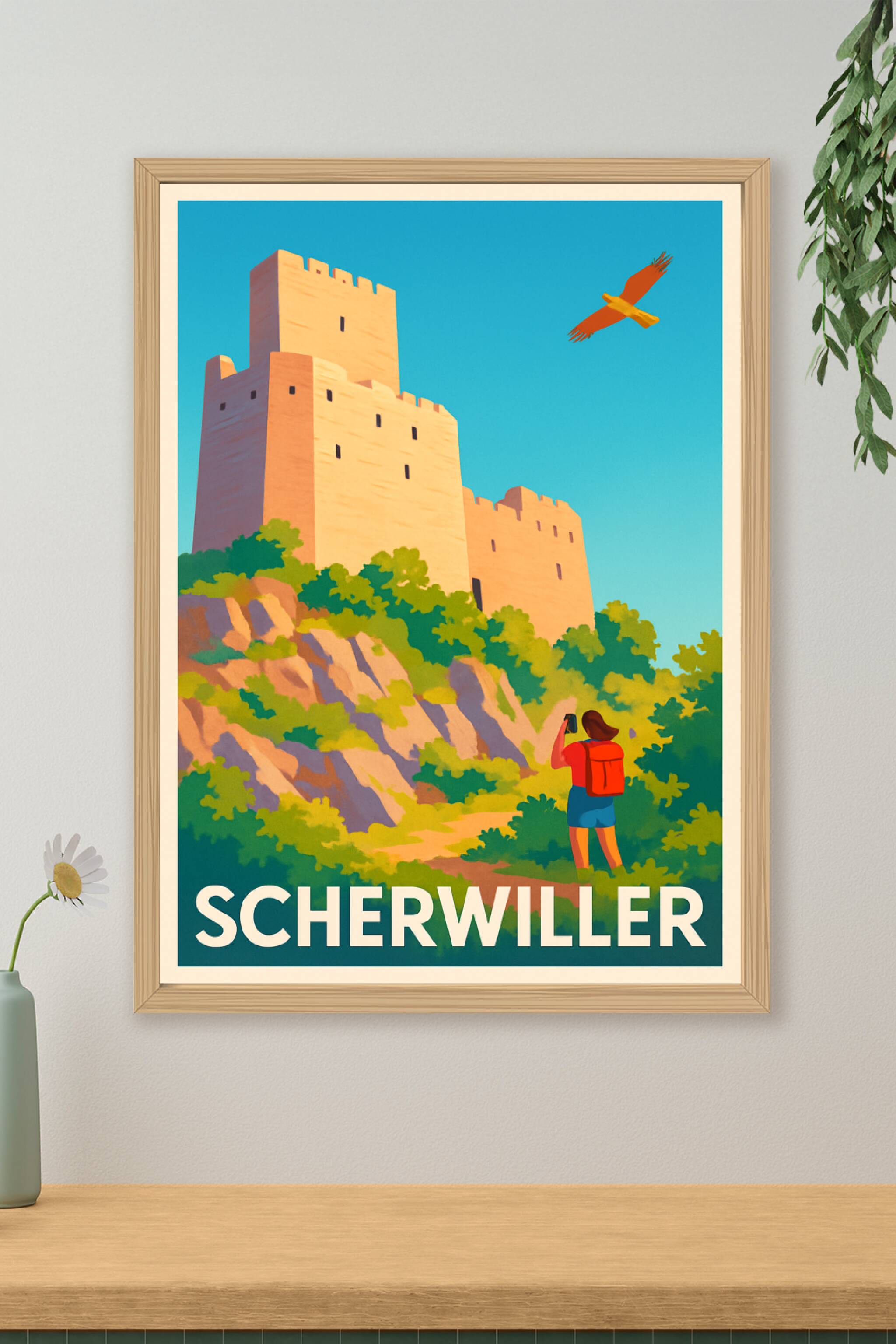 Découvrez la beauté majestueuse du château de Scherwiller avec cette affiche illustrée aux couleurs vibrantes et à l'ambiance ensoleillée. Cette sc...