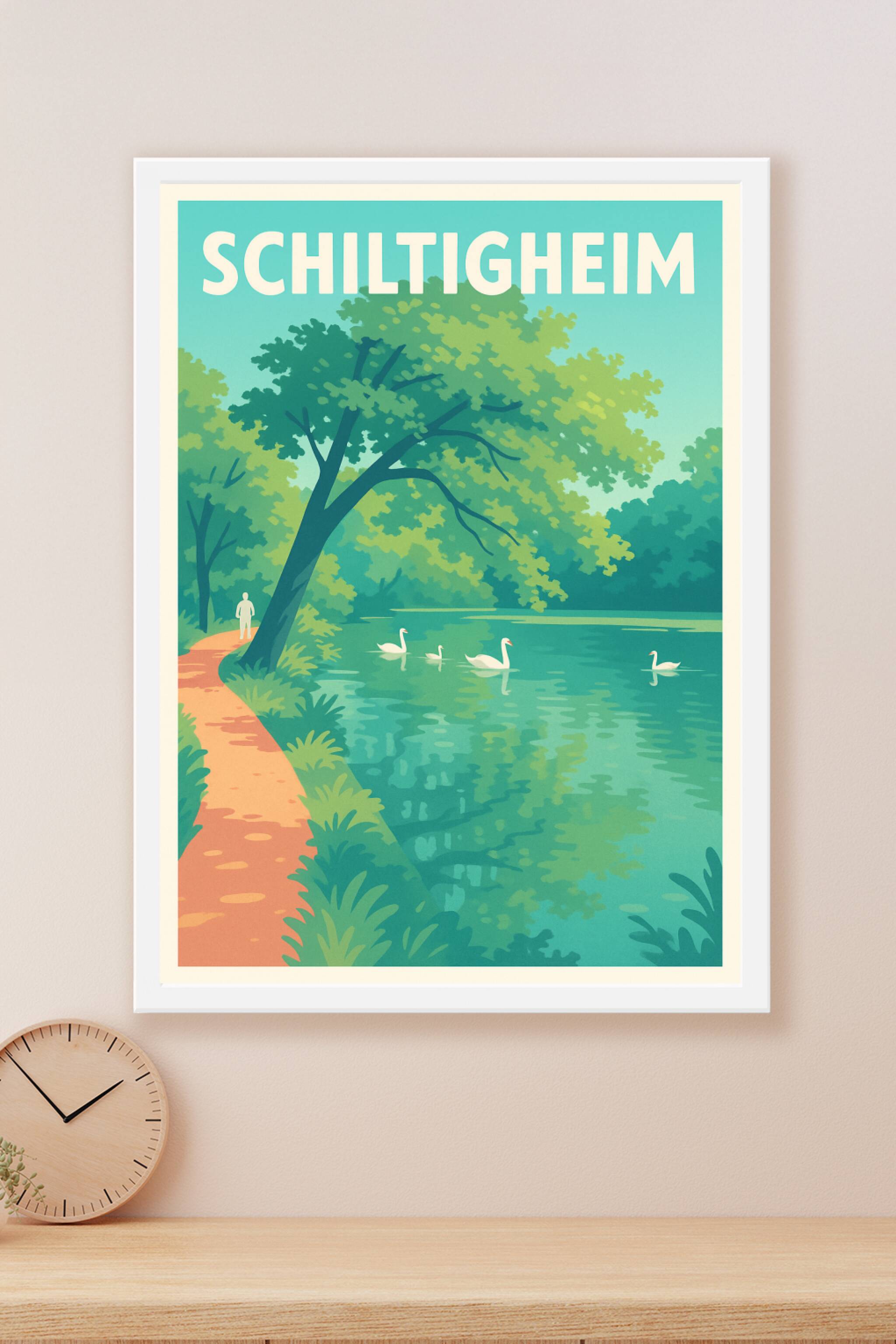 Découvrez l'atmosphère paisible et naturelle de Schiltigheim avec cette affiche élégante représentant un chemin bordé d'arbres et un étang où nagen...