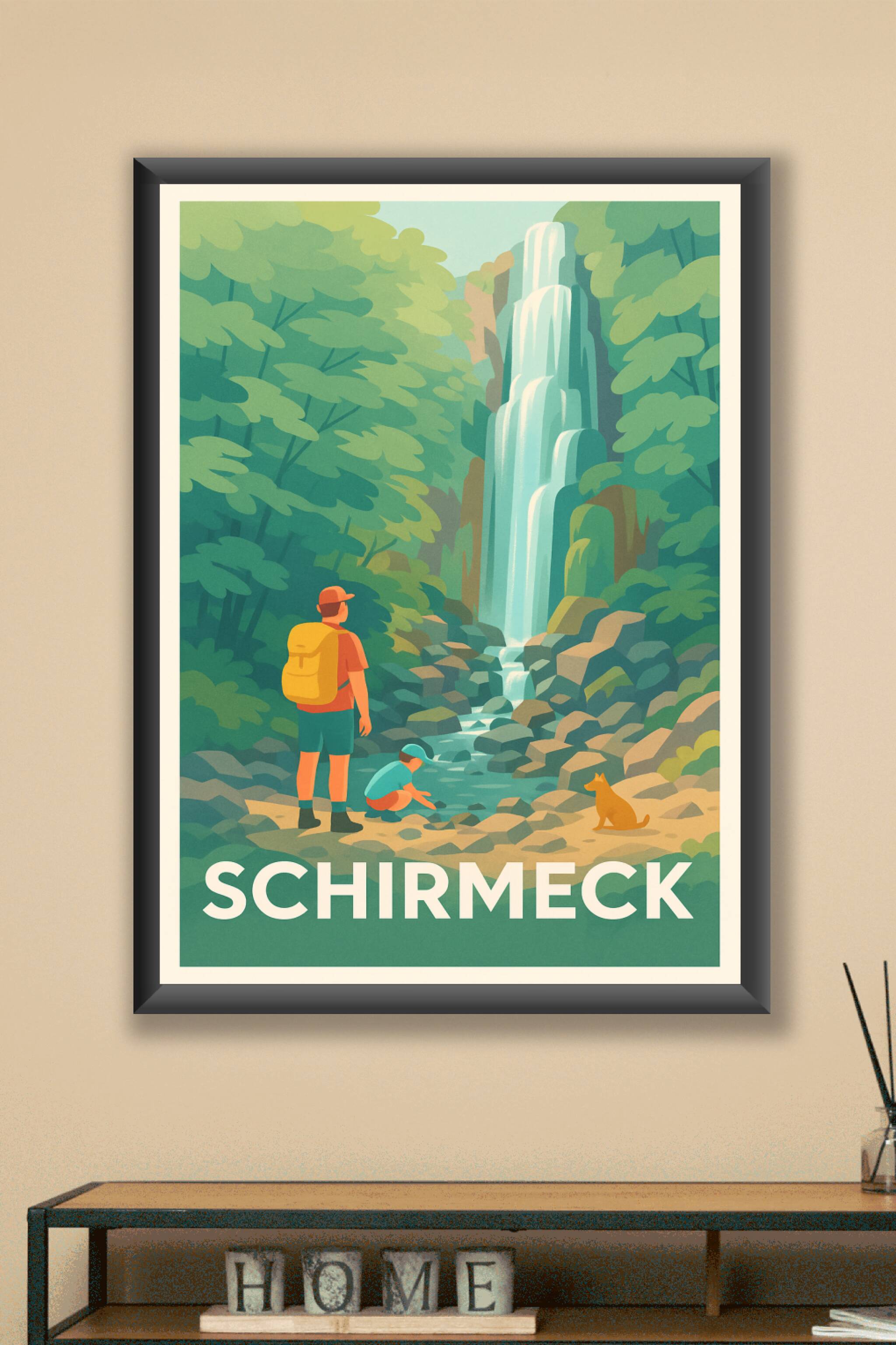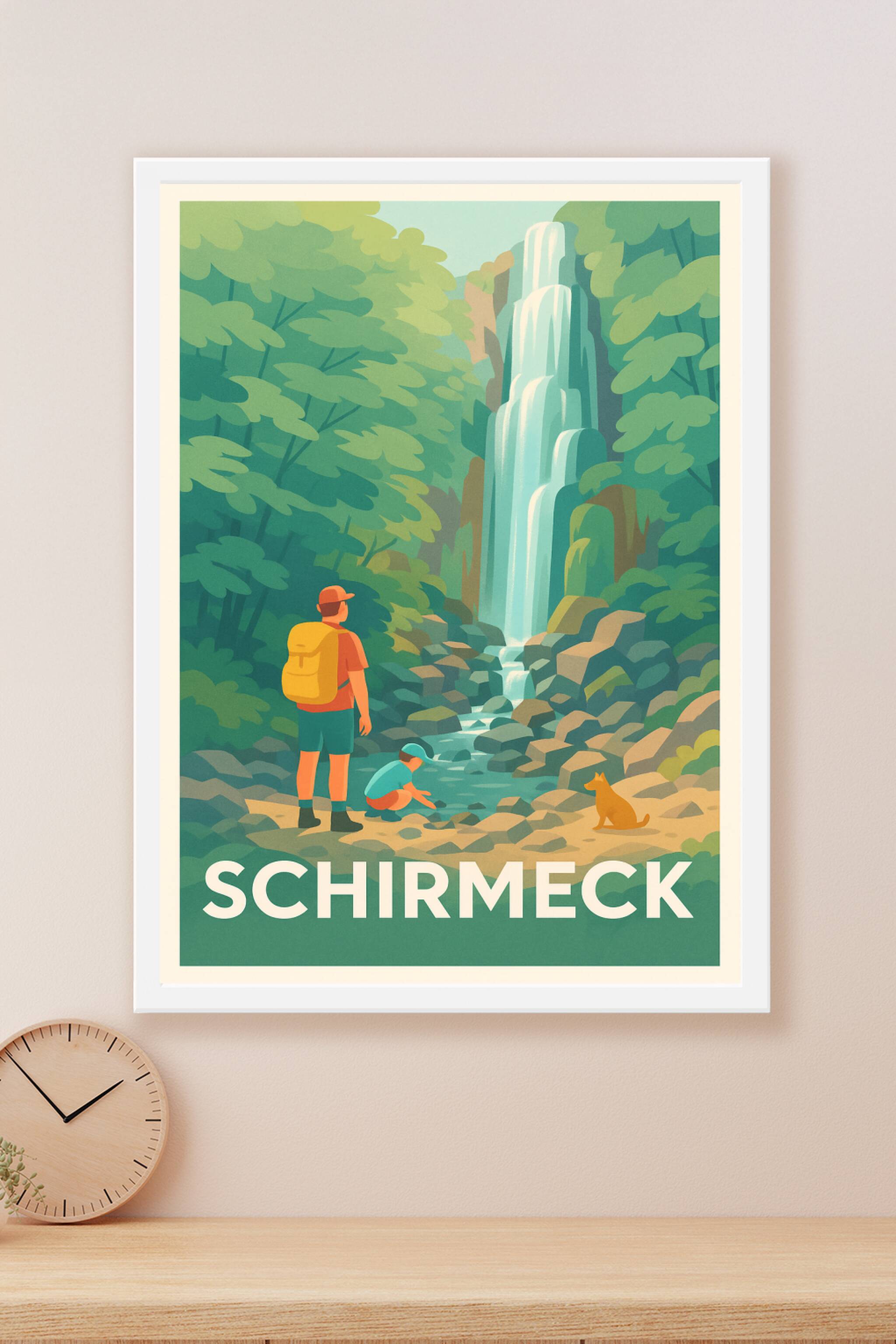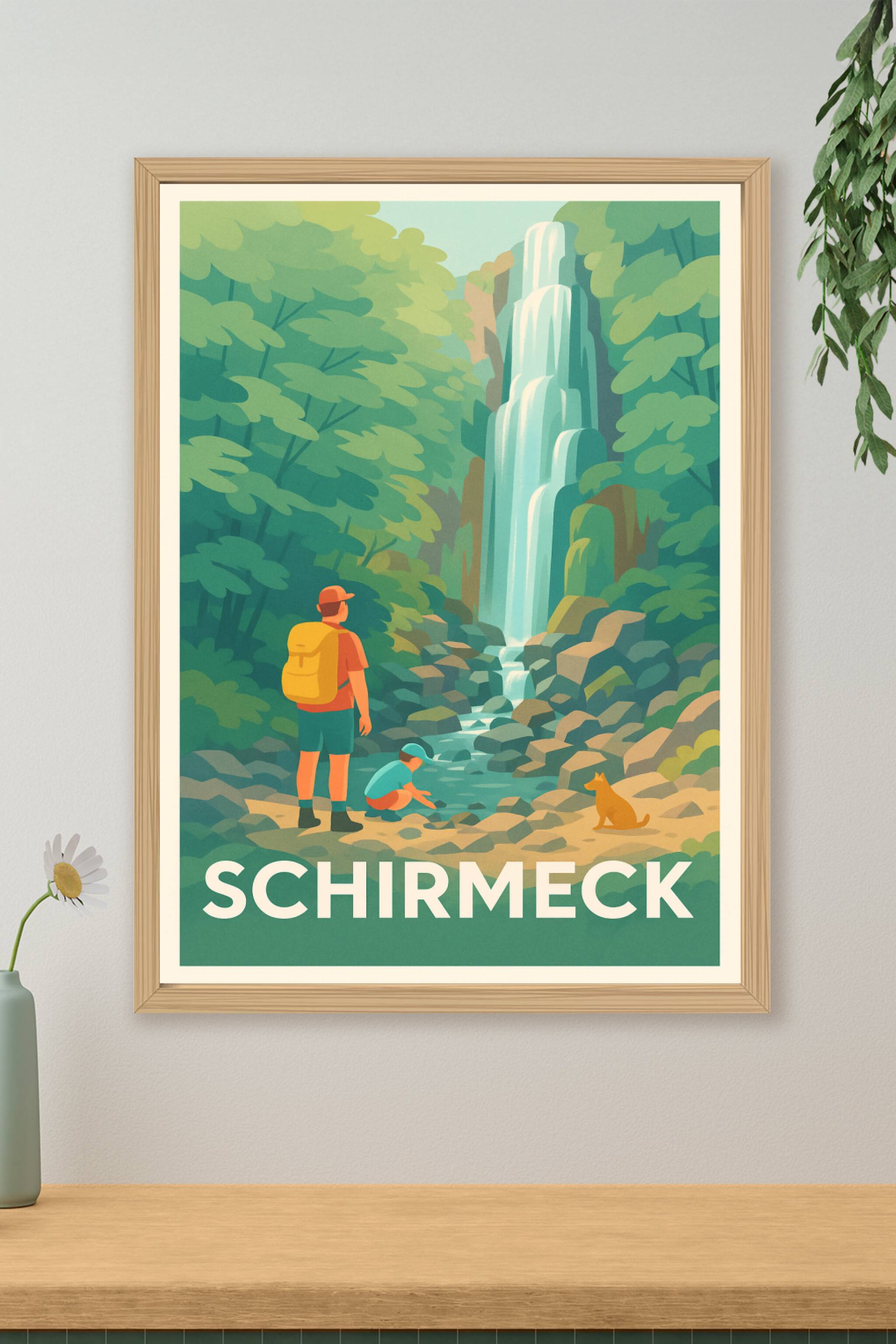 Découvrez la sérénité des paysages verdoyants de Schirmeck avec cette affiche illustrée mettant en scène une cascade majestueuse entourée d'une nat...