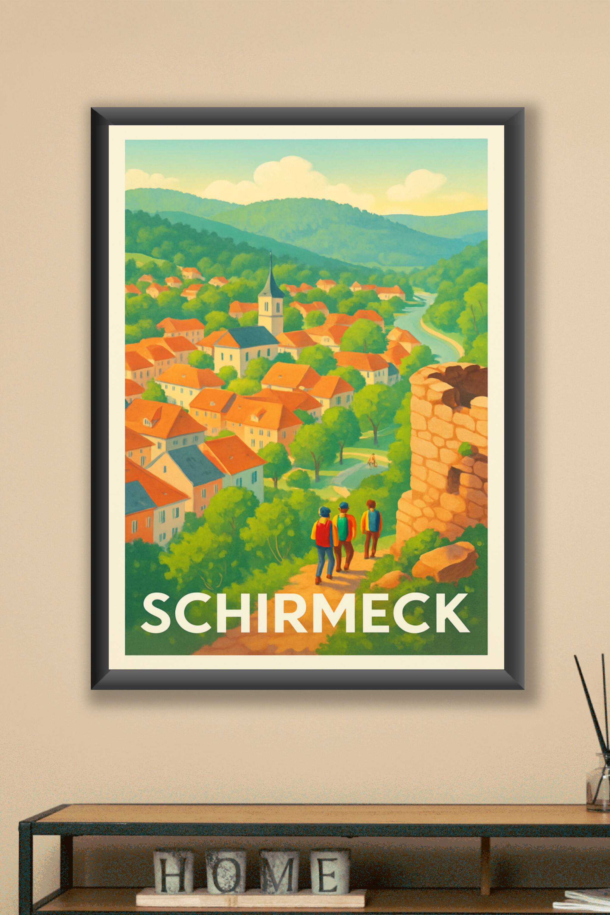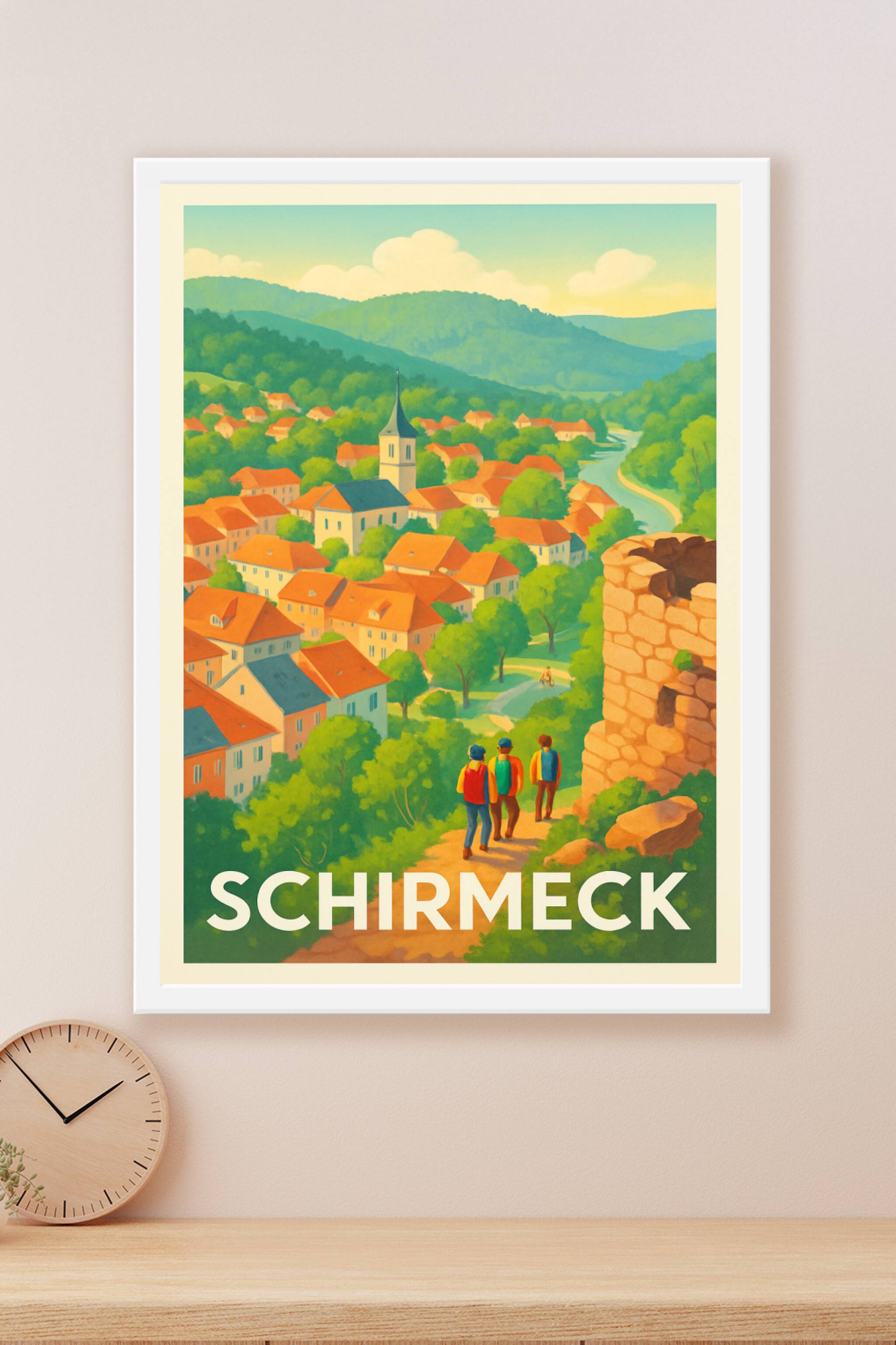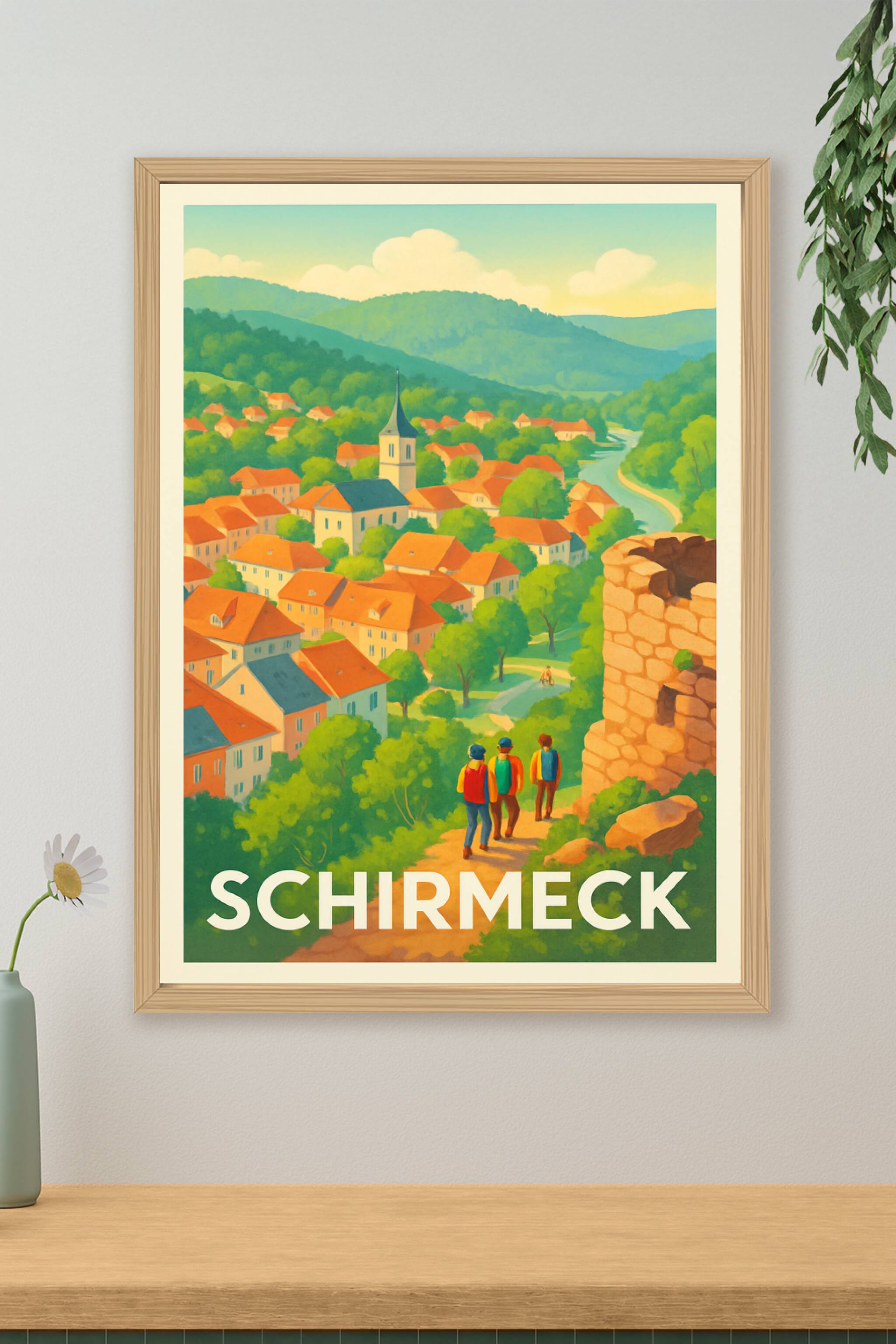 Découvrez la sérénité et le charme bucolique de Schirmeck avec cette affiche illustrée aux couleurs douces et naturelles. L'affiche présente un pan...