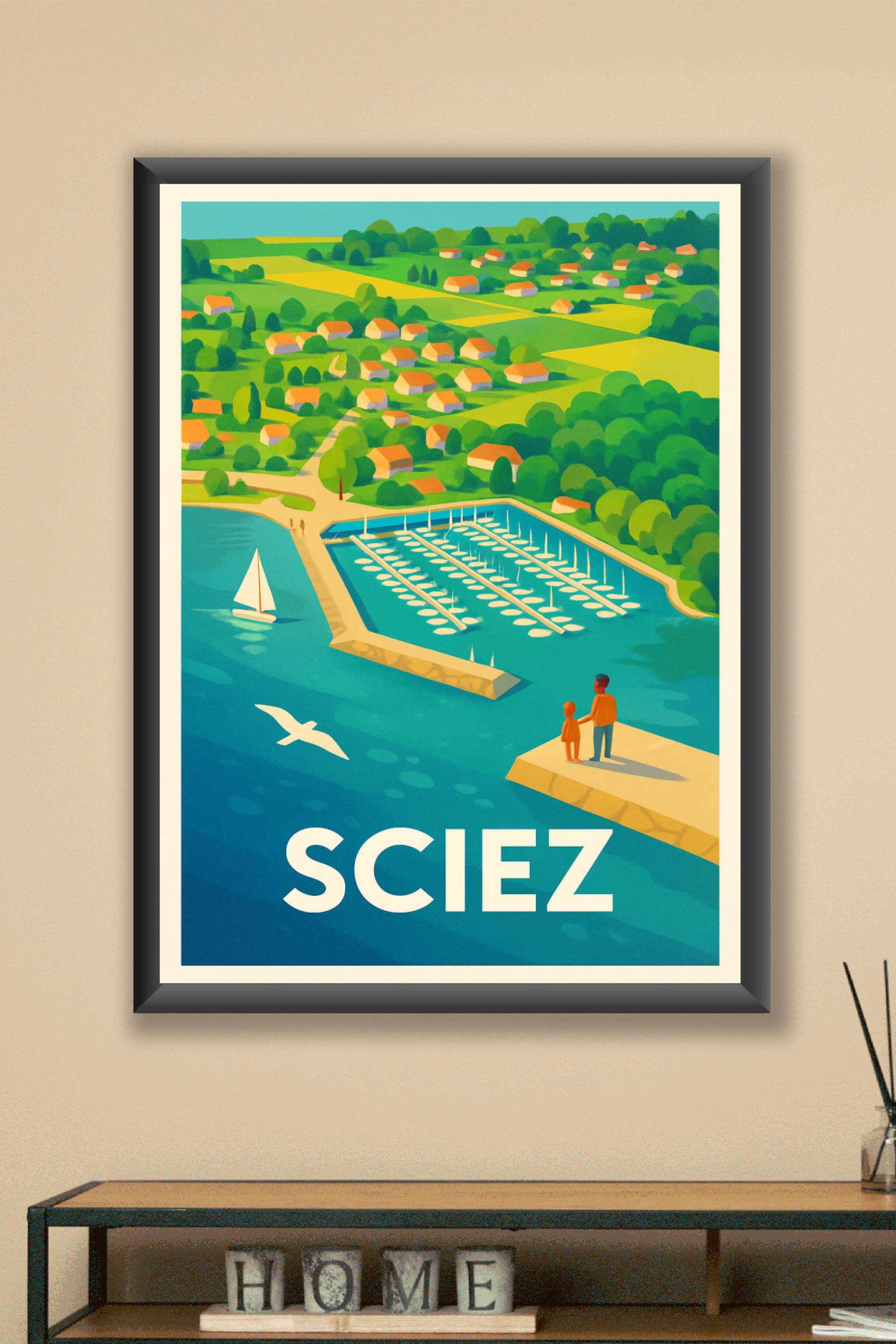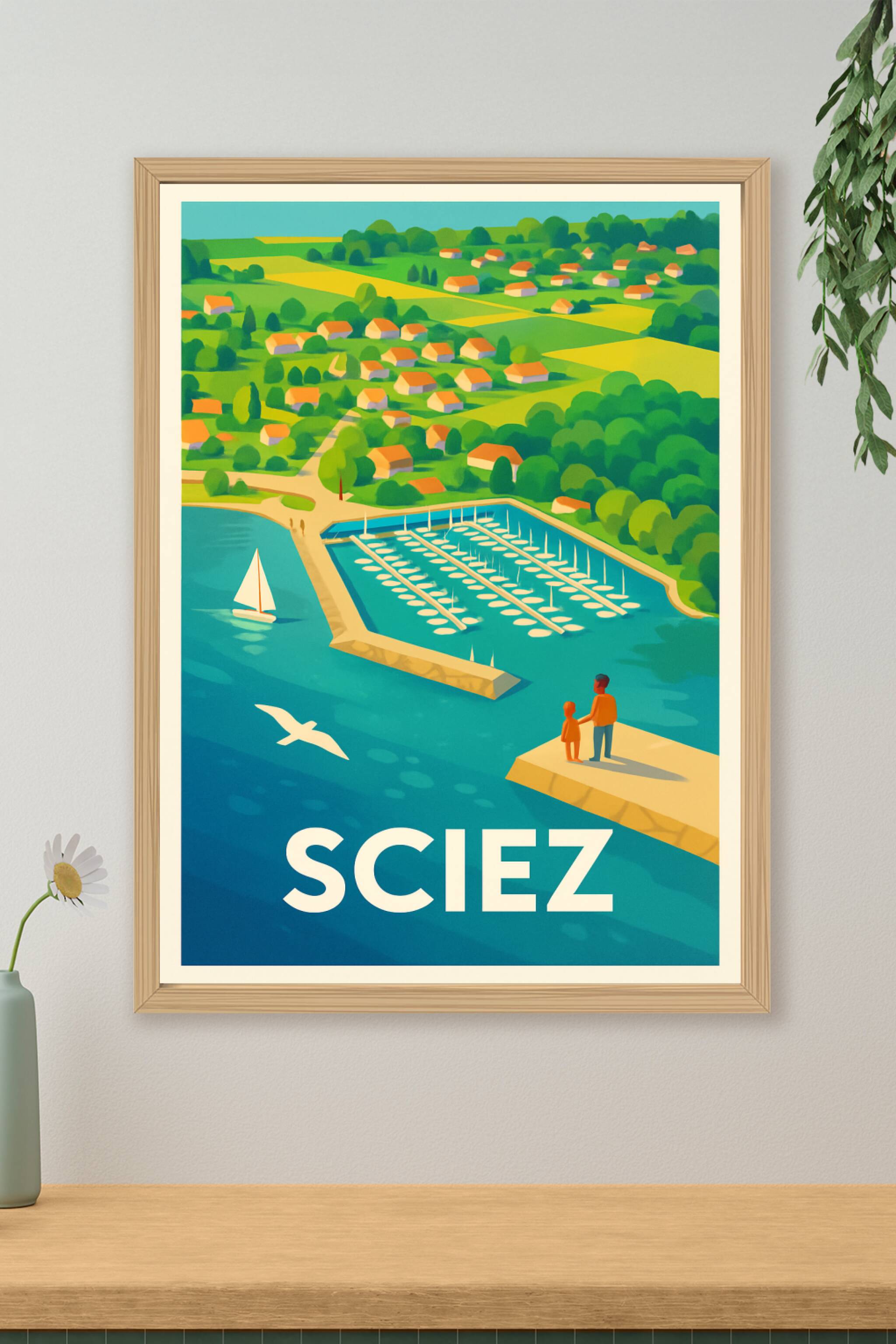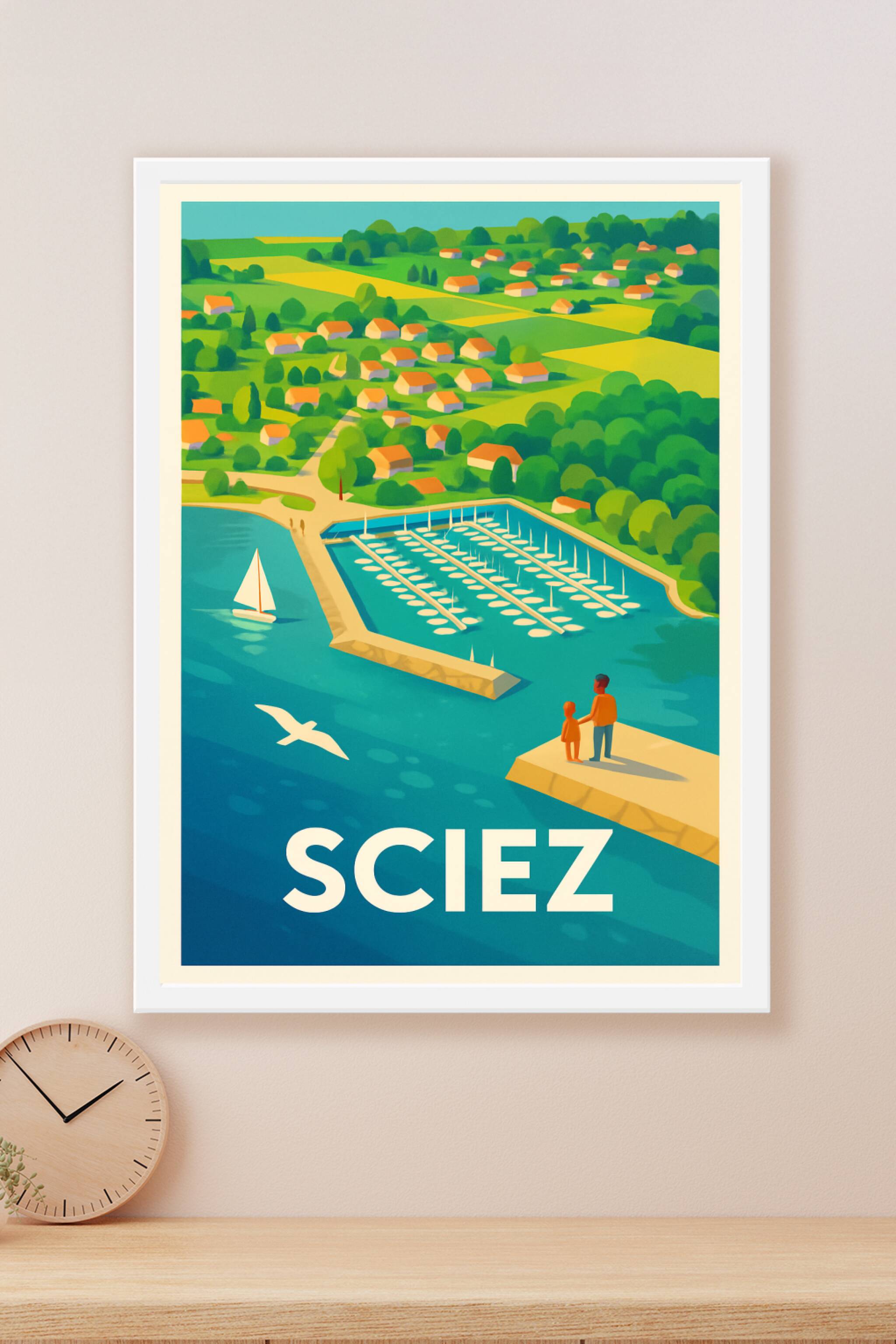 Découvrez la douceur de vivre au bord du lac Léman avec cette affiche illustrée qui capture la marina de Sciez ainsi que les charmantes maisons dis...