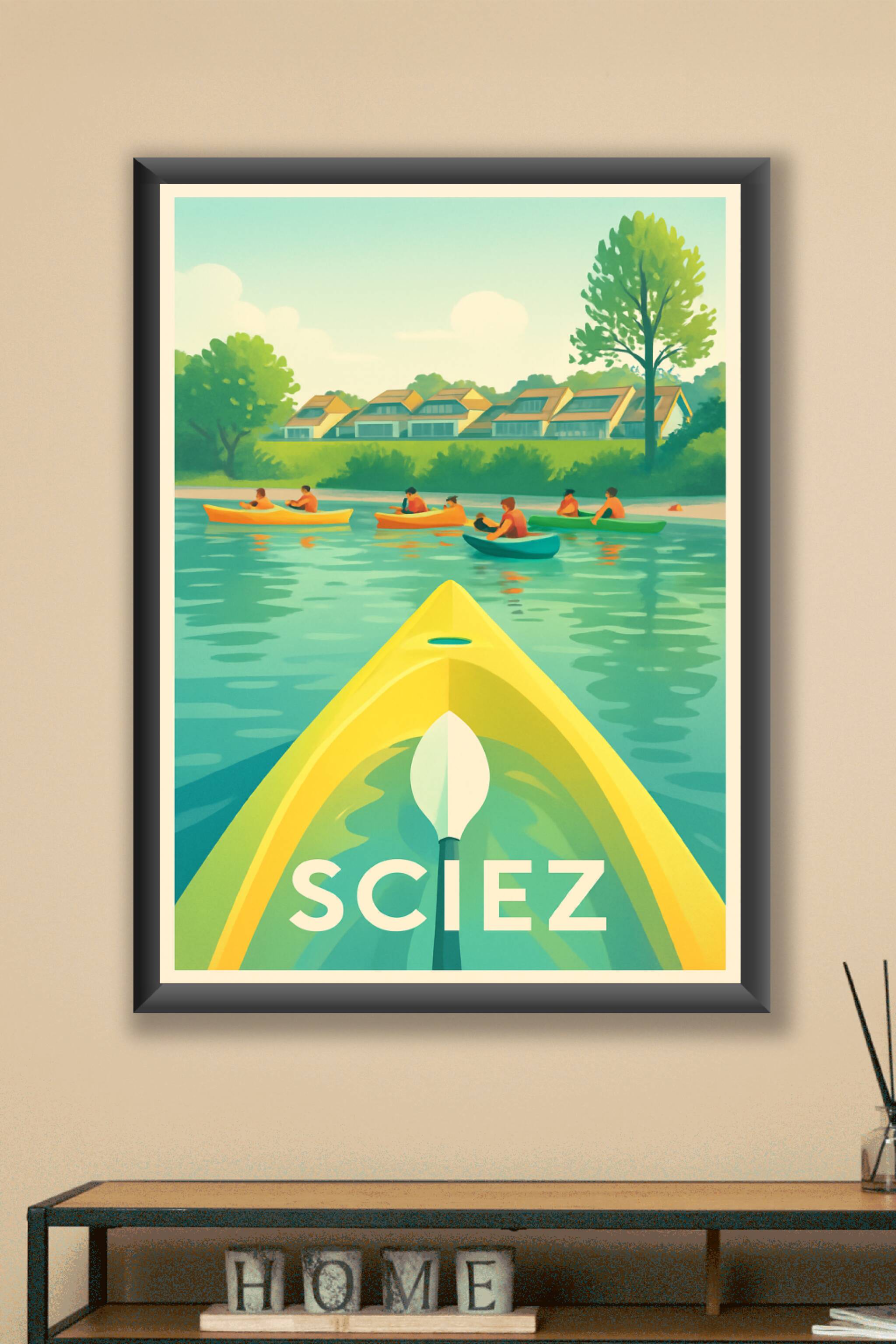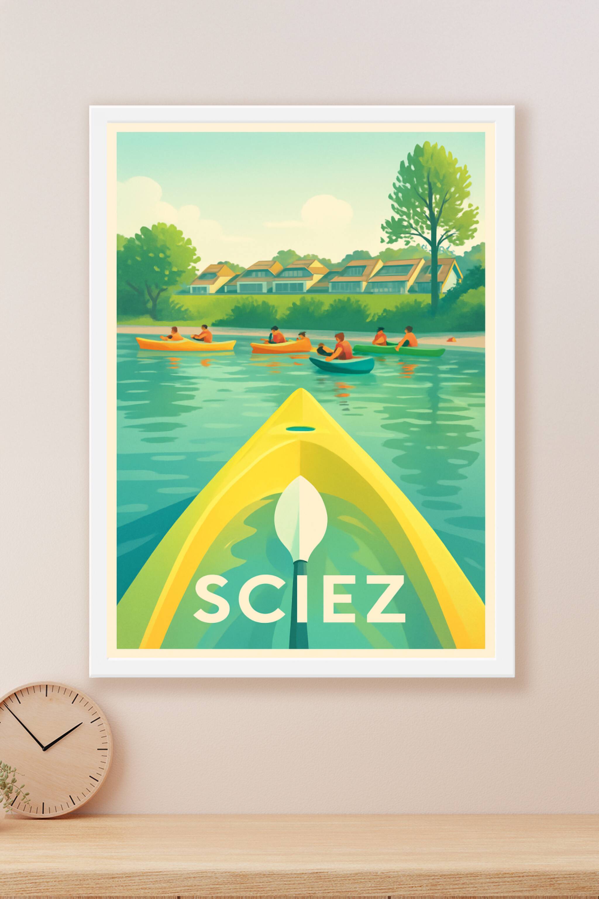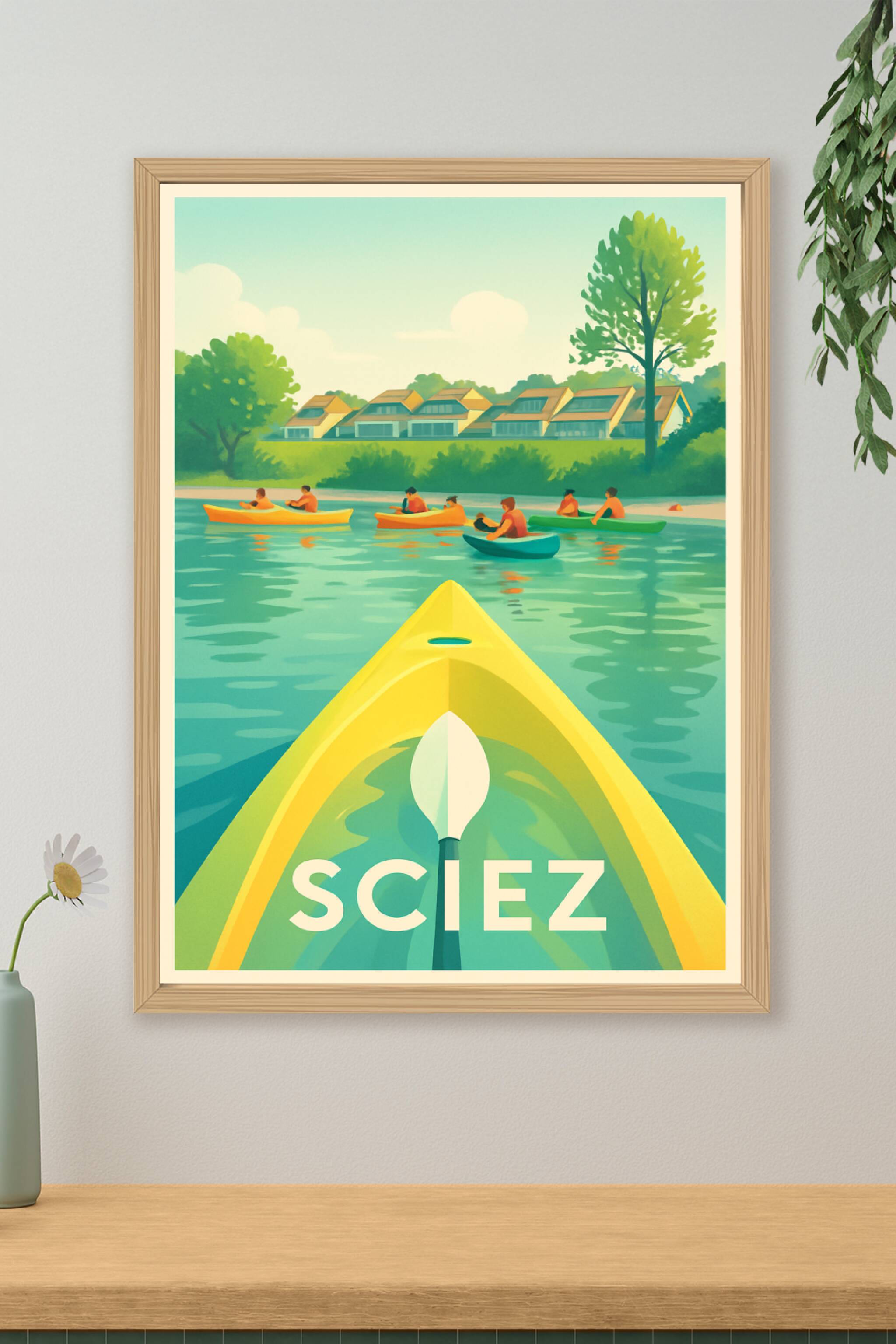 Découvrez la quiétude des bords du Léman avec cette affiche illustrée qui met en scène une journée paisible en kayak à Sciez. L'harmonie des couleu...