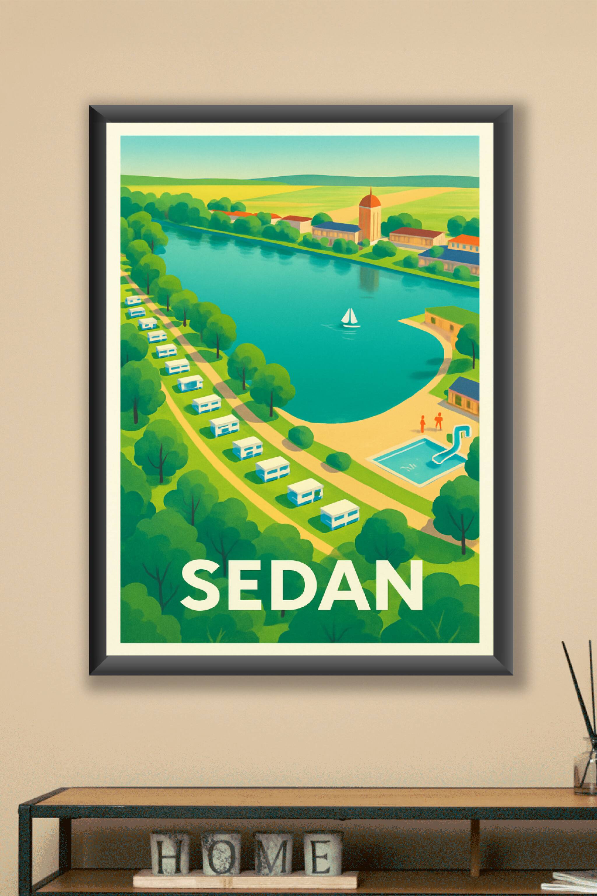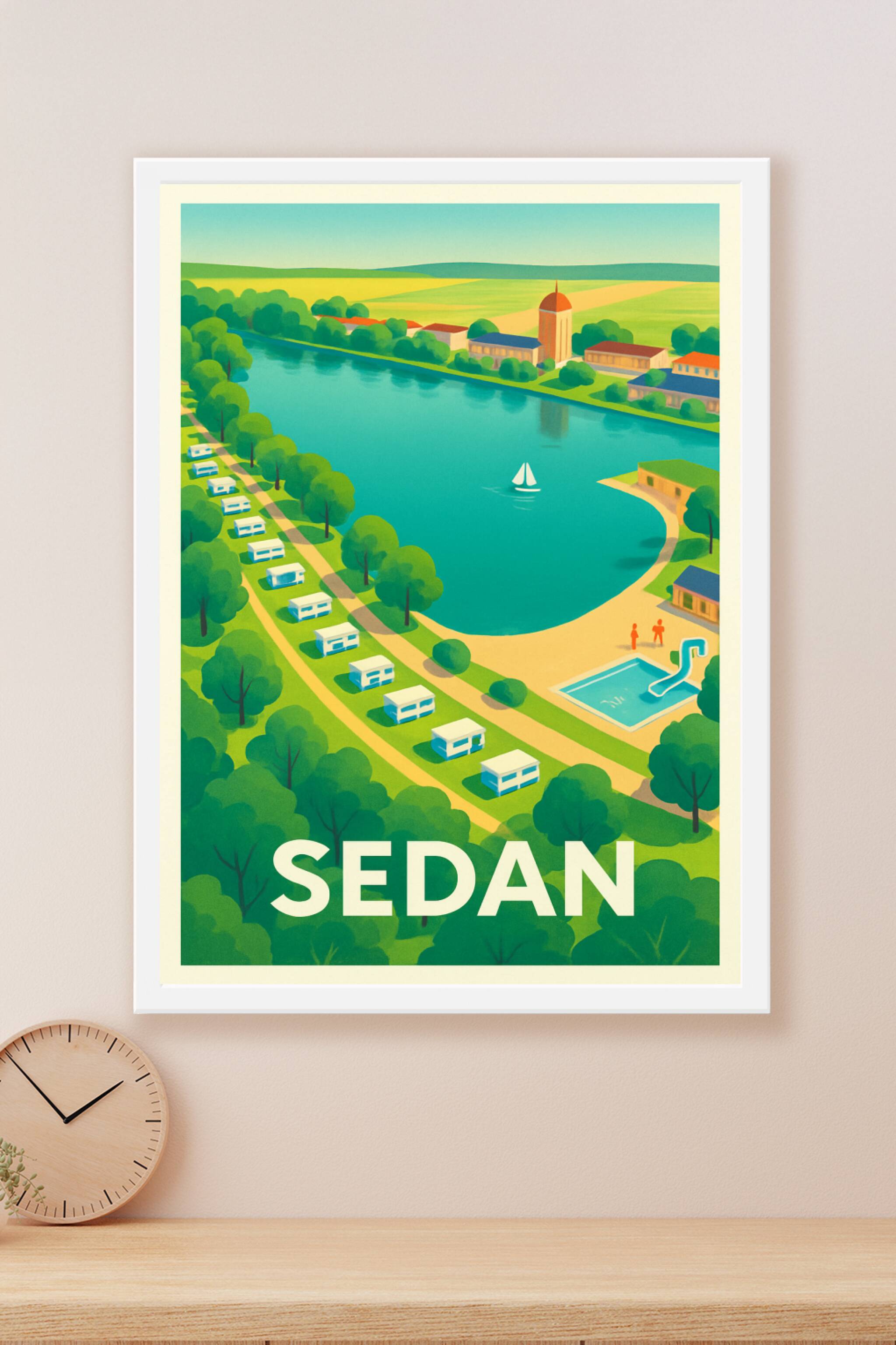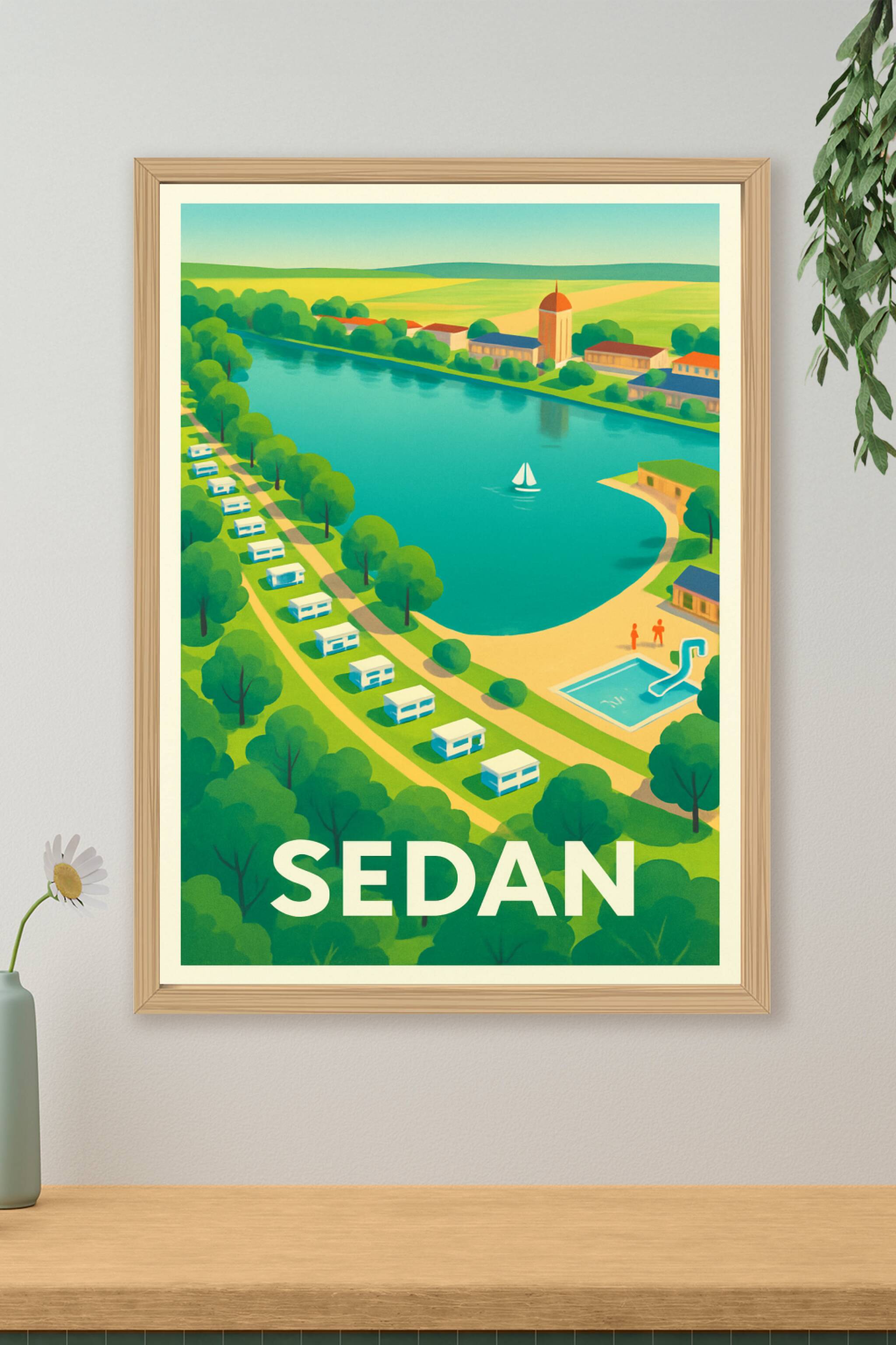Découvrez la douceur de vivre de Sedan avec cette affiche illustrée aux couleurs vives et harmonieuses, qui capture un paysage paisible où rivière,...