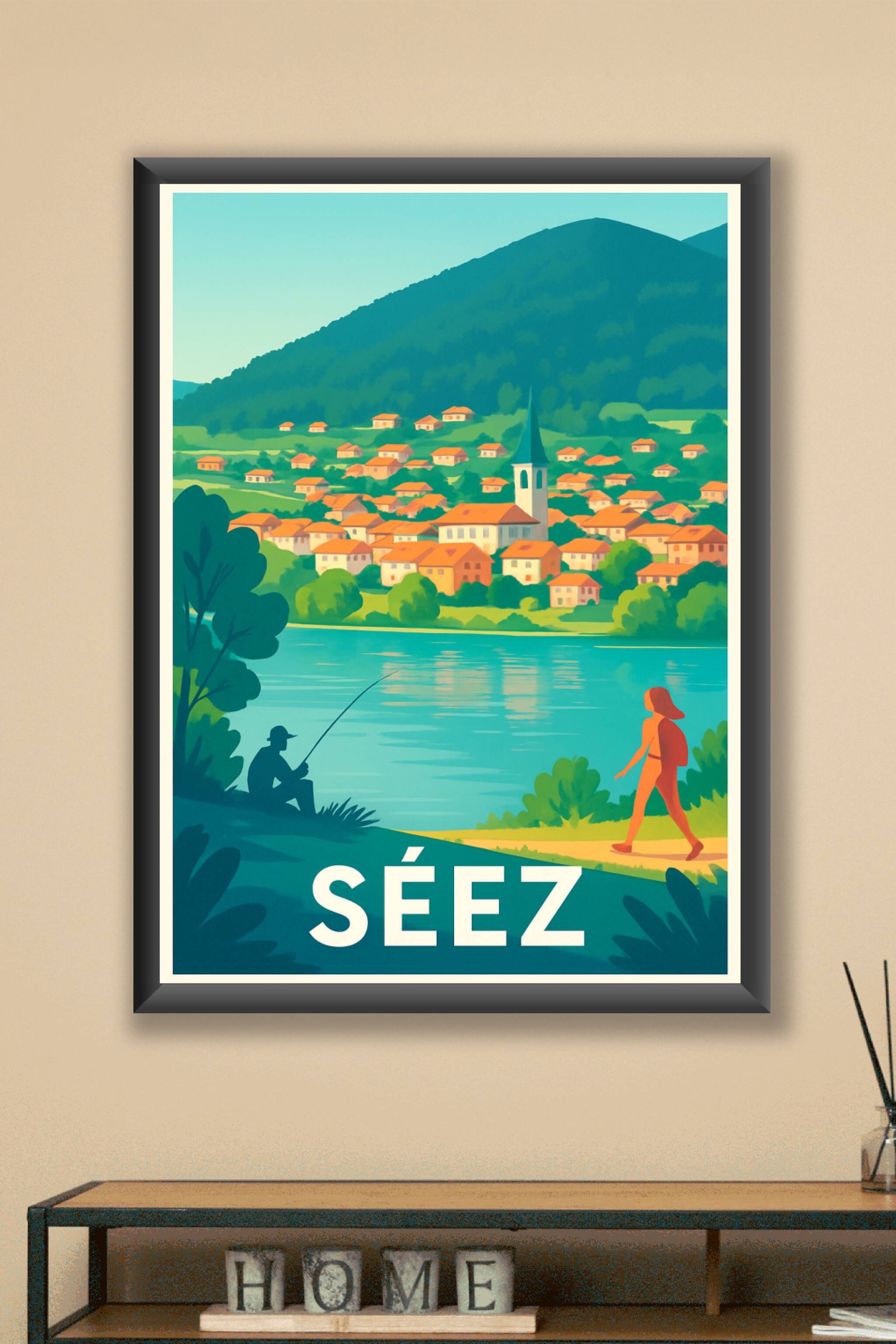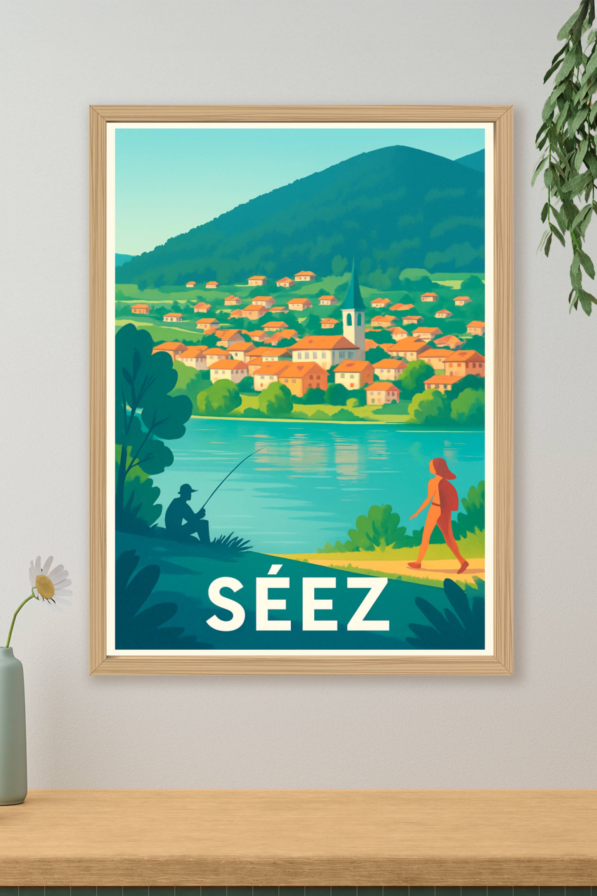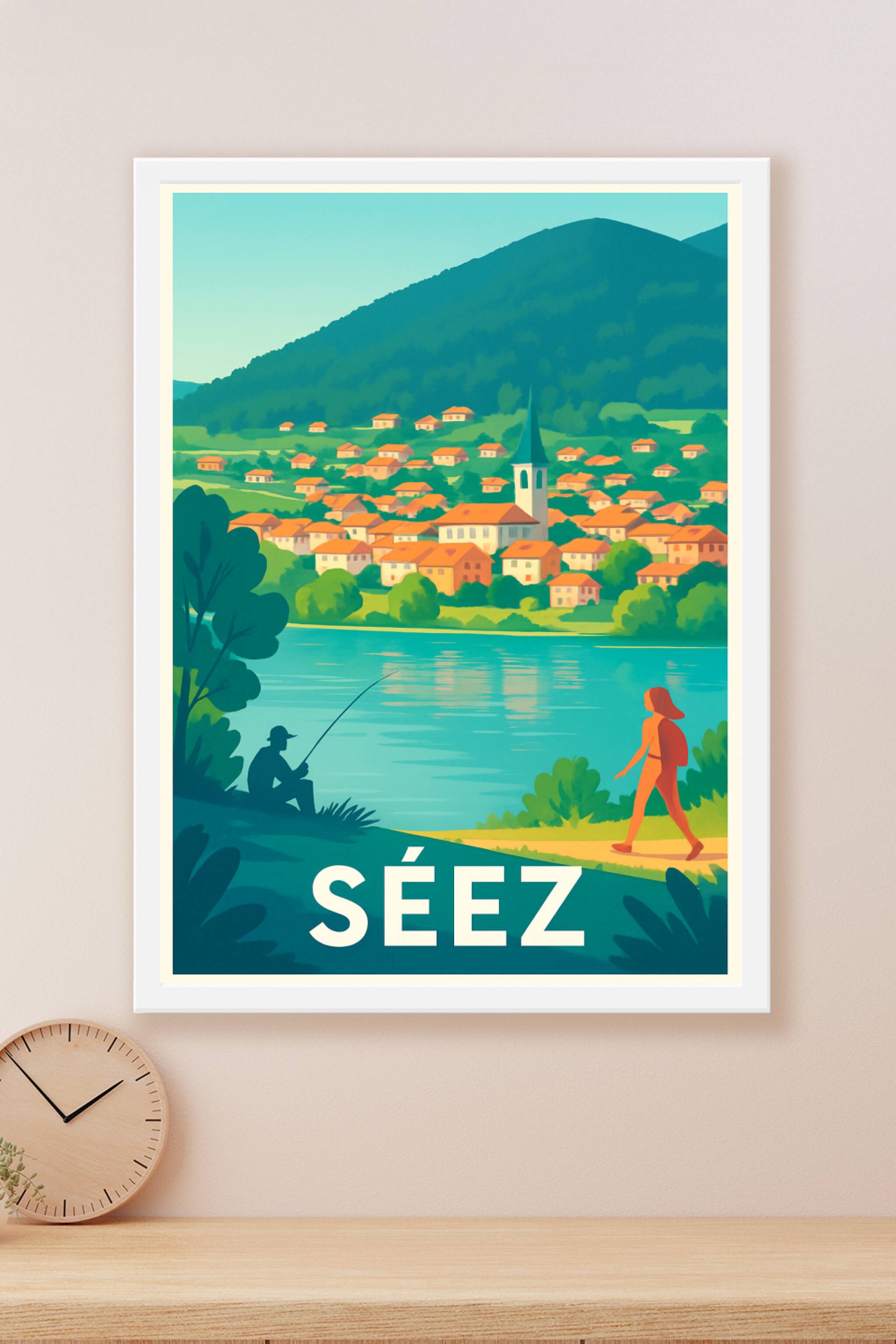 Découvrez la douceur de vivre au cœur des Alpes avec cette affiche illustrée mettant en scène le village pittoresque de Séez, niché au bord d'une r...
