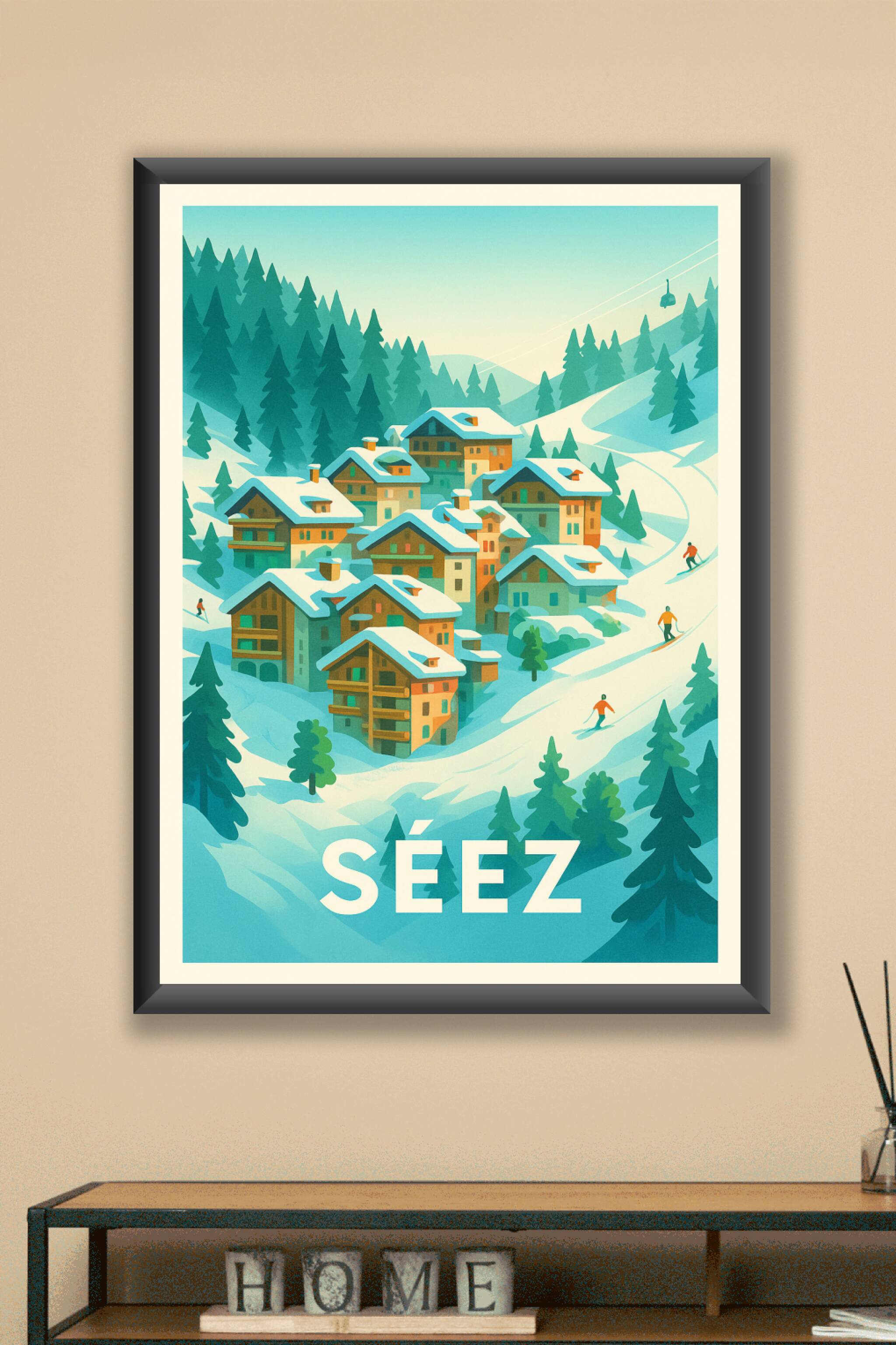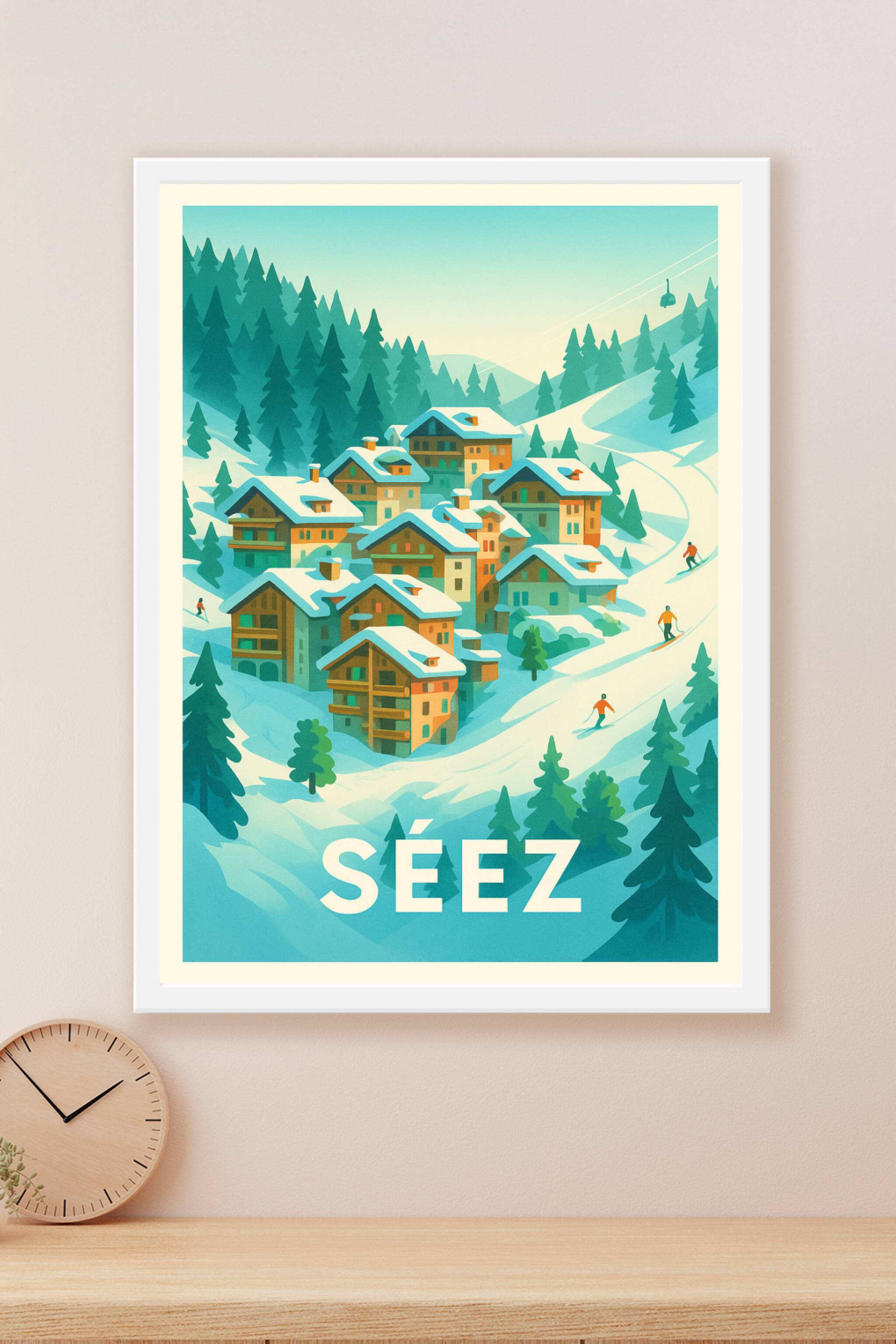 Découvrez l'atmosphère paisible et enneigée de Séez avec cette affiche illustrée qui capture à merveille le charme d'un village alpin niché entre f...
