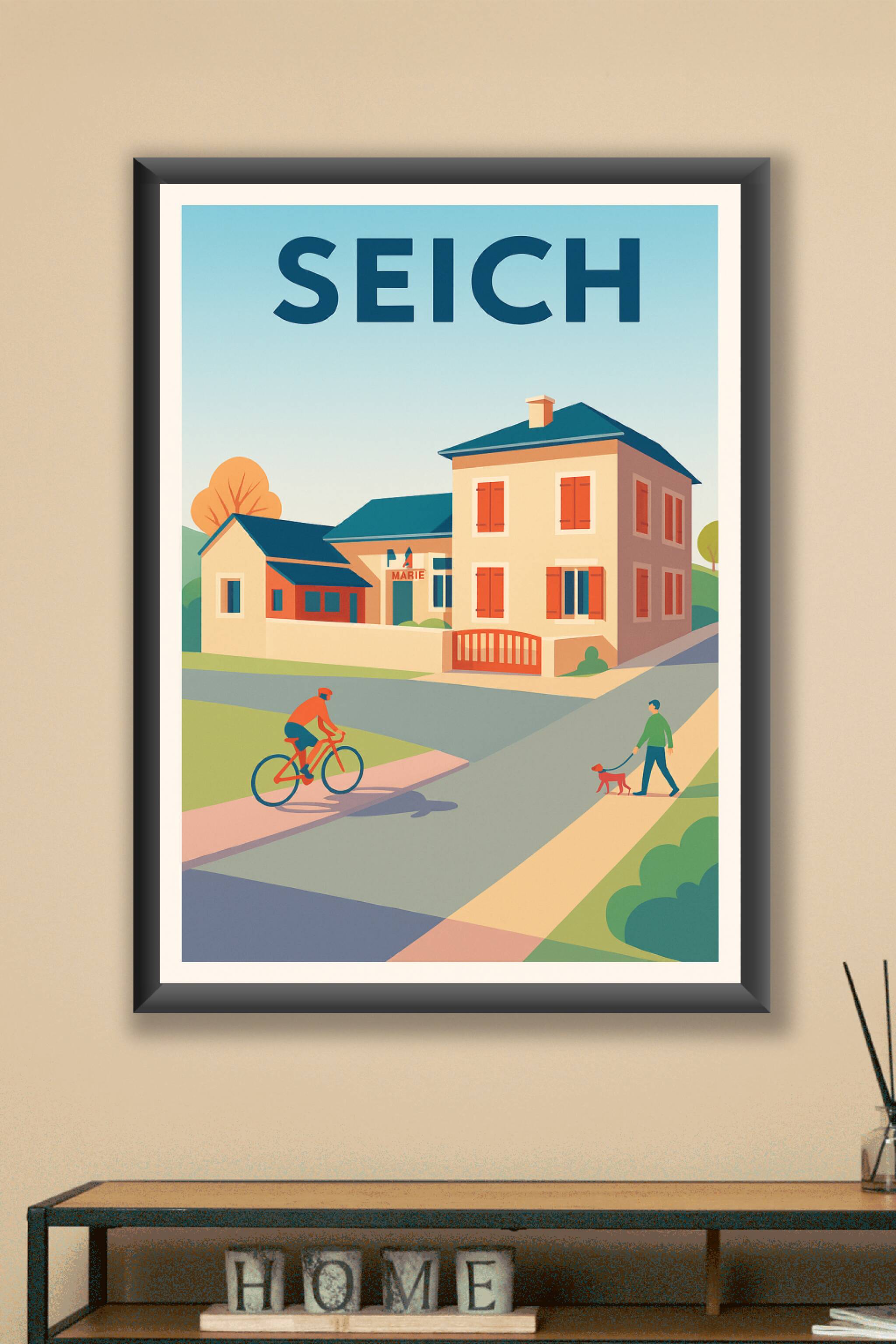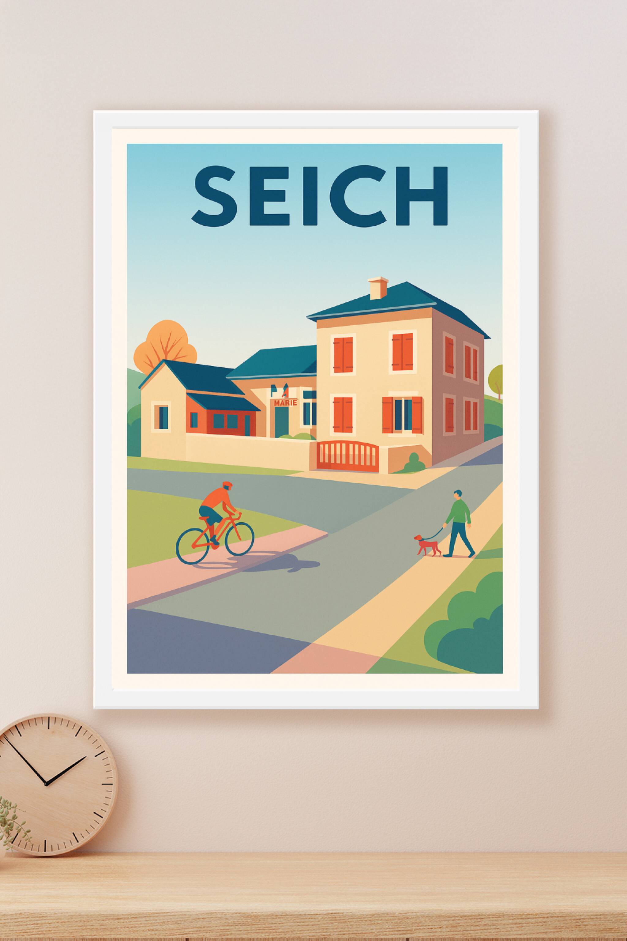 Découvrez cette affiche illustrée qui capture la tranquillité et la douceur de vivre du village de Seich. Avec son style épuré et ses couleurs chal...
