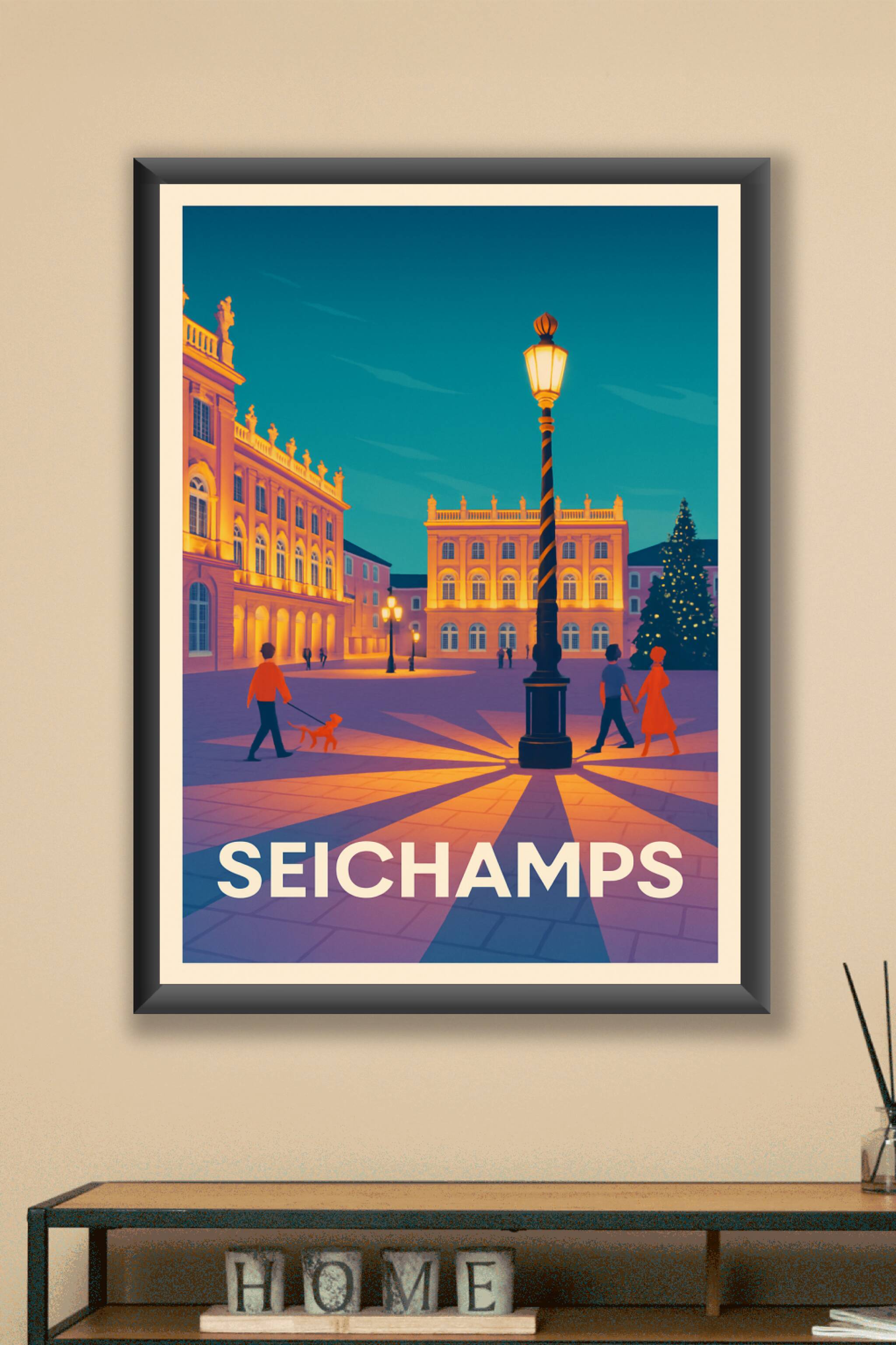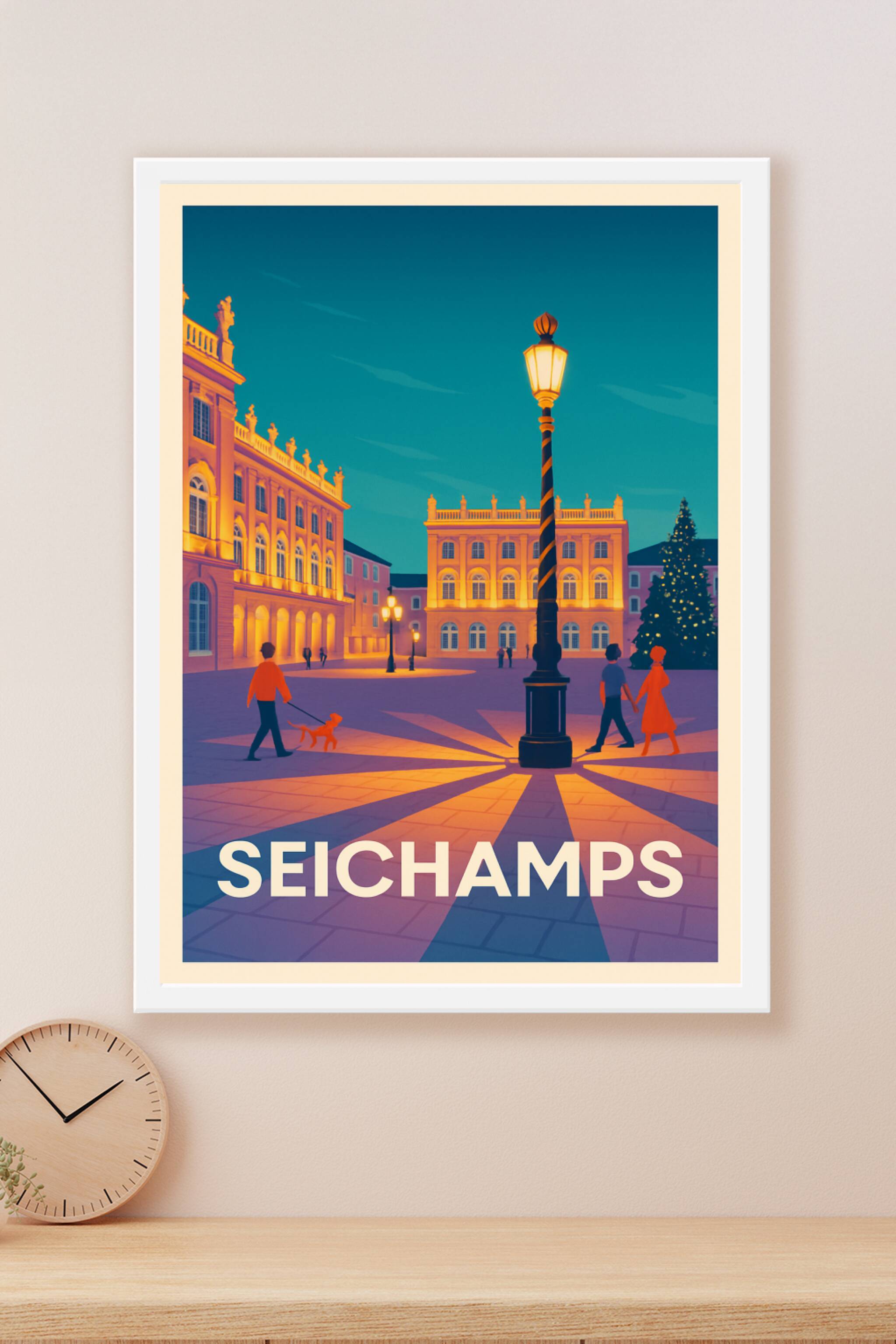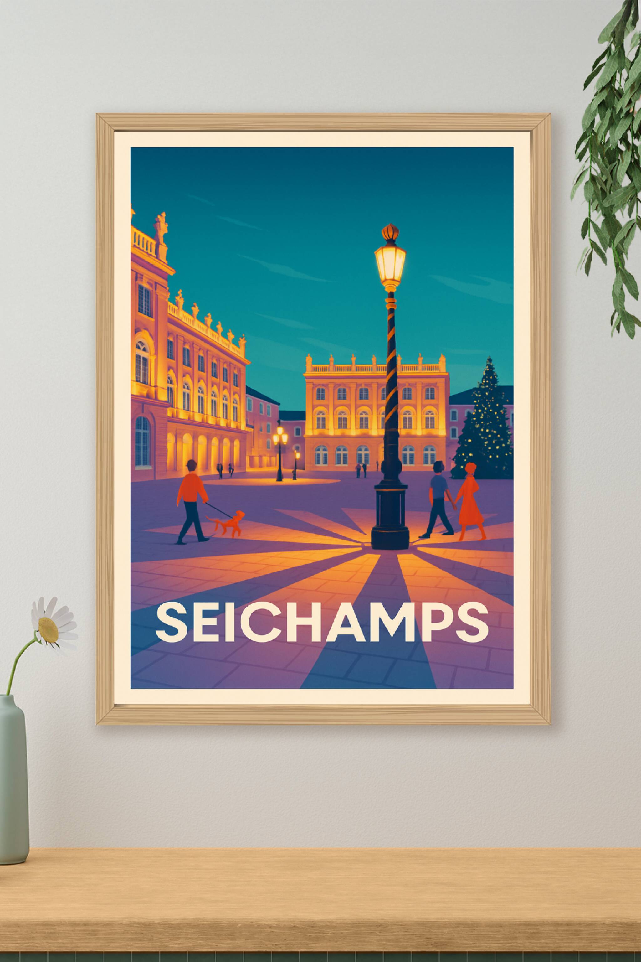 Découvrez l'élégance nocturne de Seichamps avec cette affiche au style rétro, mettant en lumière une place bordée de bâtiments lumineux et une atmo...