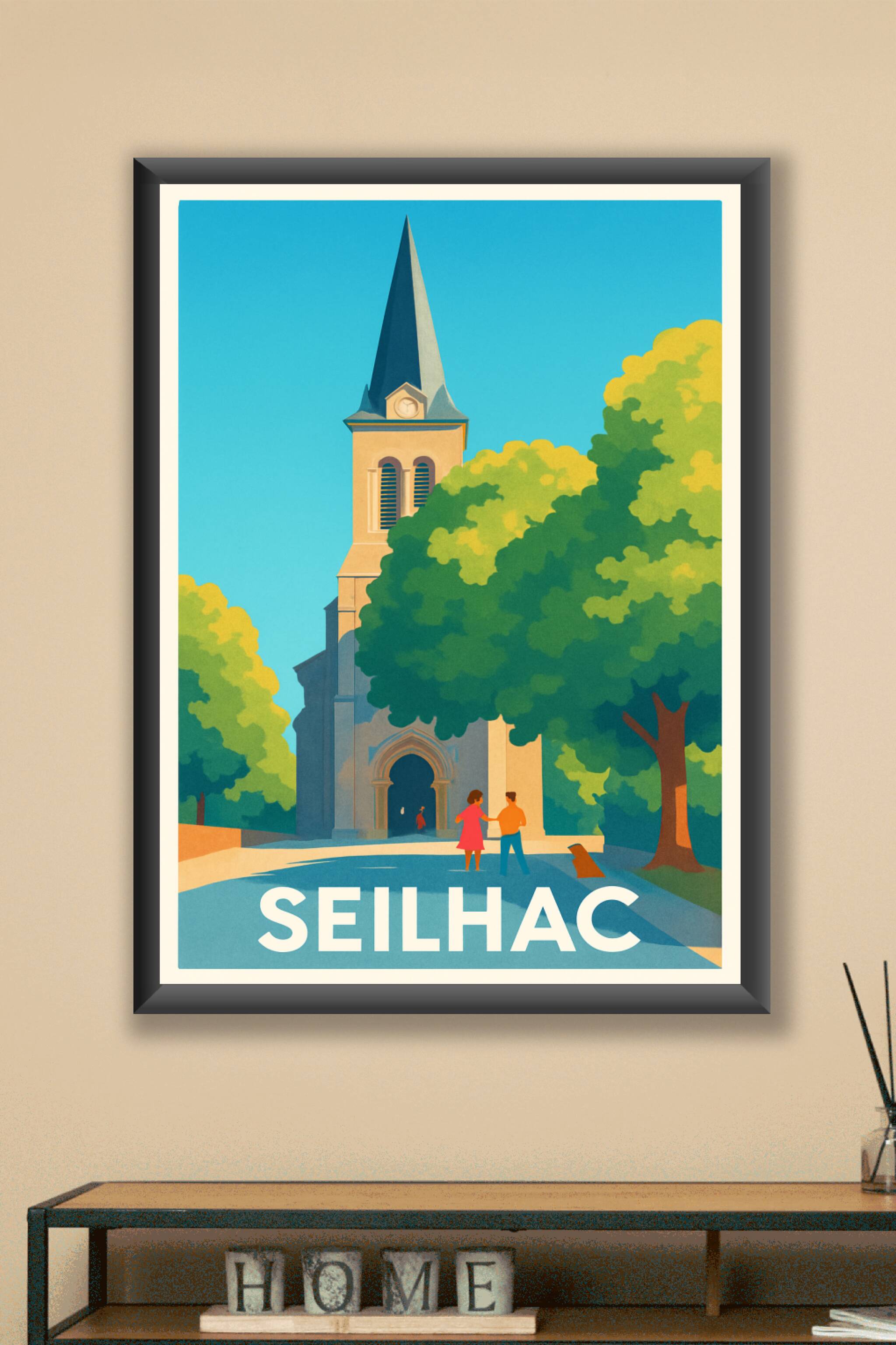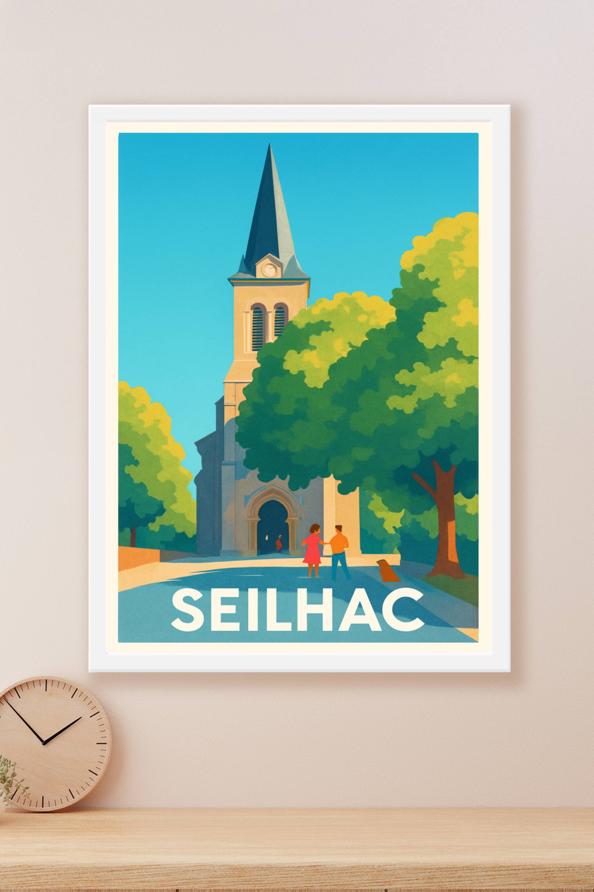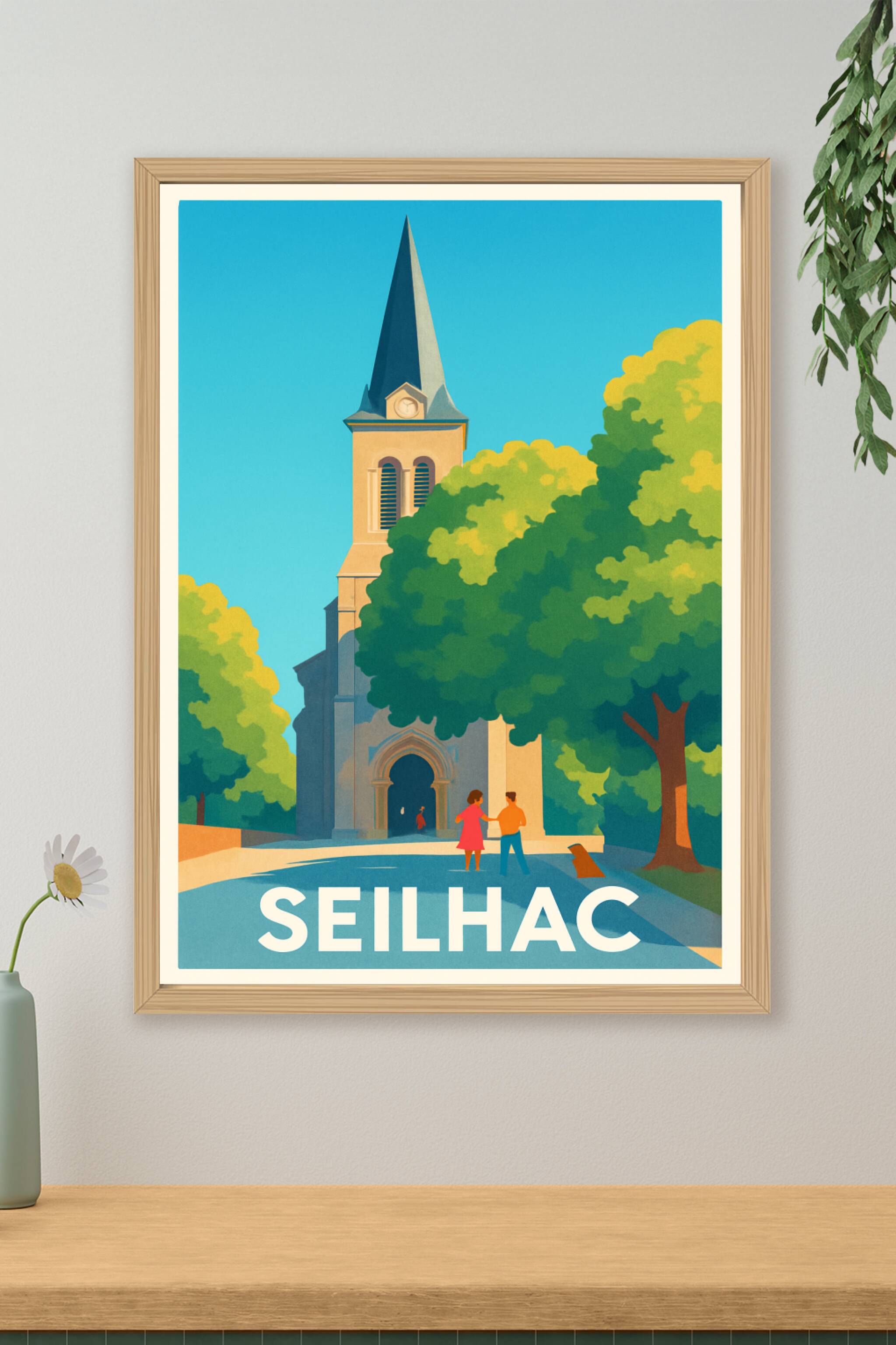 Découvrez l'élégance paisible de Seilhac avec cette superbe affiche illustrée mettant en avant son architecture intemporelle et ses espaces verdoya...