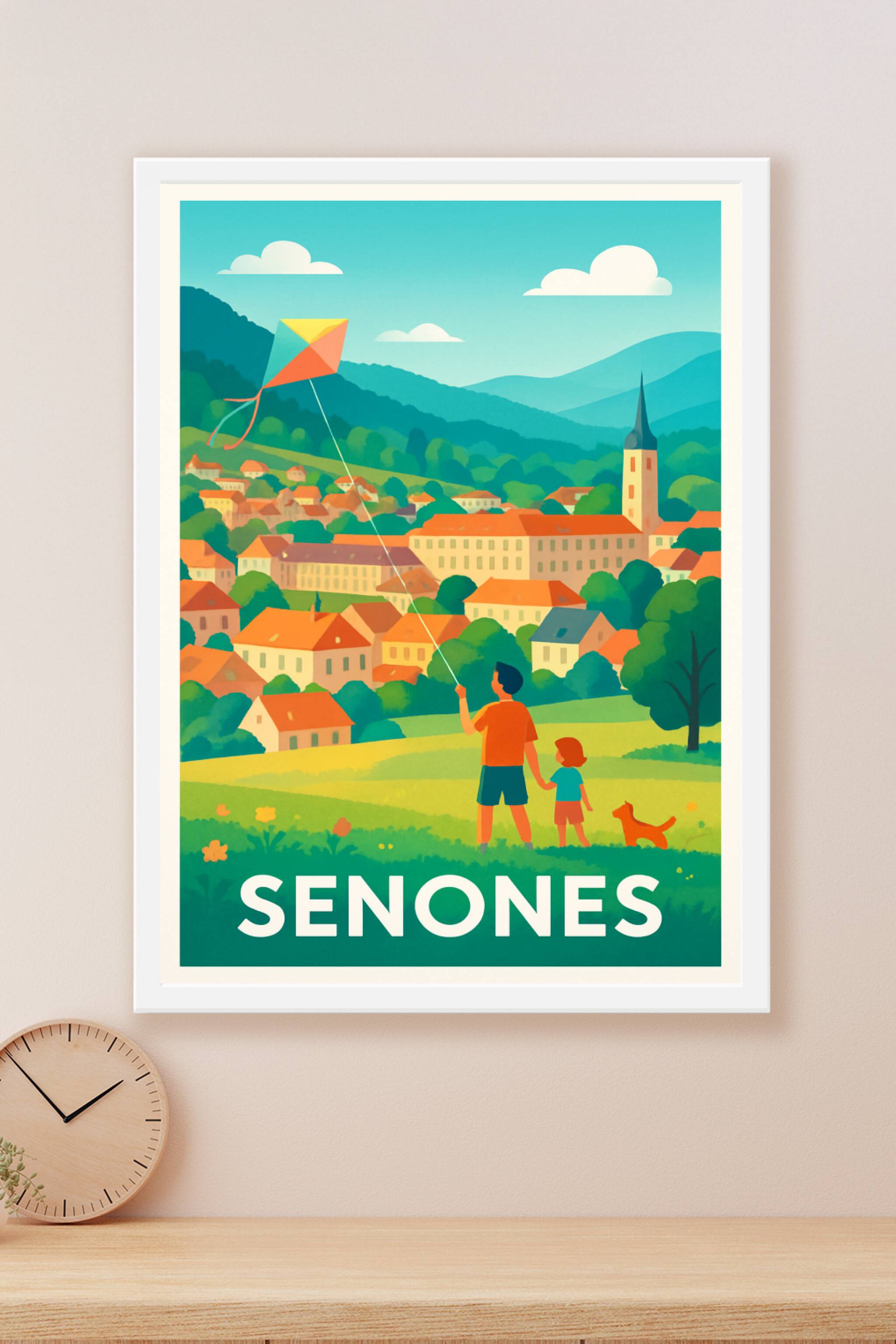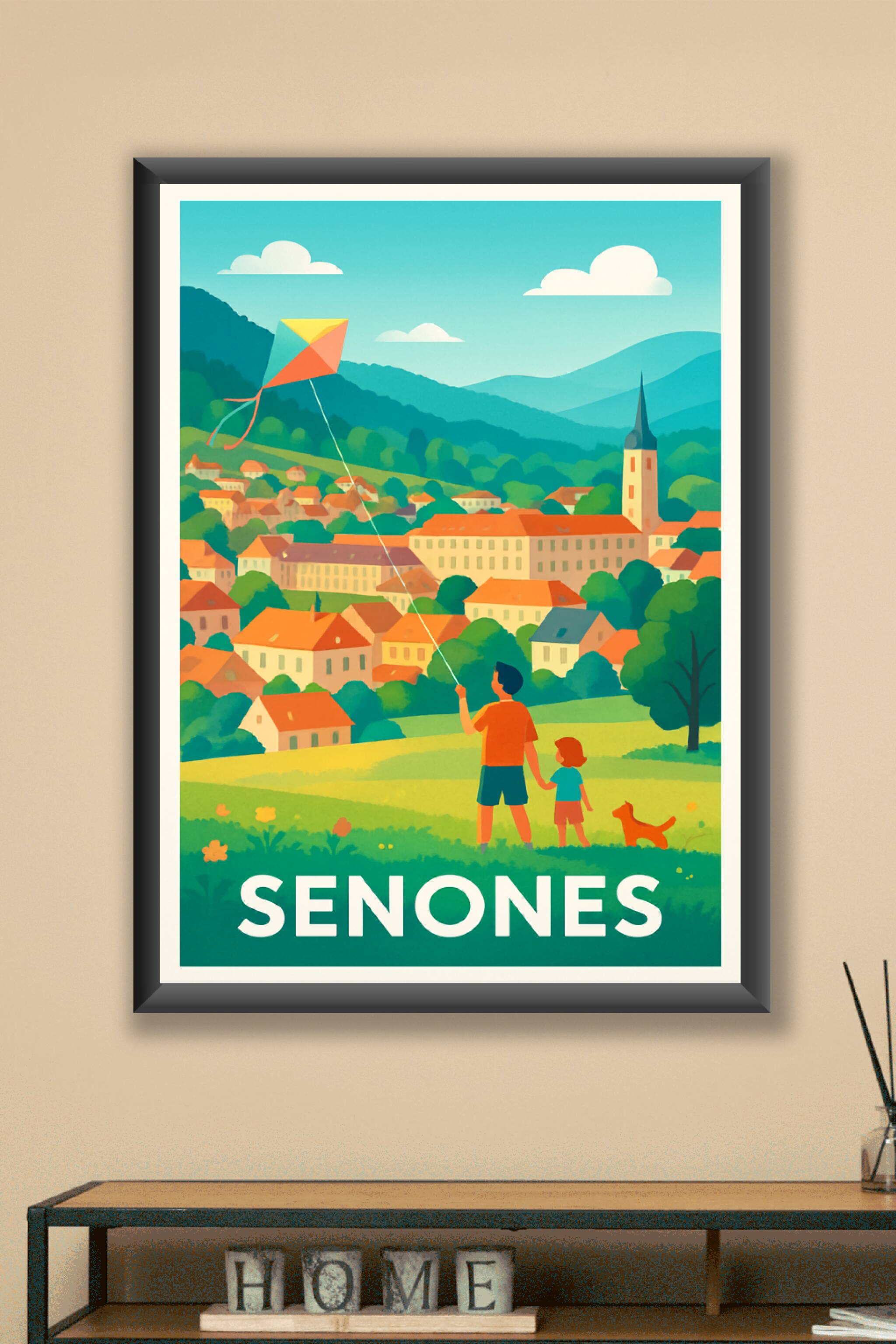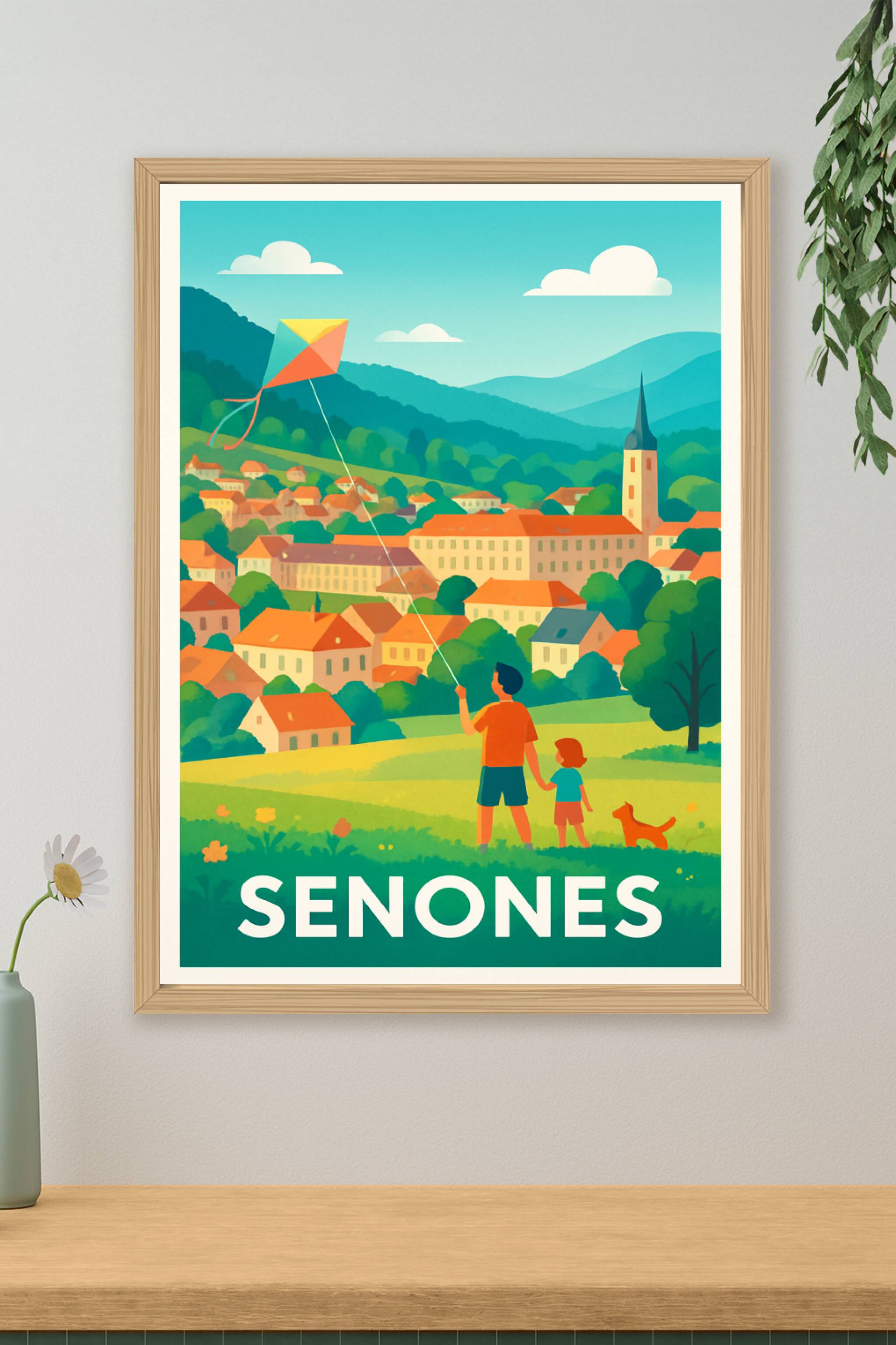 Découvrez la sérénité de Senones à travers cette affiche illustrée aux couleurs douces et harmonieuses. L’image met en scène un paysage villageois ...