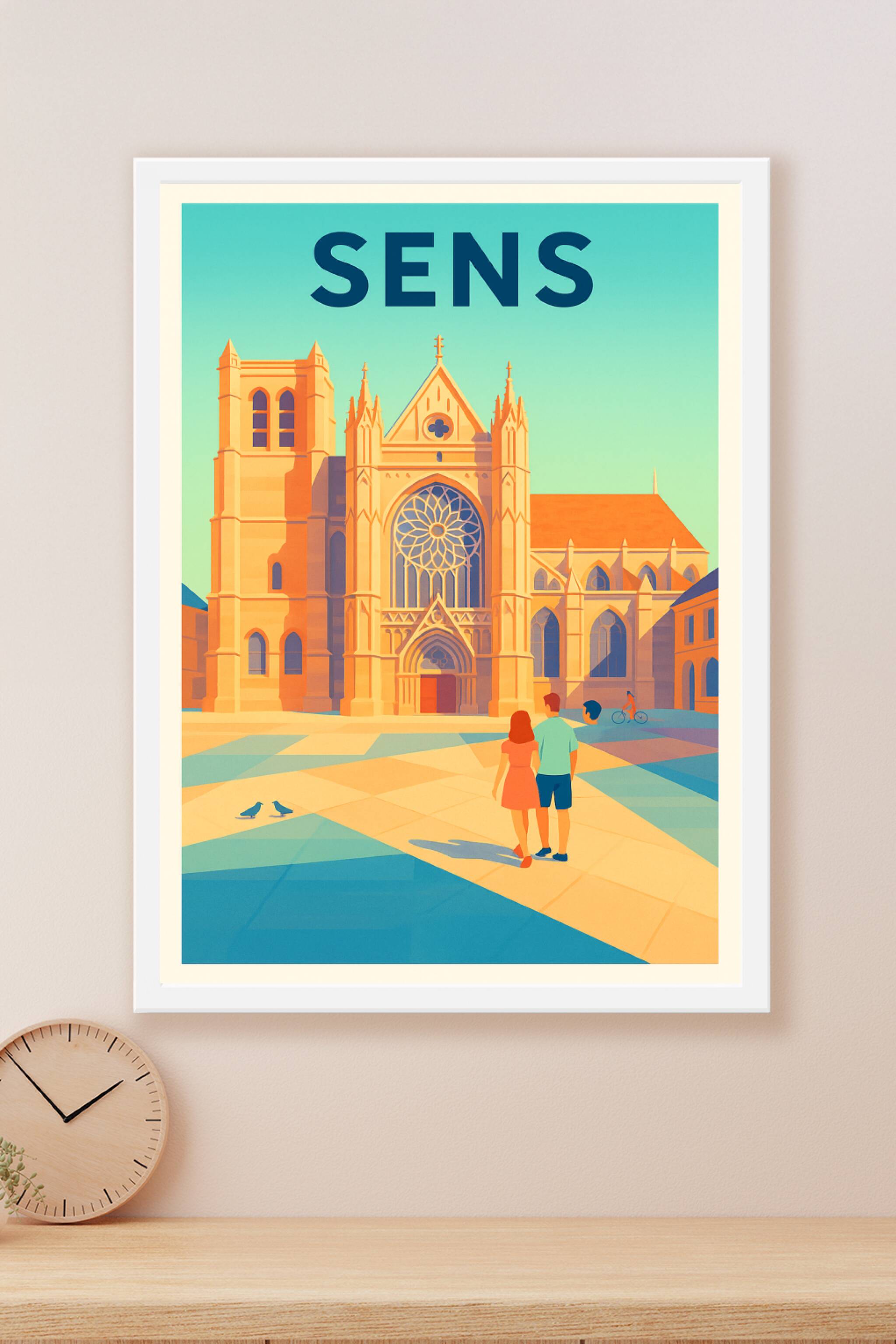 Découvrez la beauté architecturale de Sens avec cette affiche illustrée mettant en avant la majestueuse cathédrale Saint-Étienne sous un ciel bleu ...