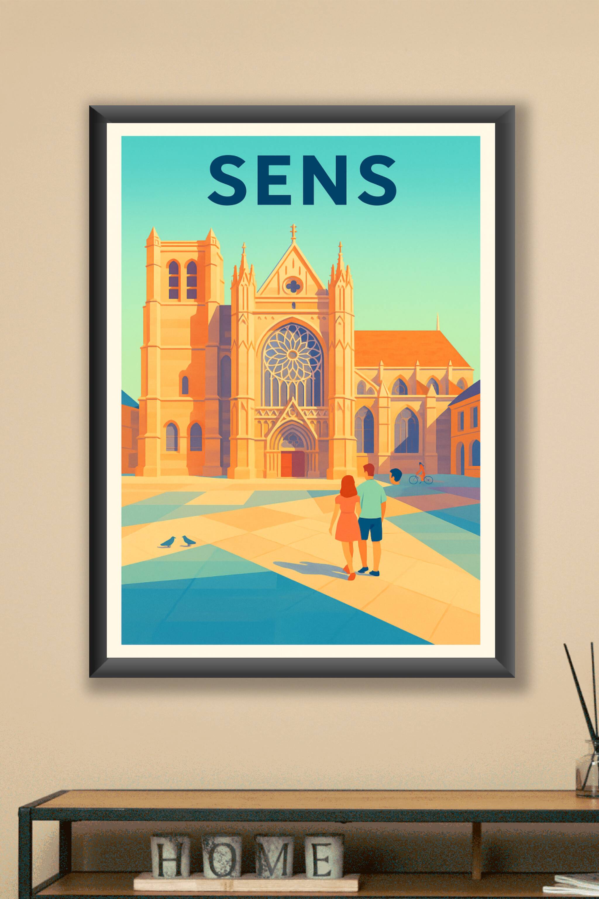 Découvrez la beauté architecturale de Sens avec cette affiche illustrée mettant en avant la majestueuse cathédrale Saint-Étienne sous un ciel bleu éclatant. Ce poster, aux tons chauds et lumineux, capture une promenade paisible avec un couple émerveillé par ce joyau gothique. Imprimé en tirage "Fine Art" sur papier 305g coton, ce poster garantit une qualité d'impression exceptionnelle, offrant des couleurs vives et une finesse des détails remarquable. Disponible en formats A1 à A4, avec ou sans cadre, cette affiche sublime votre décoration intérieure et constitue un cadeau parfait pour les amoureux de l'art et du patrimoine français. Un produit 100% fabriqué en France pour une touche élégante et authentique dans votre espace de vie.