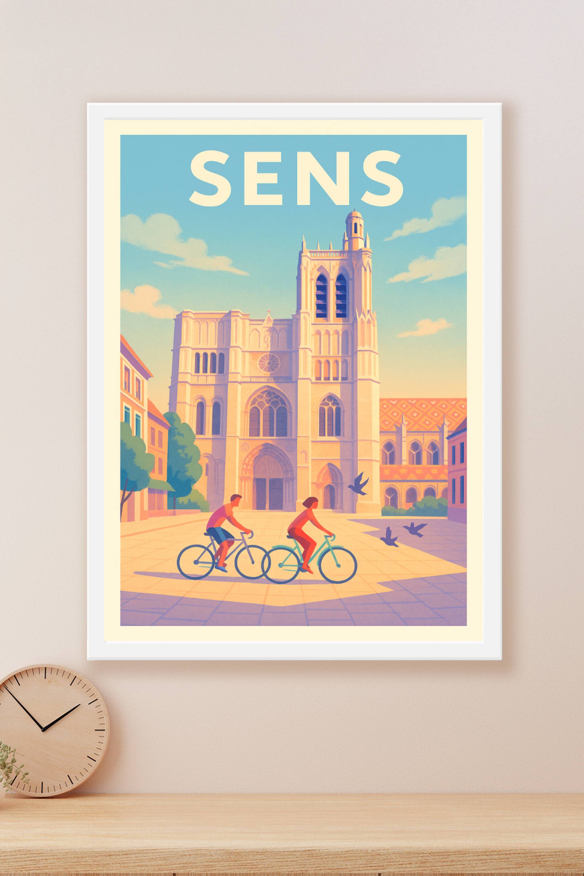 Découvrez l'élégance historique de Sens avec ce poster illustré où la cathédrale gothique se dresse majestueusement sous un ciel azur. Deux cyclist...