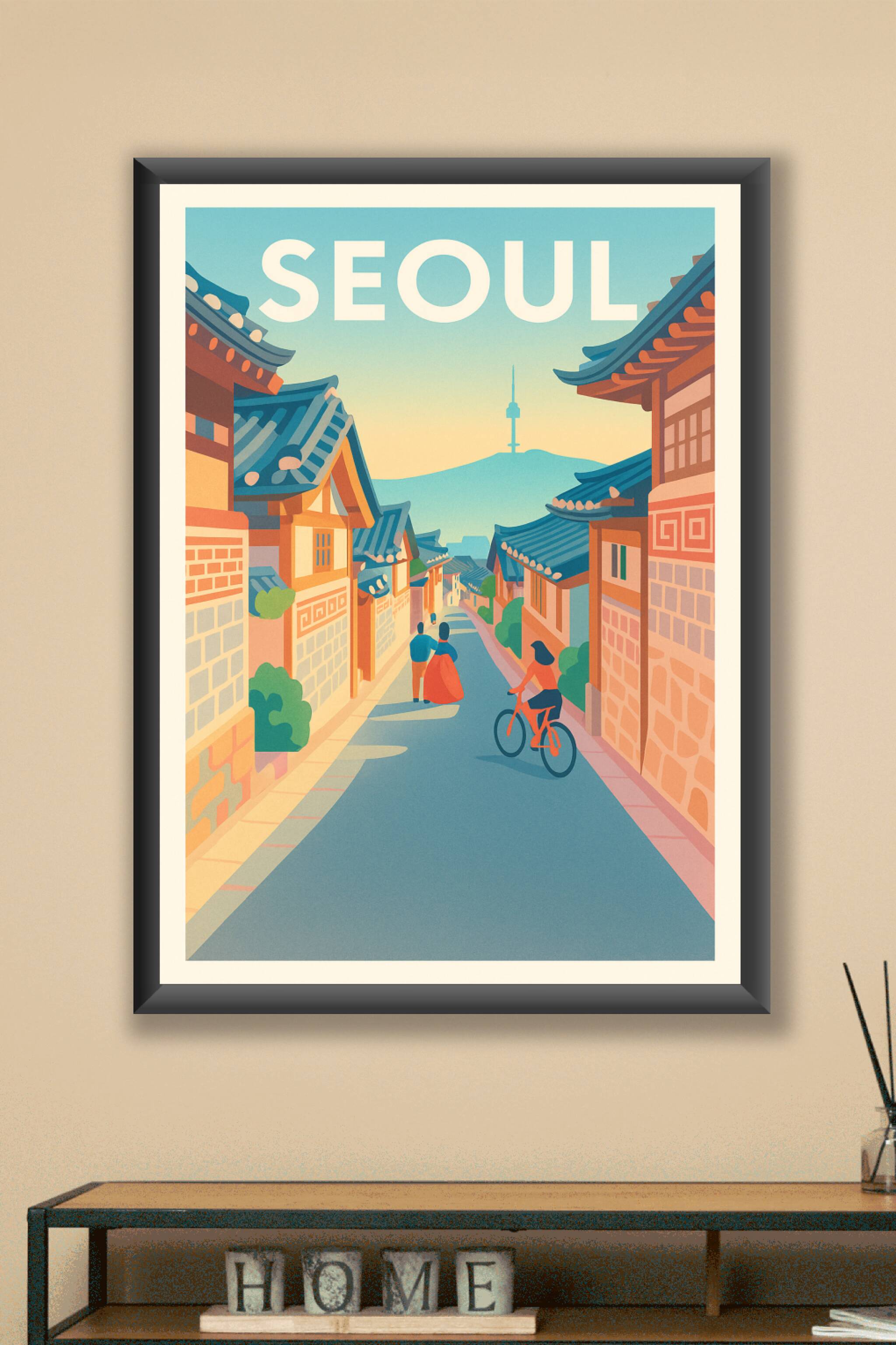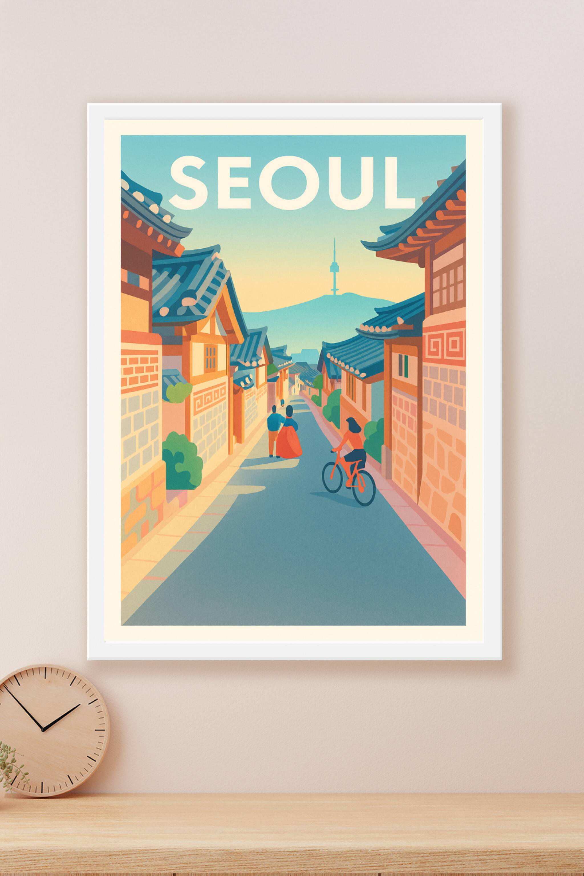 Découvrez le charme unique de Seoul avec ce poster illustré mettant en scène une ruelle typique bordée de maisons traditionnelles coréennes et la t...