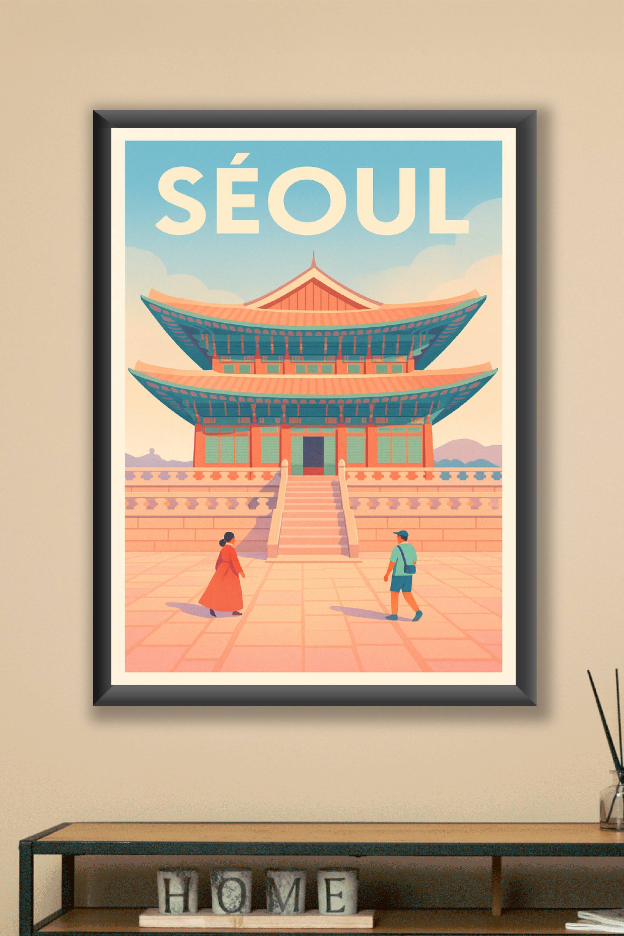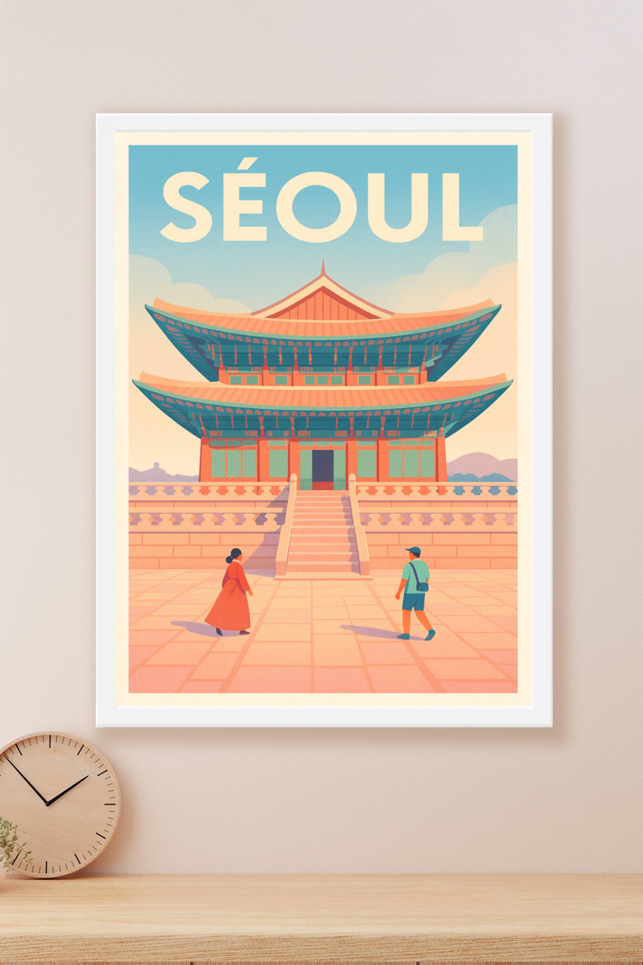 Découvrez la richesse culturelle de Séoul à travers cette affiche illustrée représentant un majestueux bâtiment traditionnel coréen, symbole du pat...