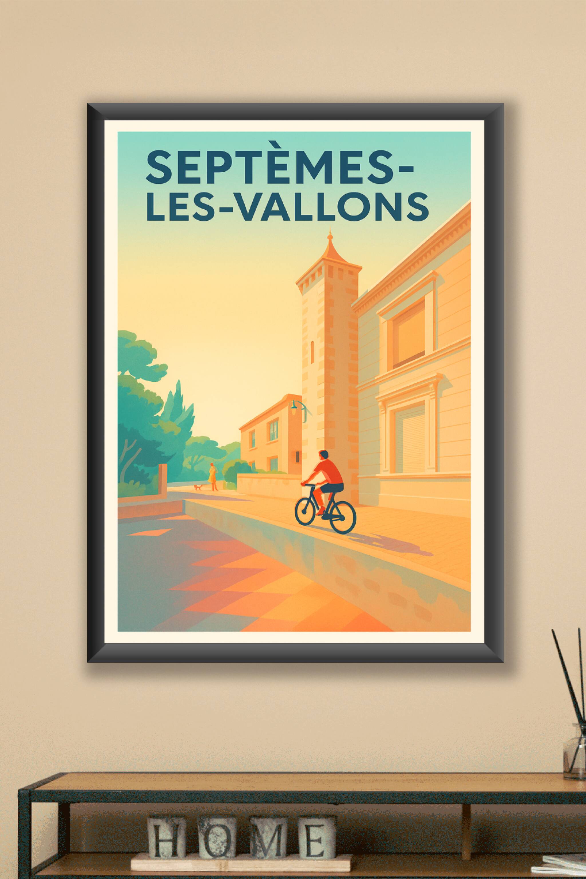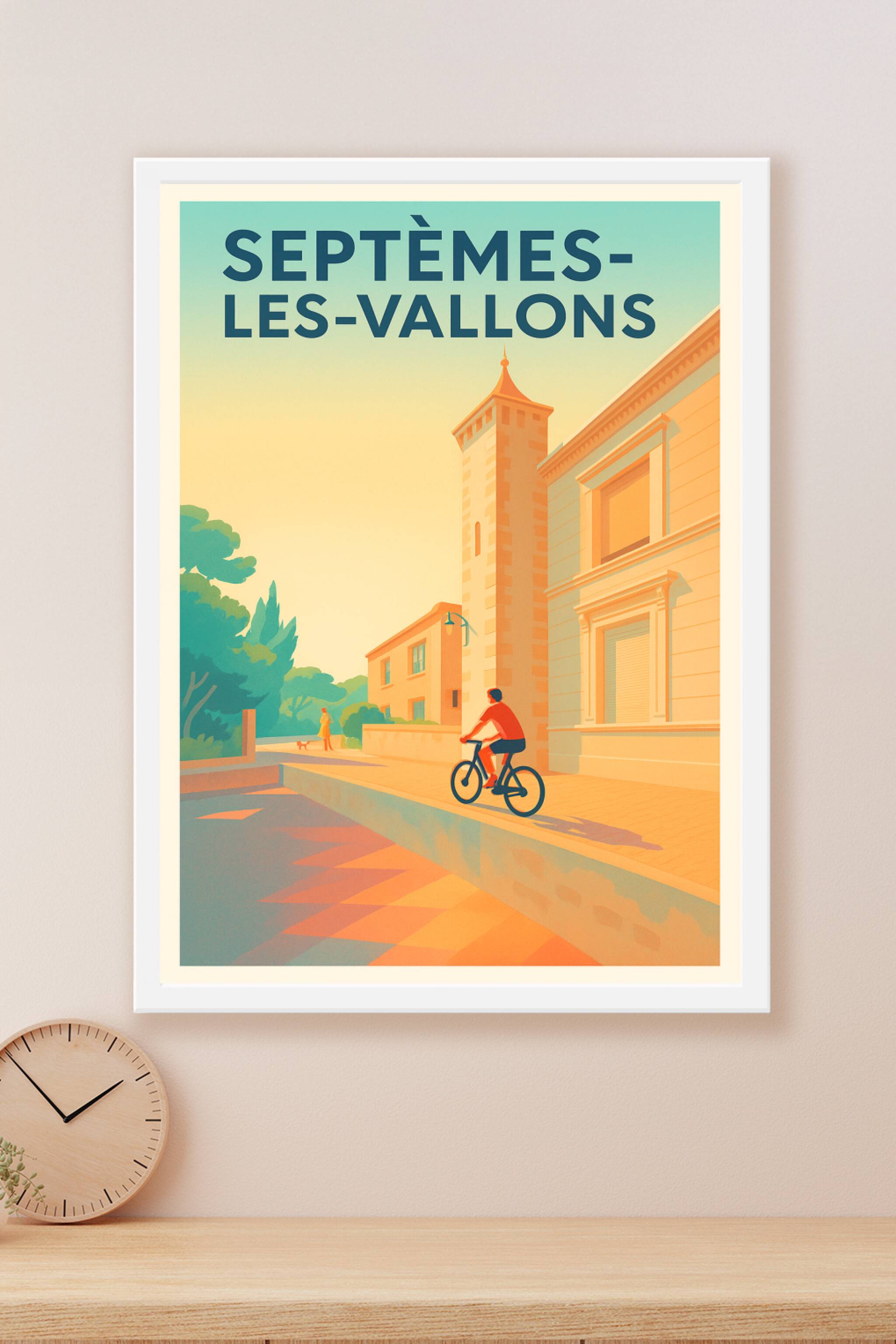 Découvrez la douceur de vivre de Septèmes-les-Vallons à travers cette affiche au style épuré et lumineux, où une balade à vélo illumine une avenue ...