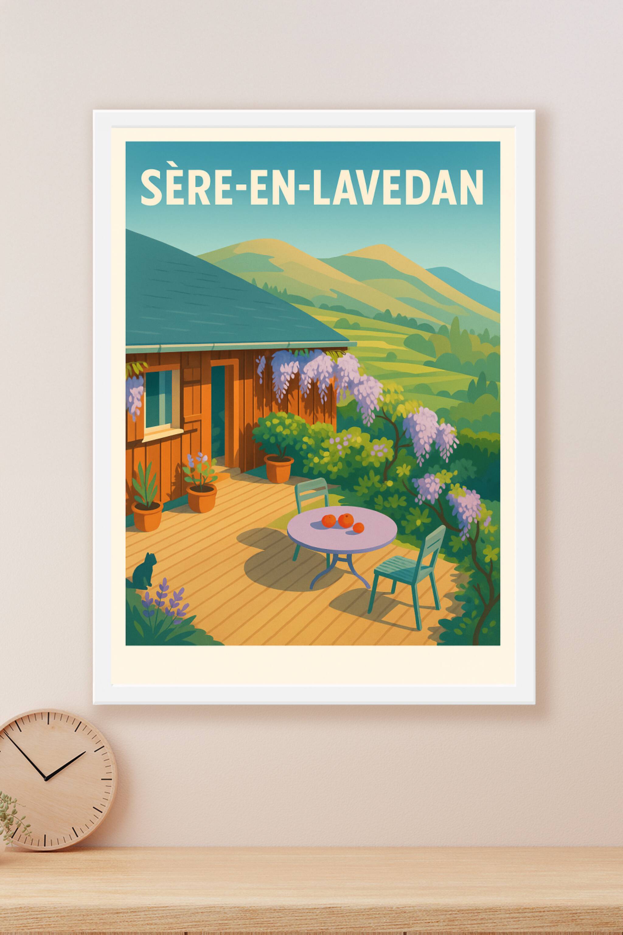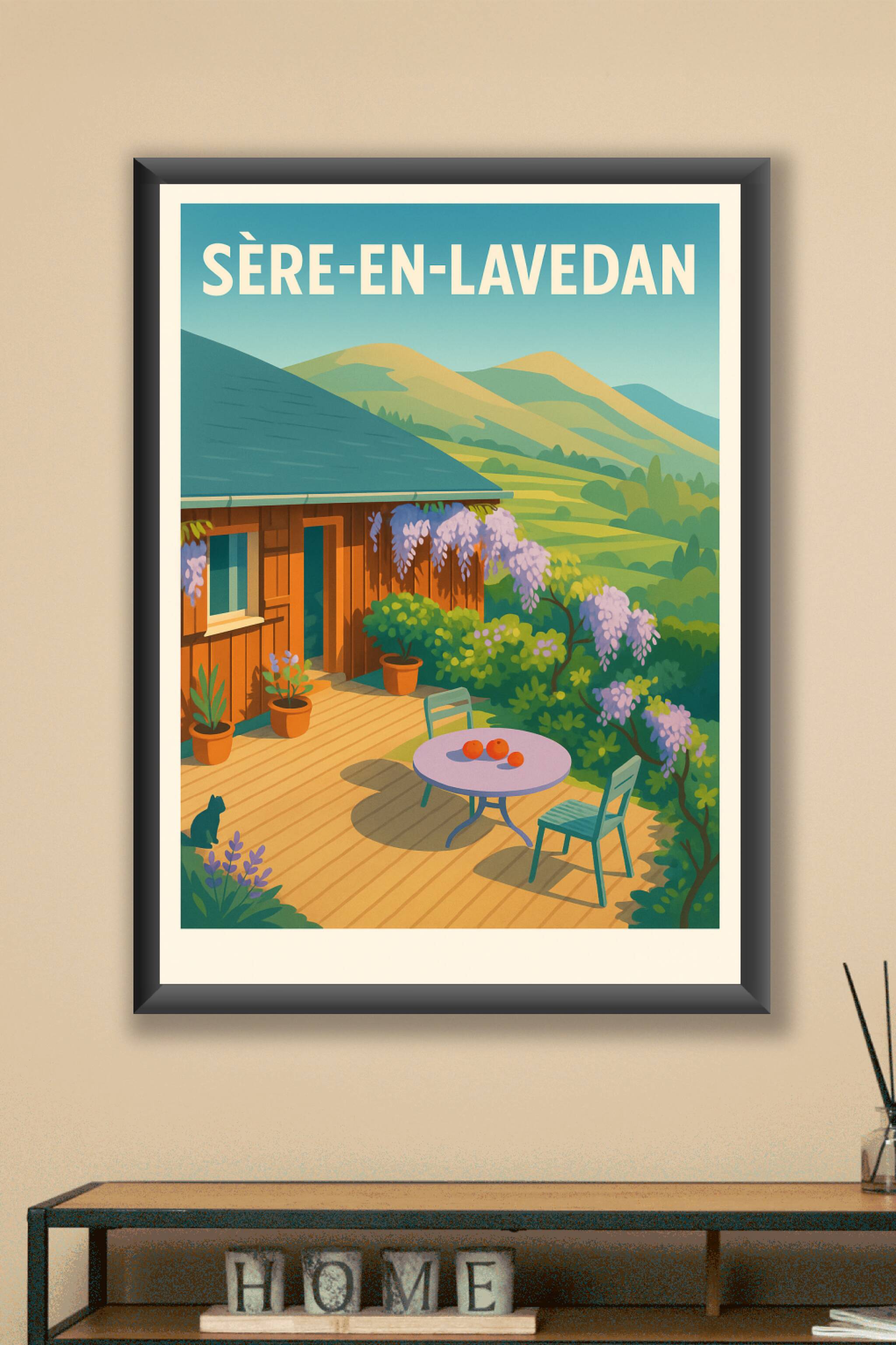 Découvrez la sérénité champêtre de Sère-en-Lavedan avec cette magnifique affiche illustrée mettant en scène une terrasse ensoleillée et une végétat...