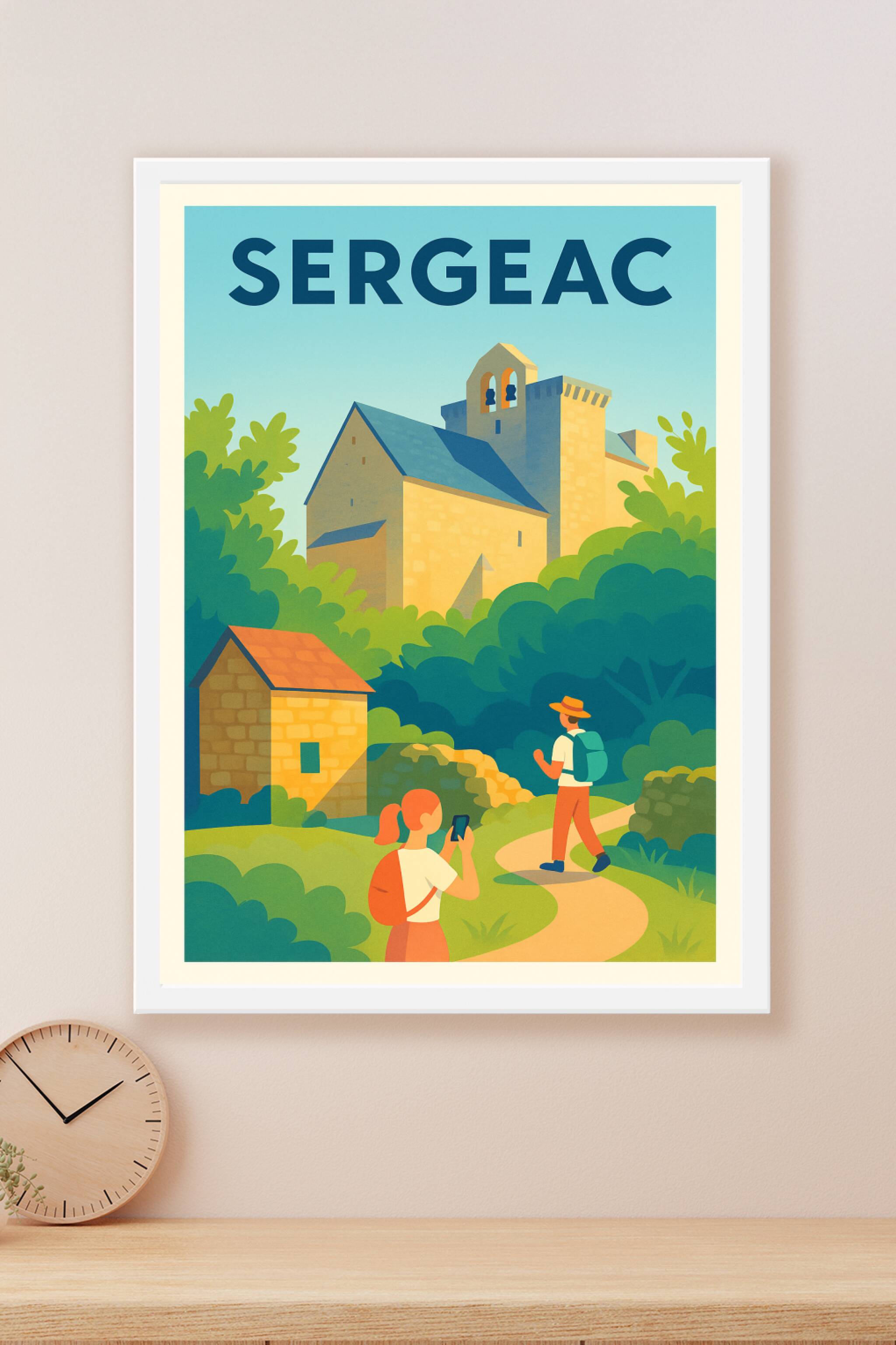 Découvrez la sérénité de Sergeac avec cette affiche illustrée mettant en scène un charmant chemin bucolique menant à un édifice historique baigné d...