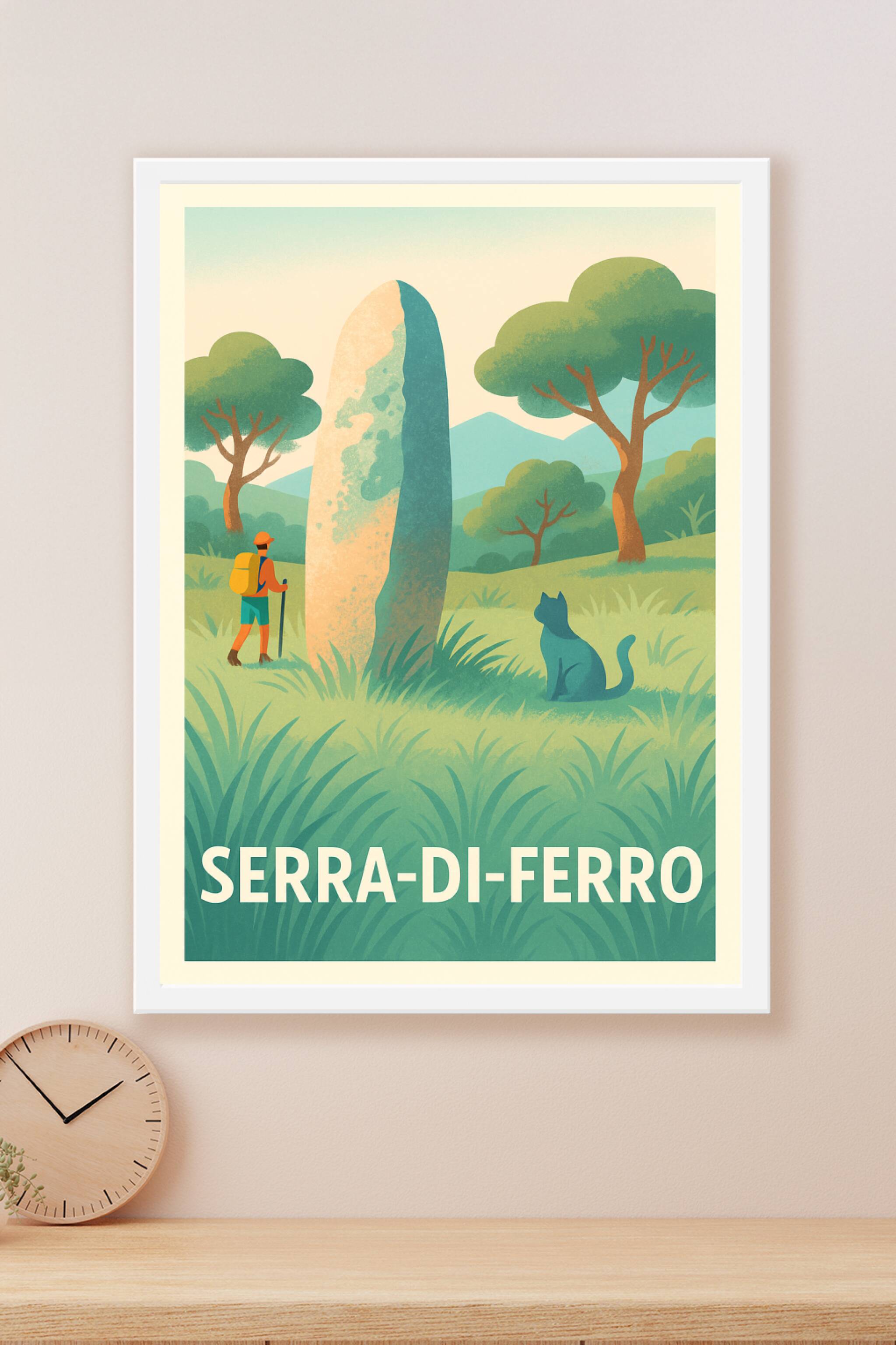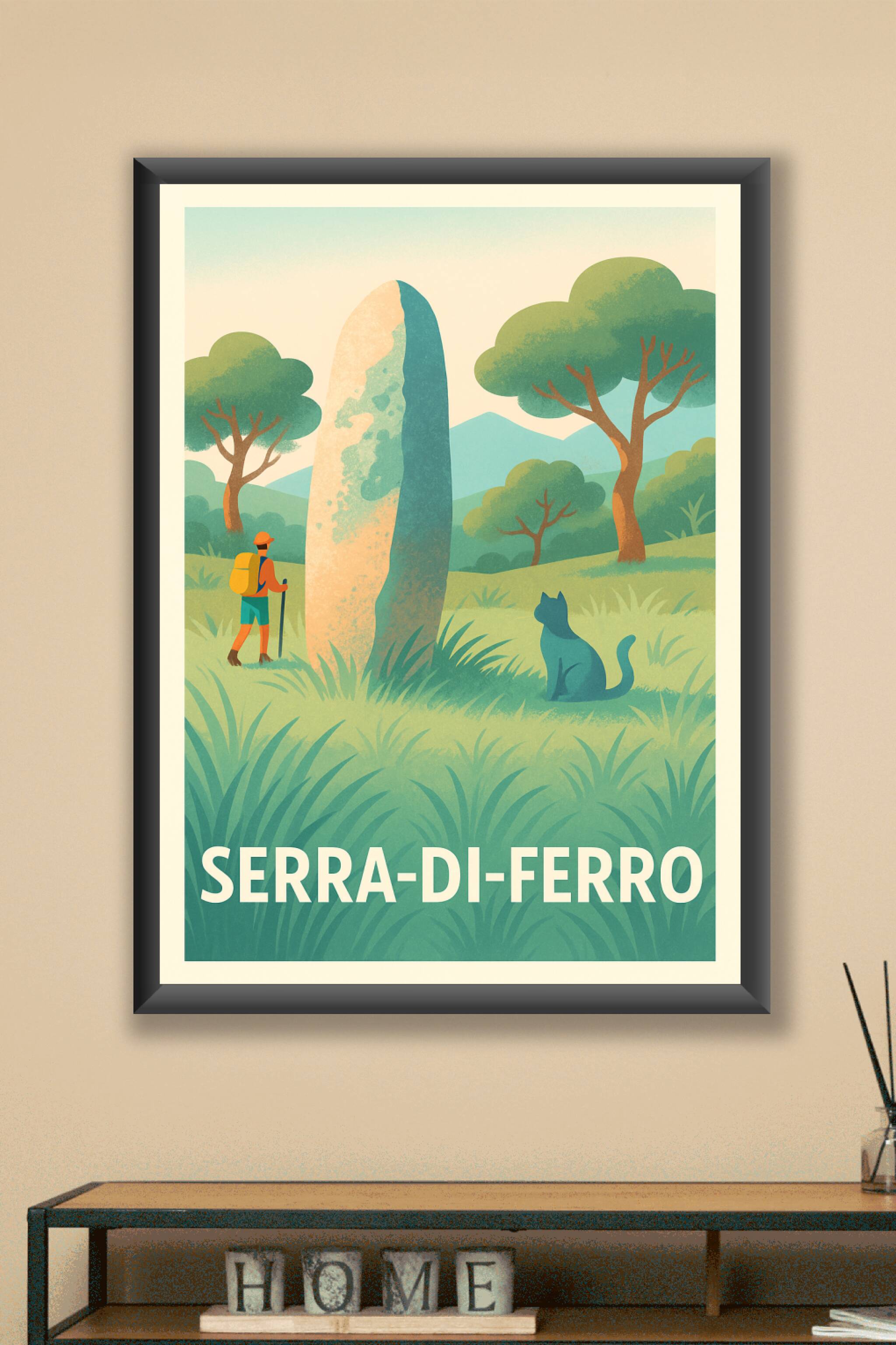 Découvrez l'esprit sauvage et paisible de Serra-di-Ferro avec cette affiche au style vintage illustré. On y voit un randonneur curieux et un chat c...
