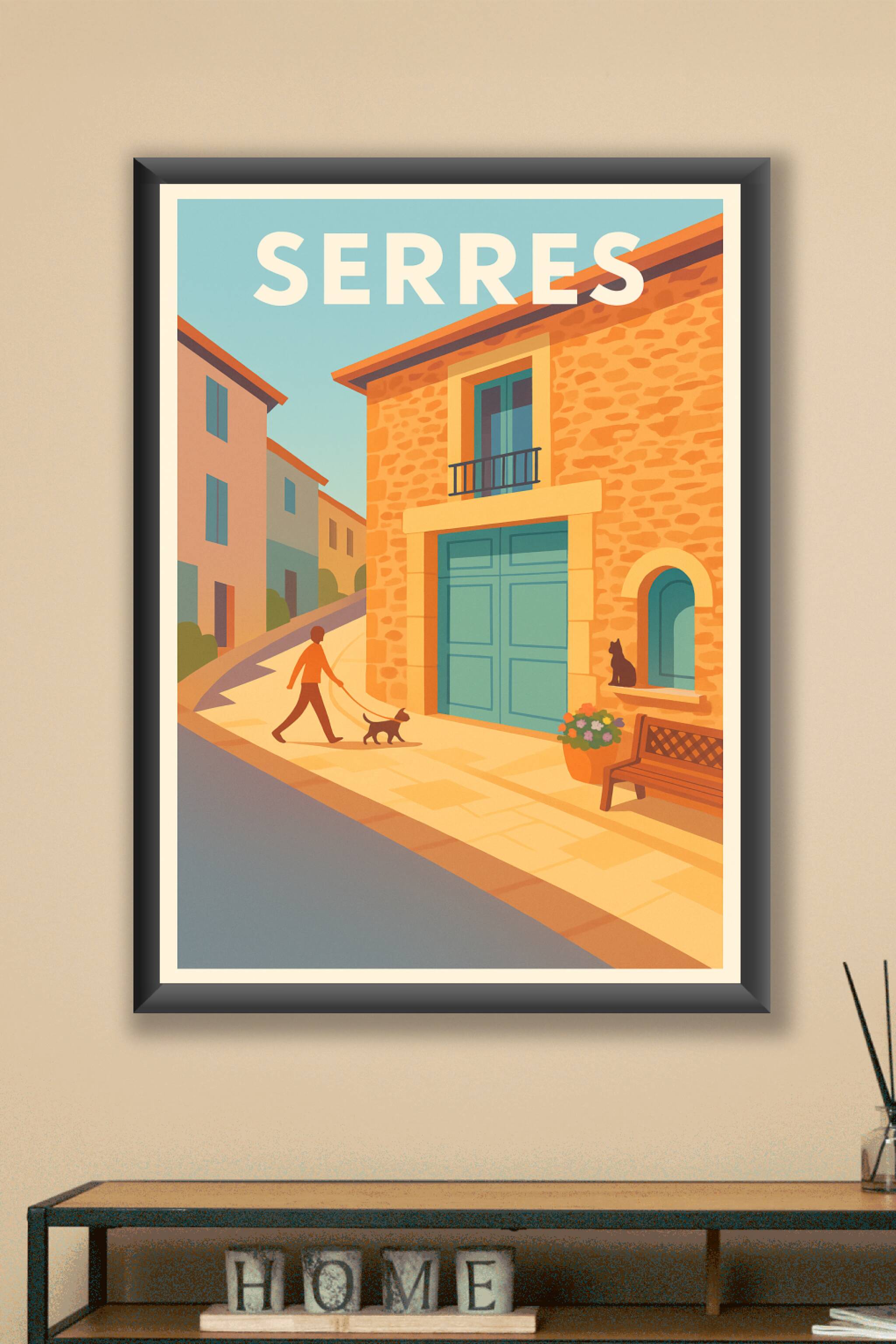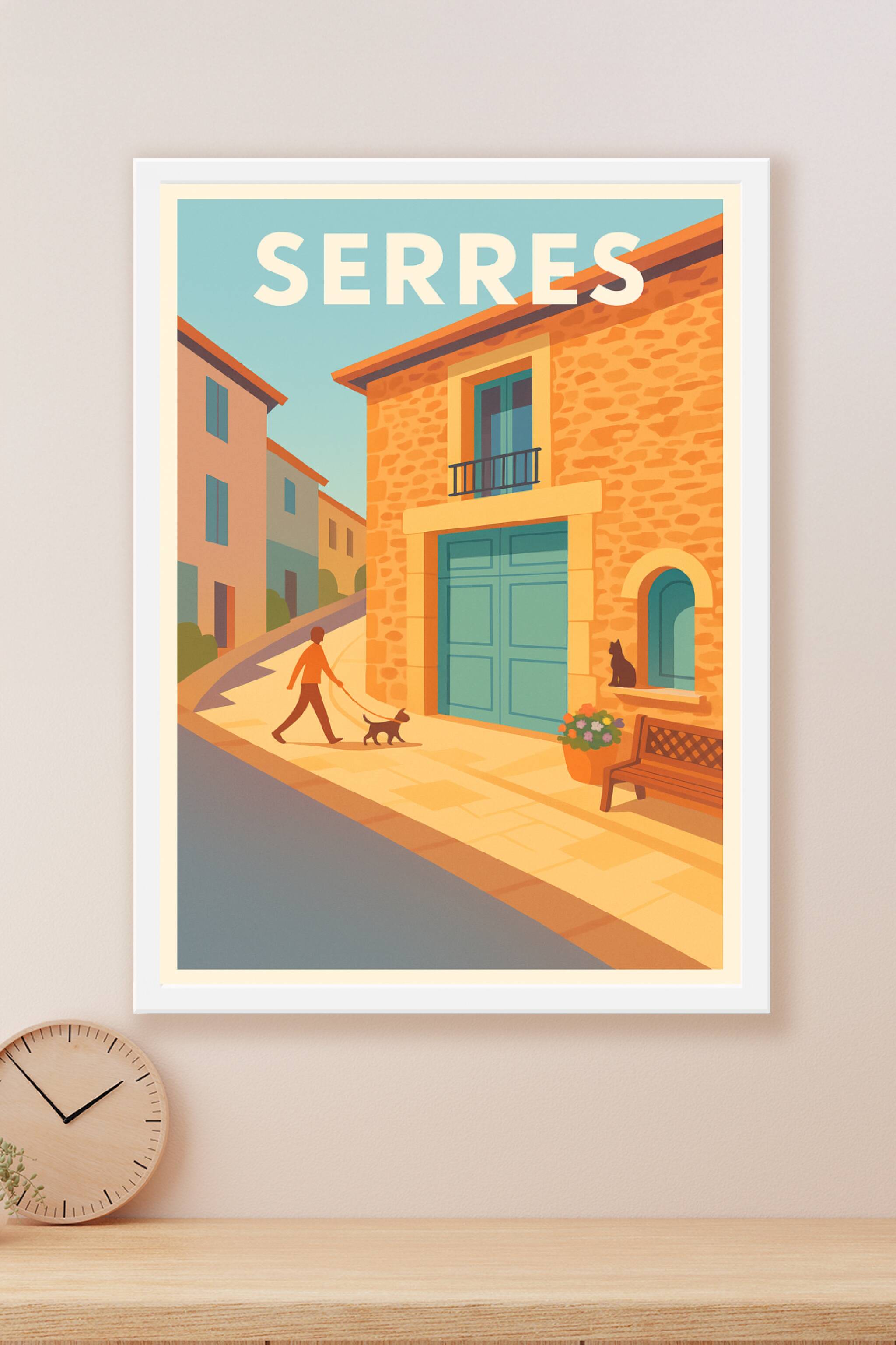 Découvrez la douceur de vivre à Serres avec cette affiche illustrée au style rétro évoquant un paisible après-midi dans les ruelles ensoleillées du...