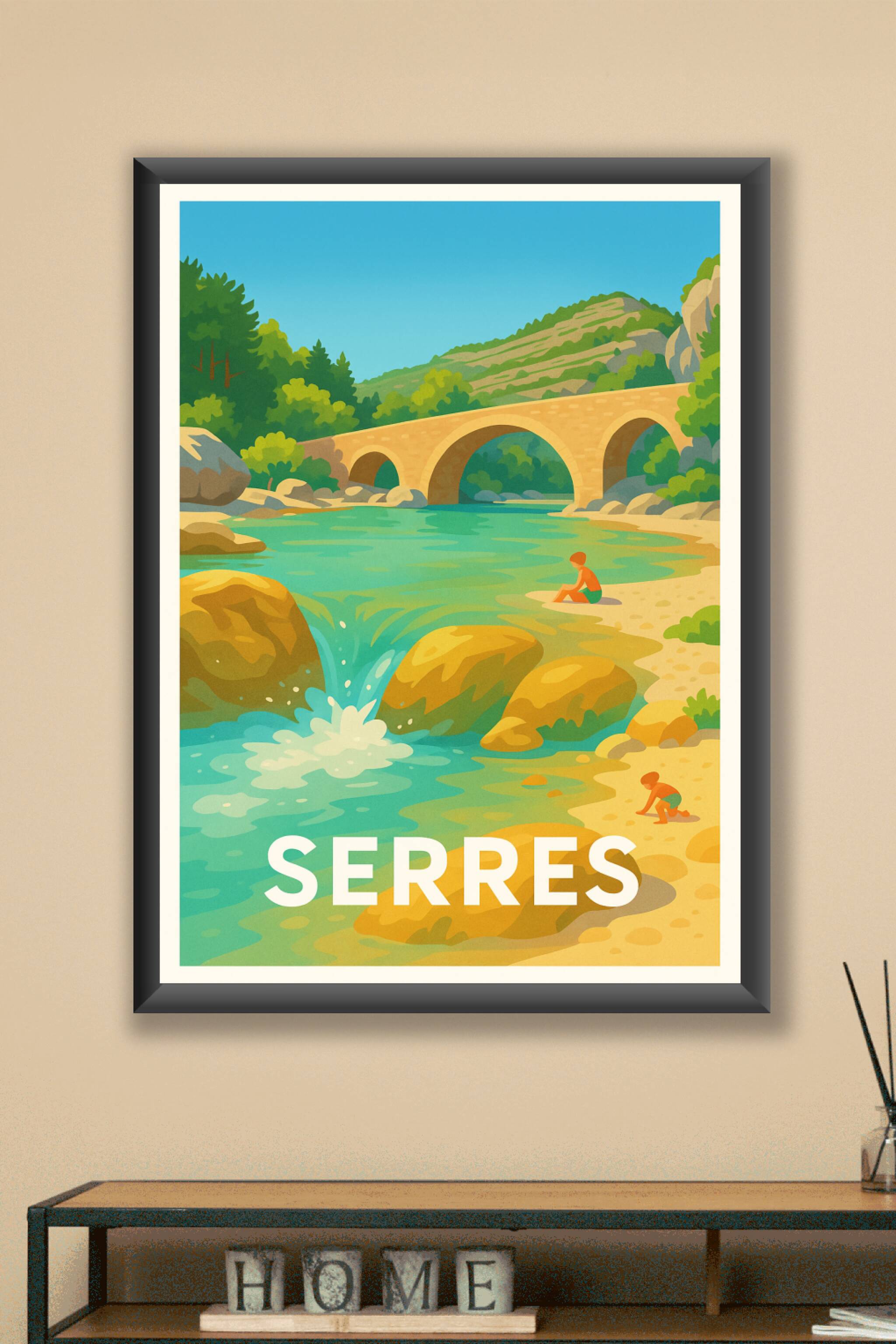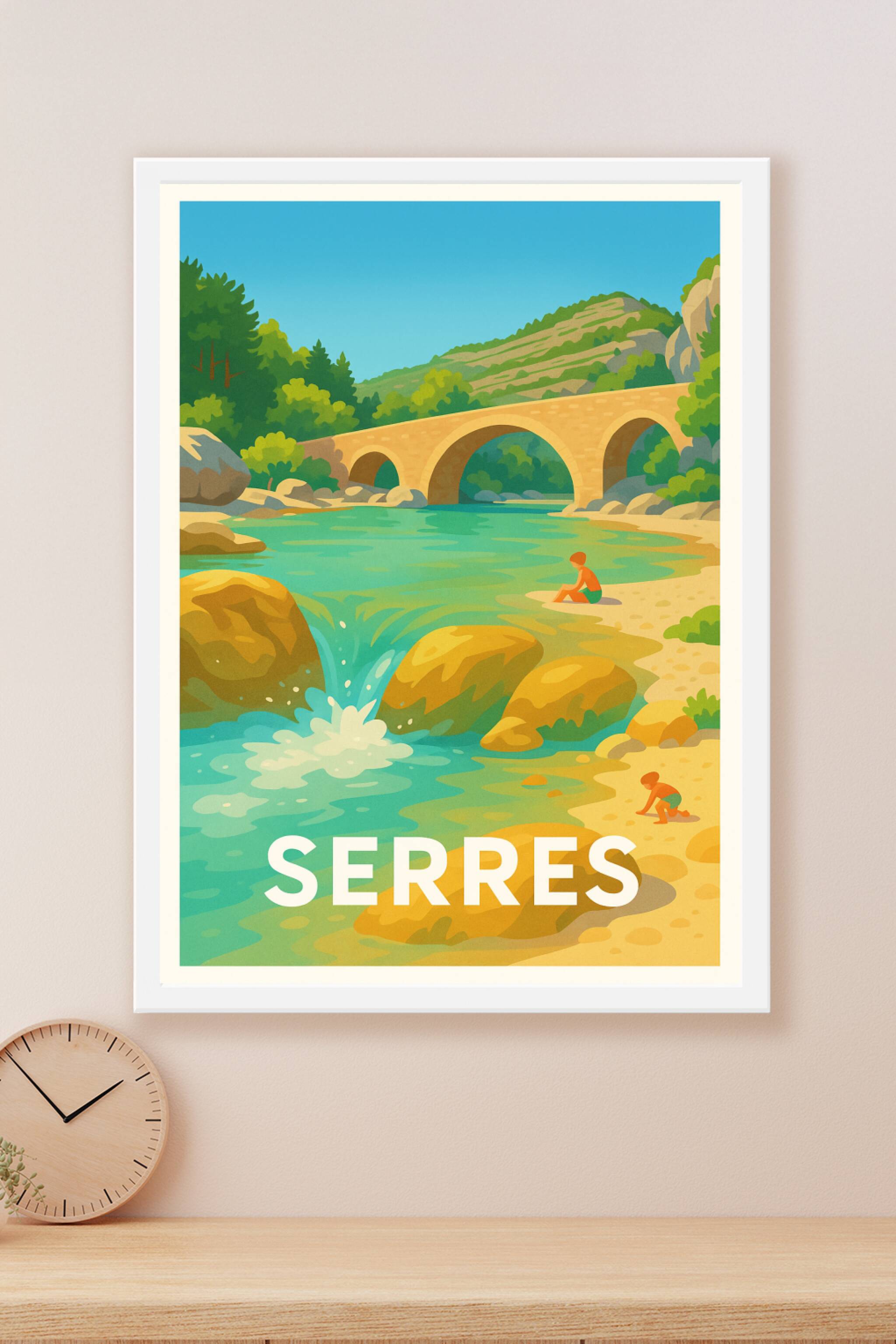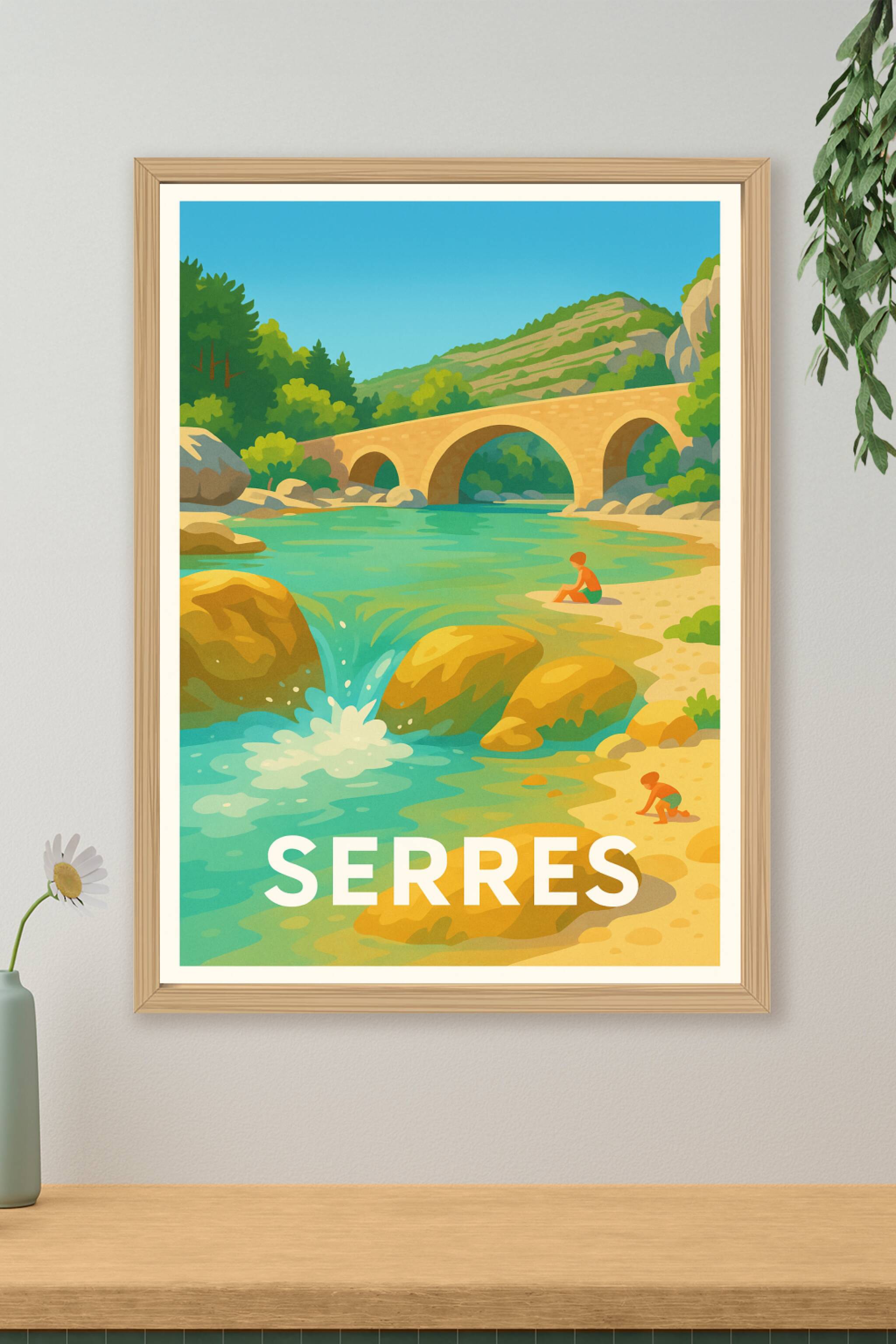Découvrez la douceur pastorale de Serres avec cette affiche illustrant un paysage naturel apaisant, où un pont de pierre ancien surplombe une riviè...