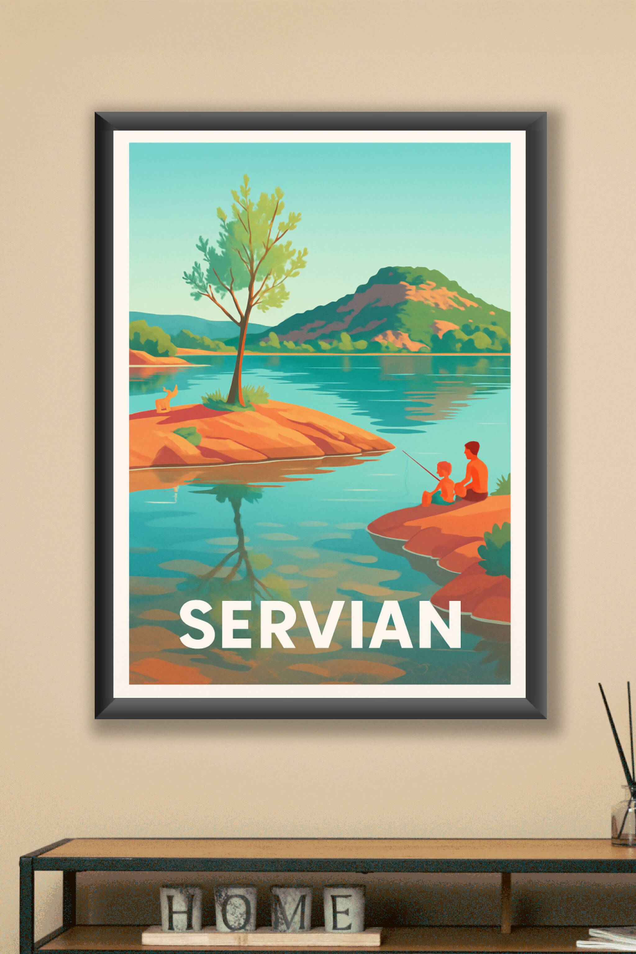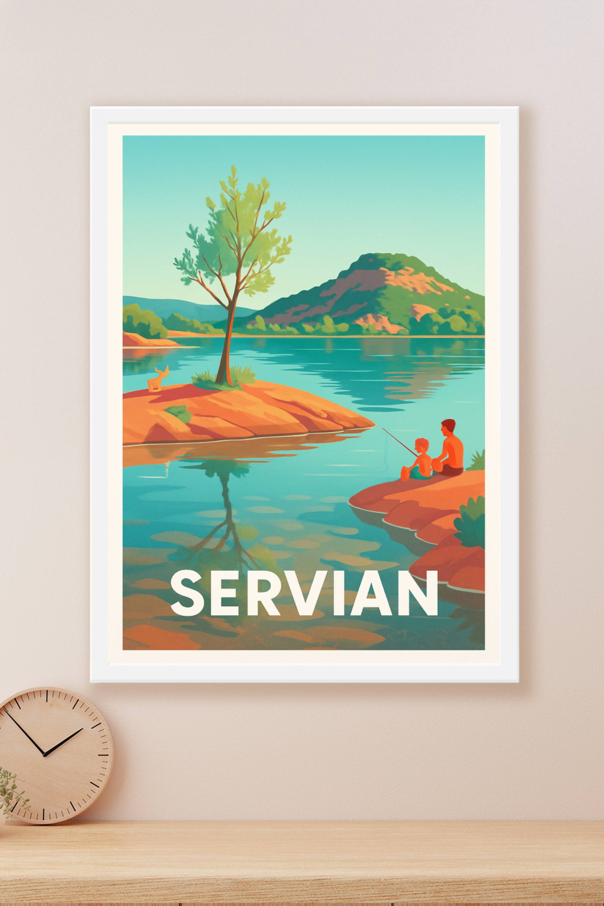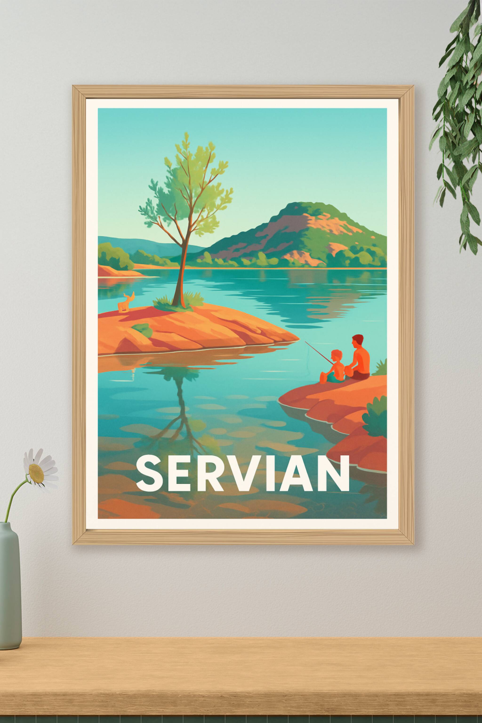 Découvrez la douce sérénité de Servian avec cette affiche au style vintage, illustrant un duo en pleine pêche au bord d'un lac aux eaux calmes et l...