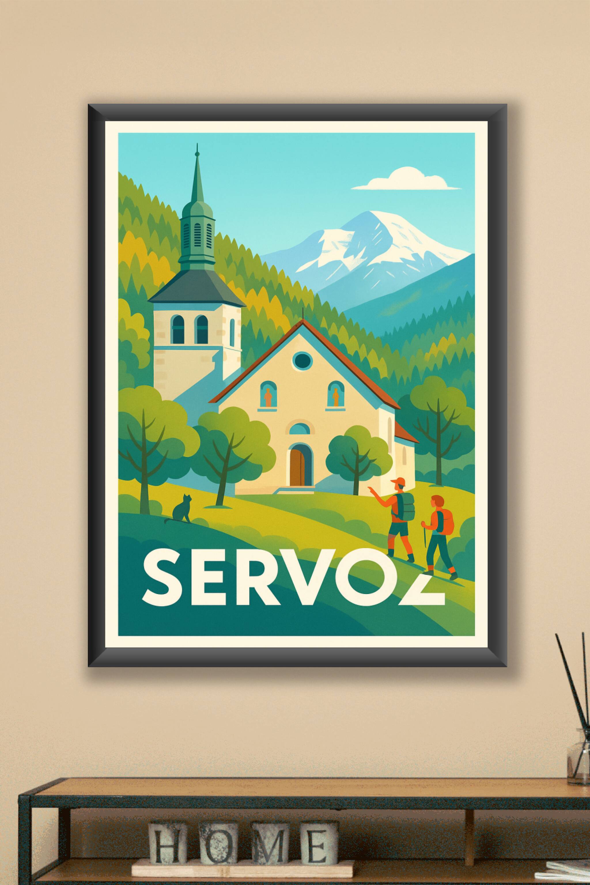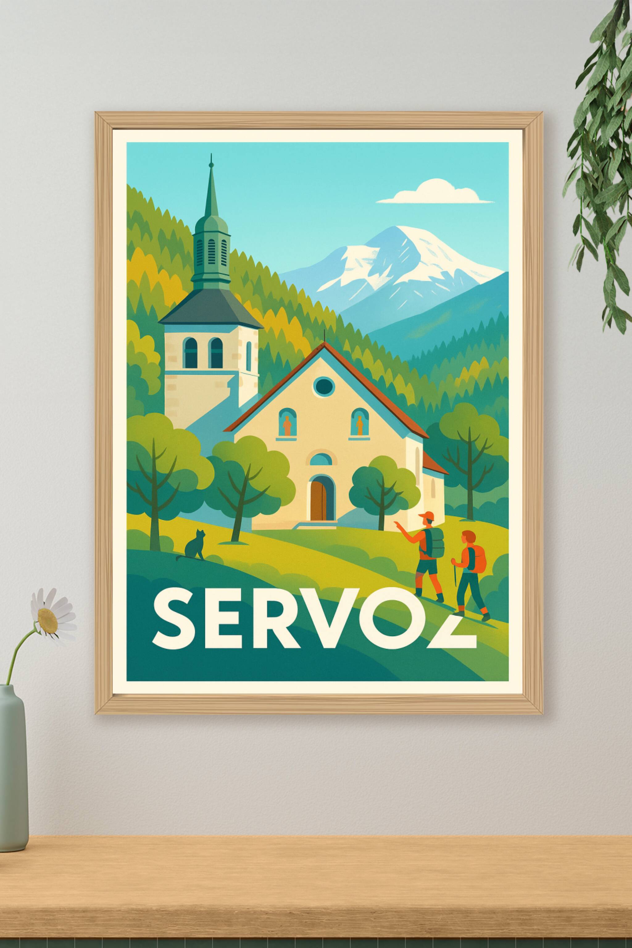 Découvrez la douceur et la sérénité de Servoz à travers cette affiche illustrée qui met en scène un paysage montagnard typique avec son église pitt...