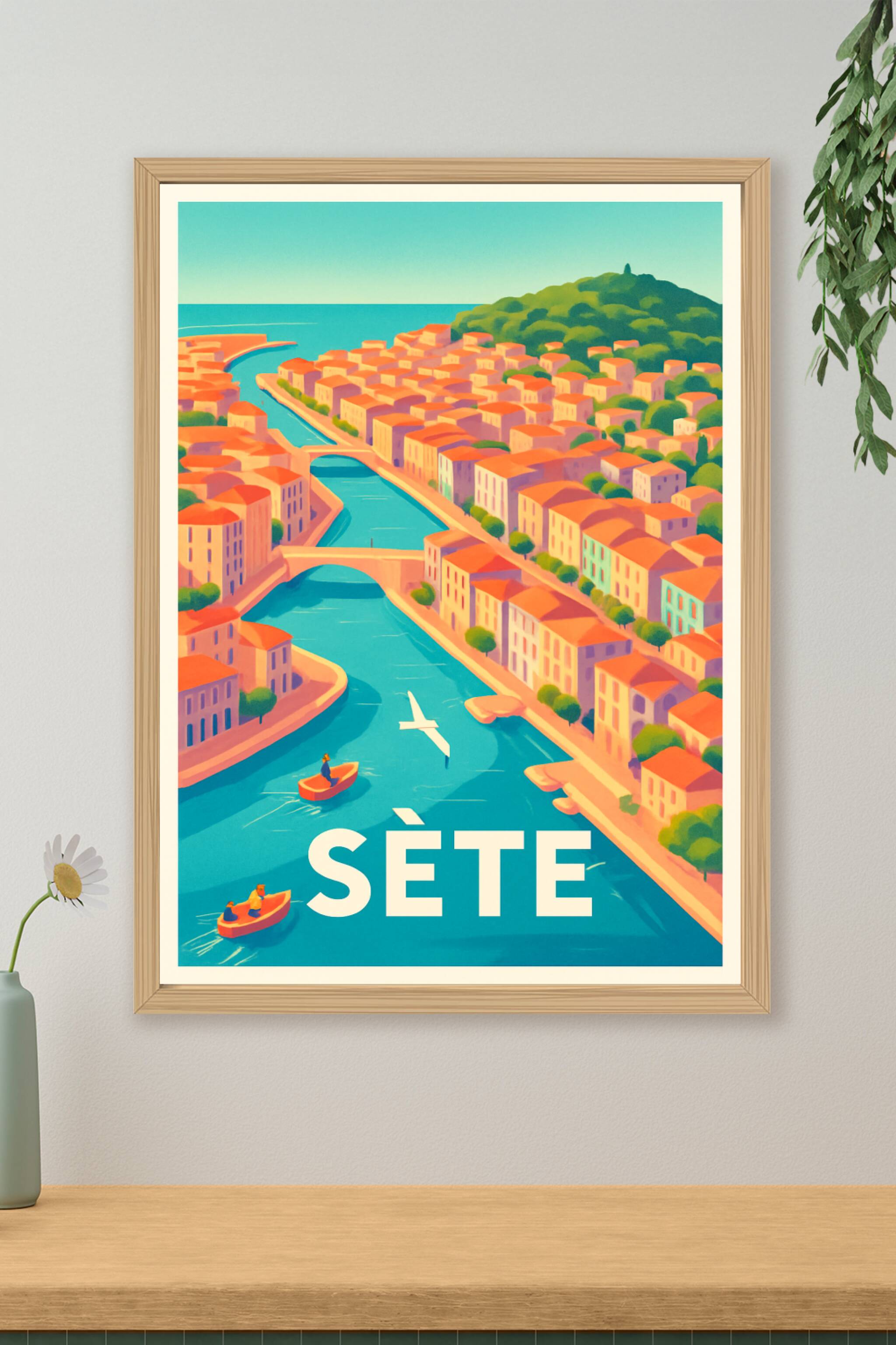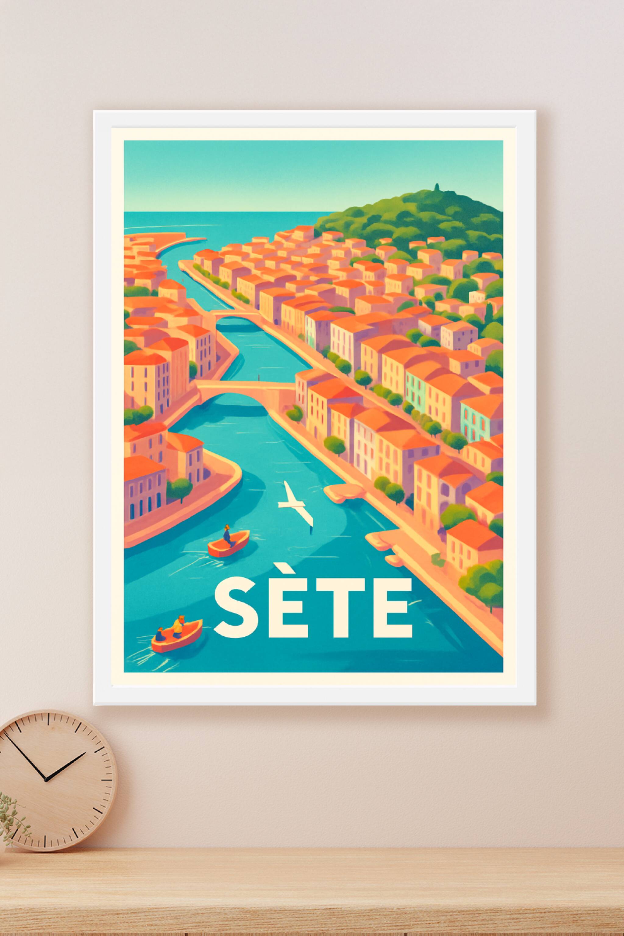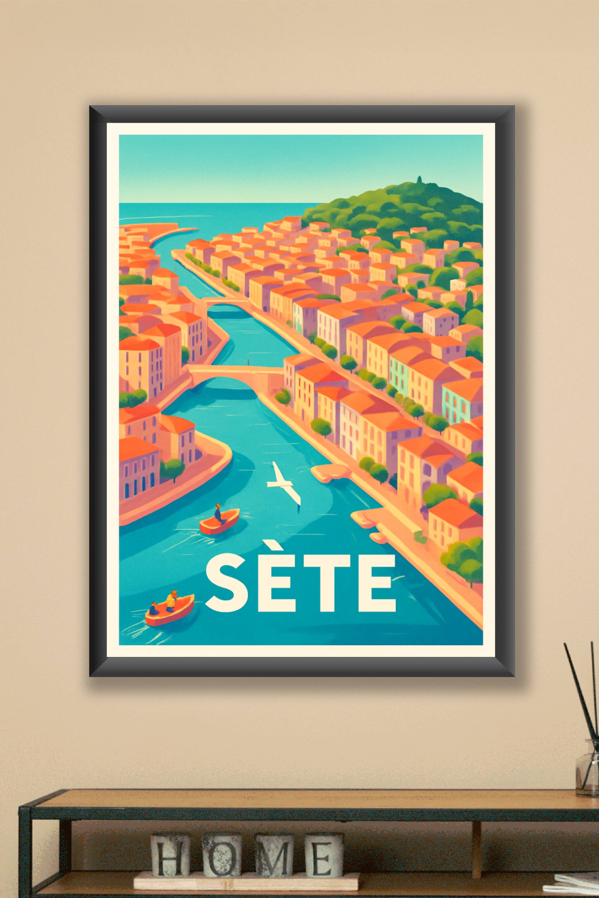 Découvrez l'élégance lumineuse de Sète avec cette affiche illustrée, mettant en scène ses canaux emblématiques bordés de maisons aux toits rouges e...