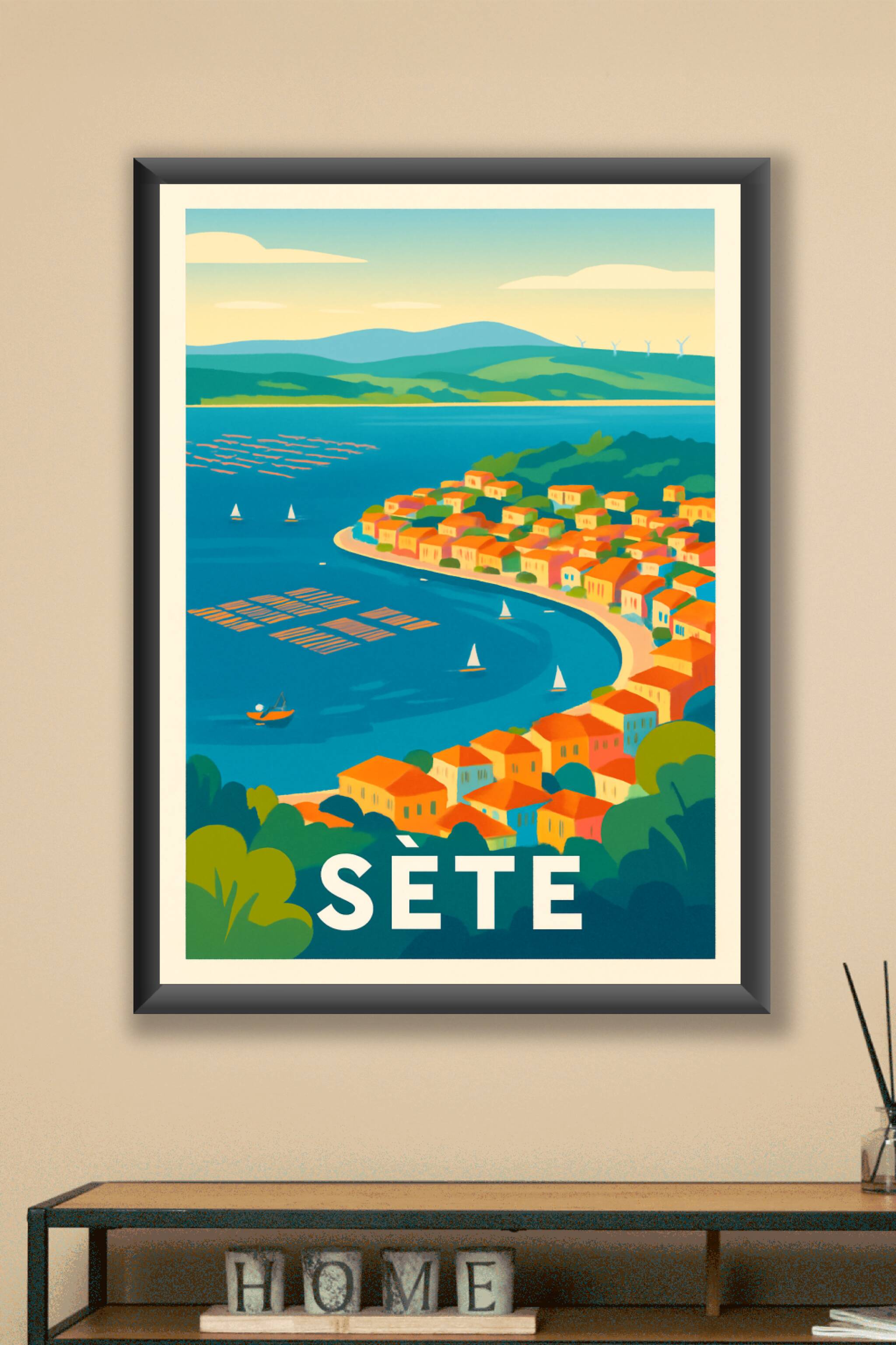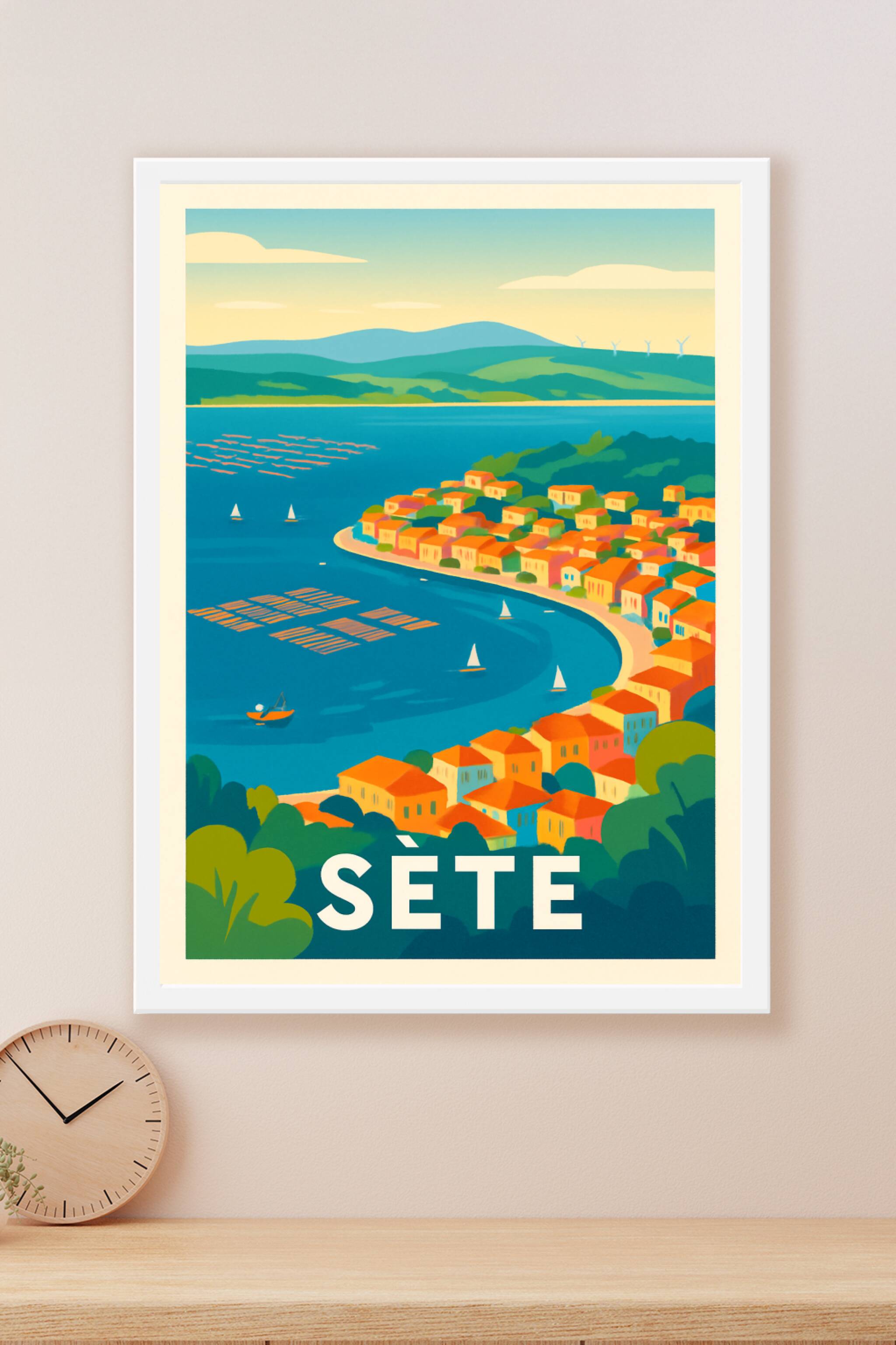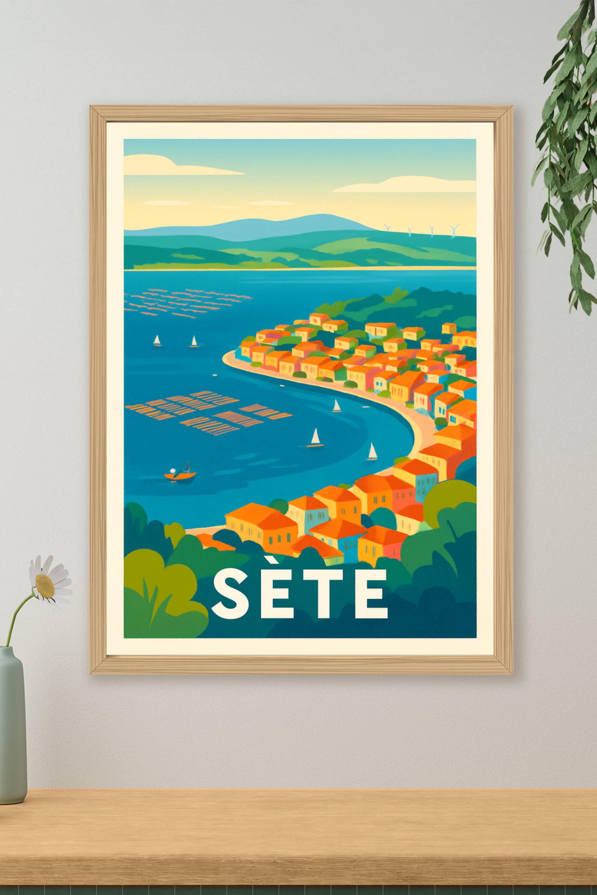 Découvrez la douceur de vivre de Sète avec cette affiche au style vintage et aux couleurs vibrantes, représentant la baie et ses maisons aux toits ...