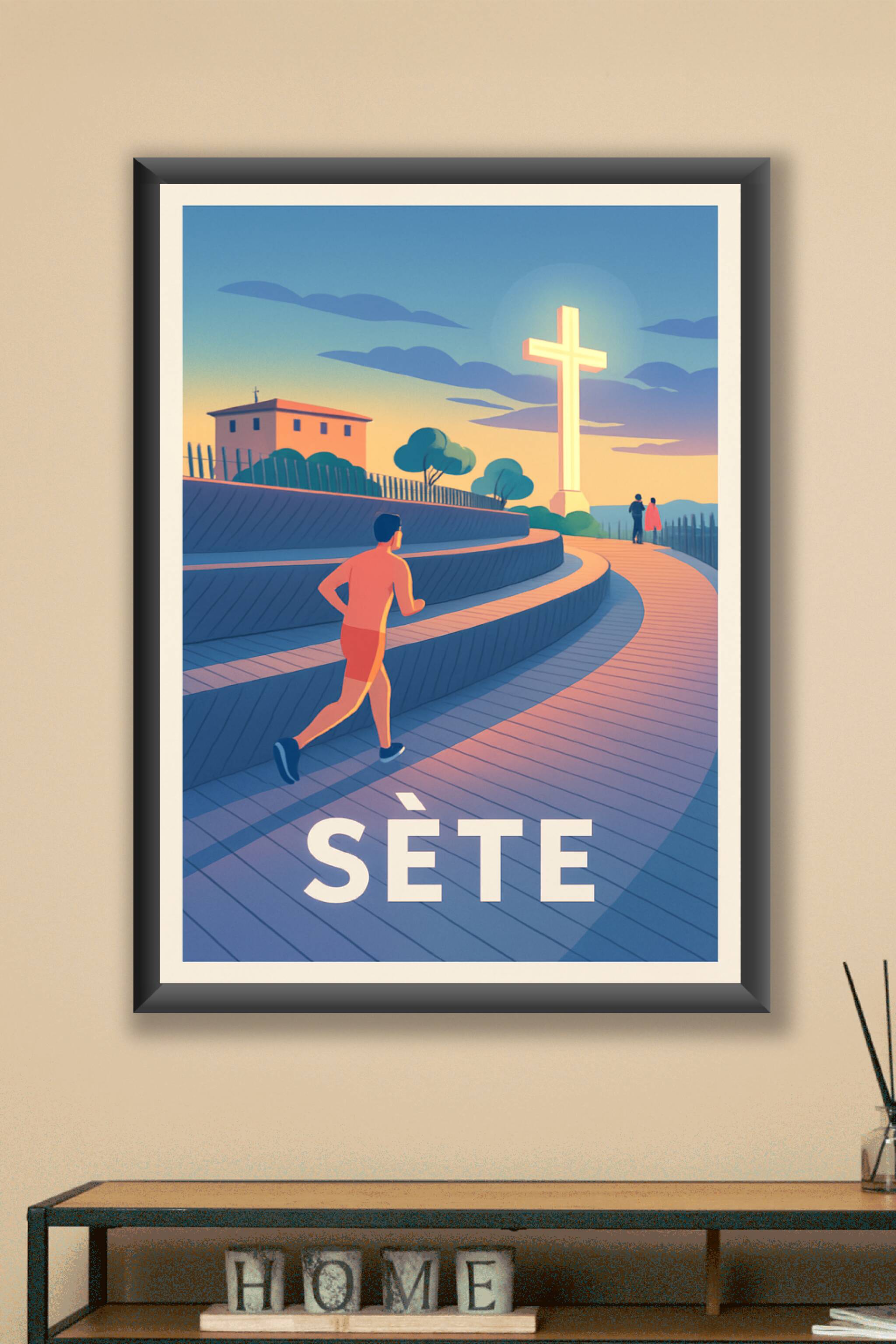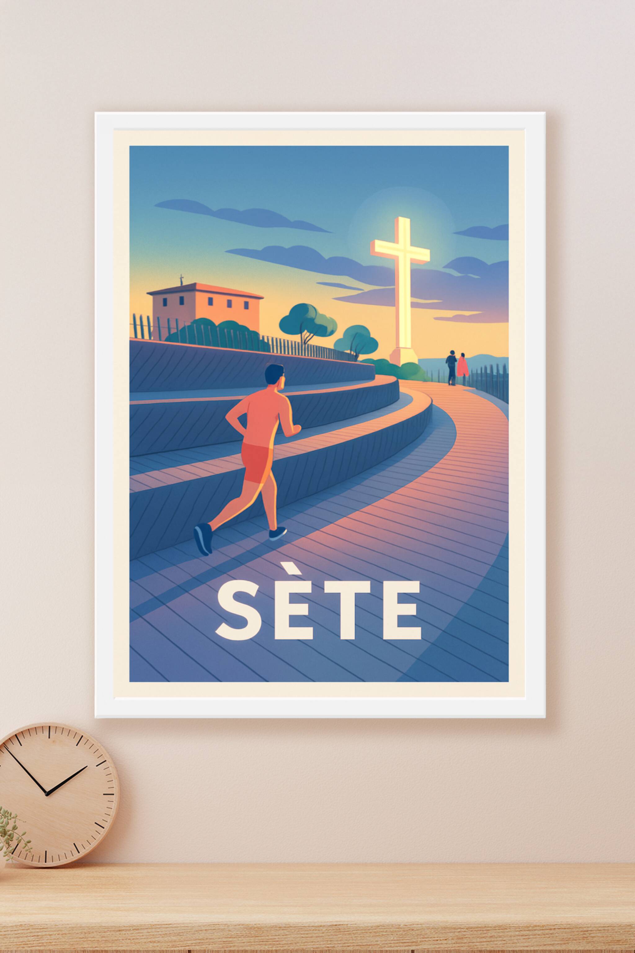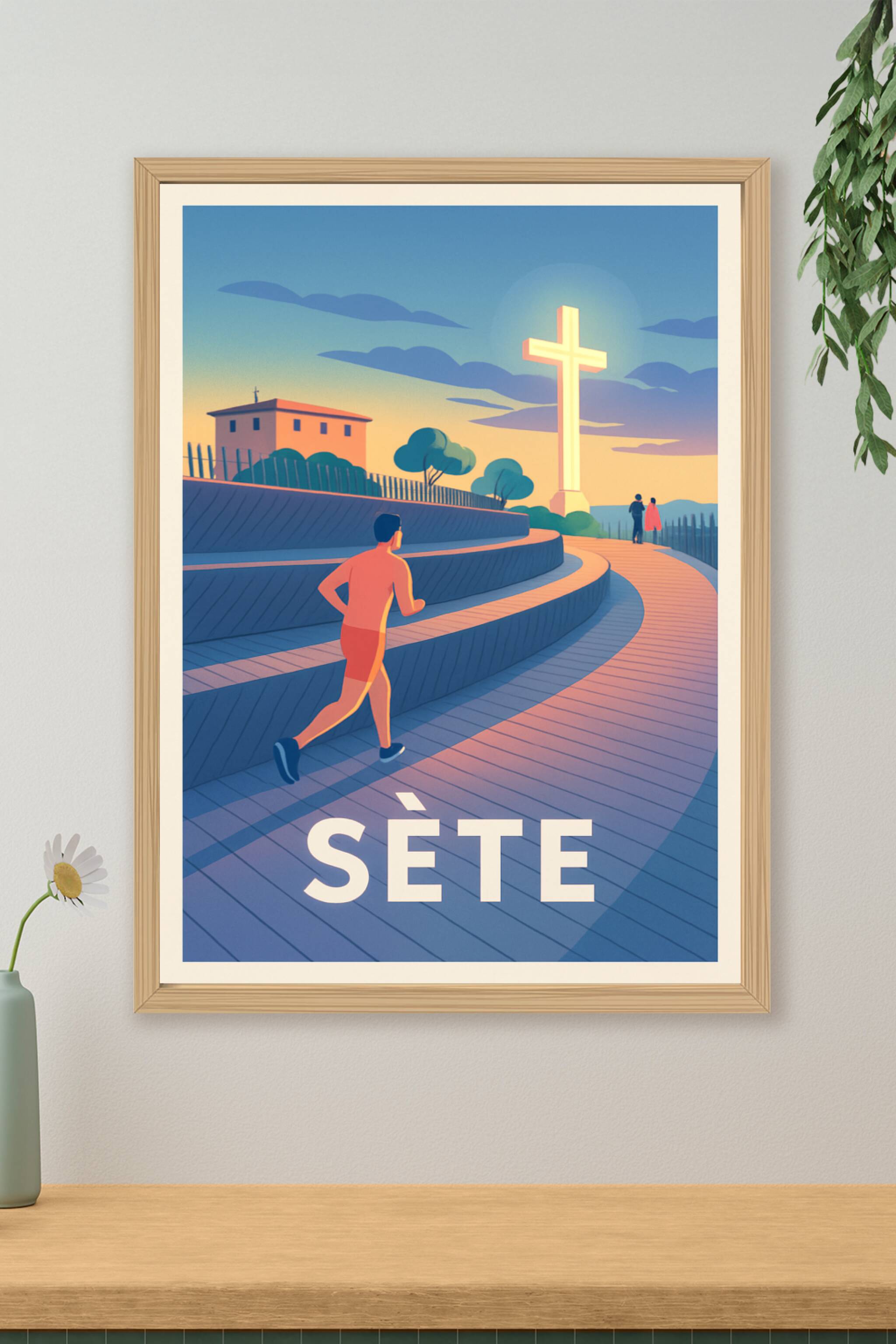 Découvrez la douceur des soirées sétoises avec cette affiche au style graphique et épuré, mettant en scène un coureur surplombant l'emblématique Cr...