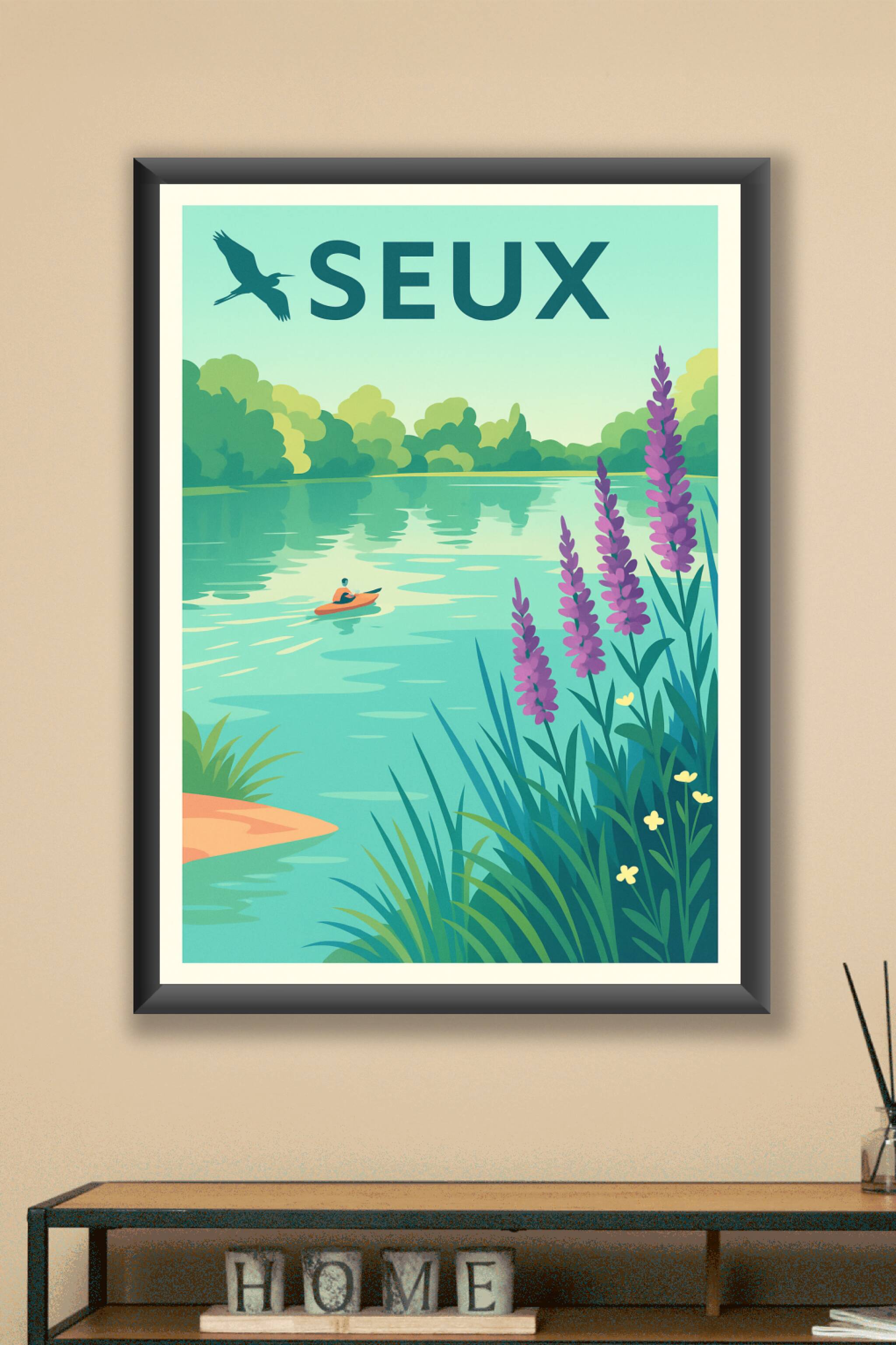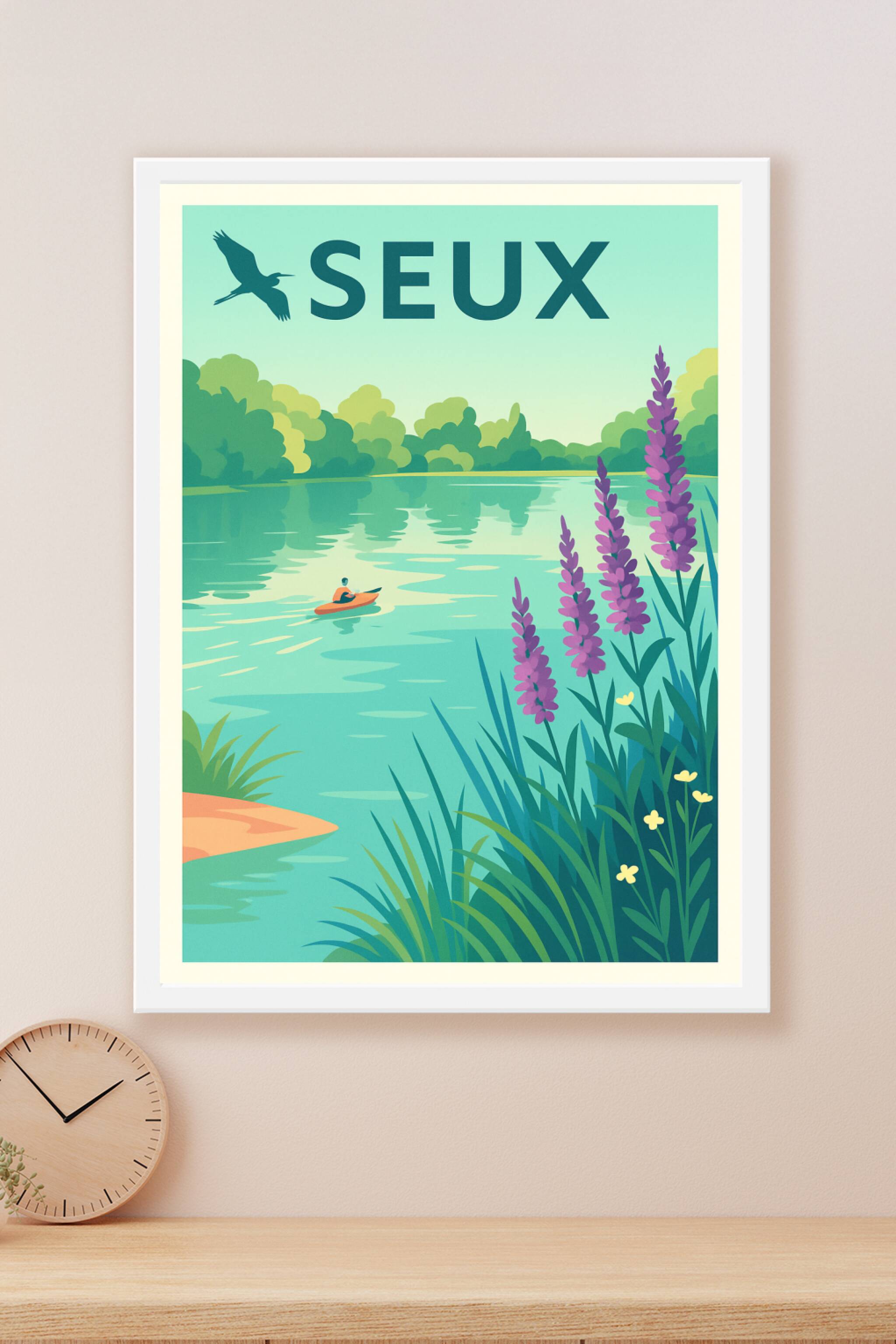 Découvrez la sérénité de Seux avec cette affiche illustrée, capturant un moment paisible au bord de l'eau où un kayakiste glisse doucement sur un l...