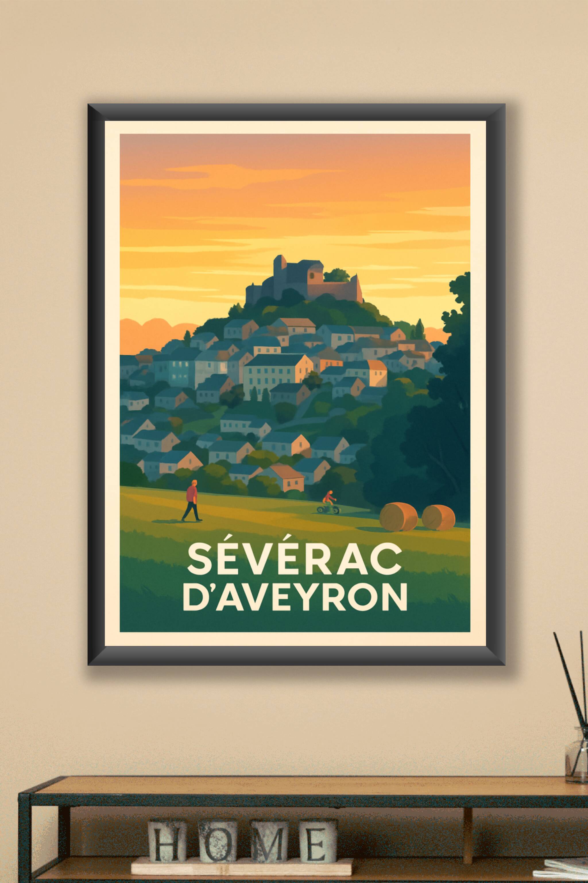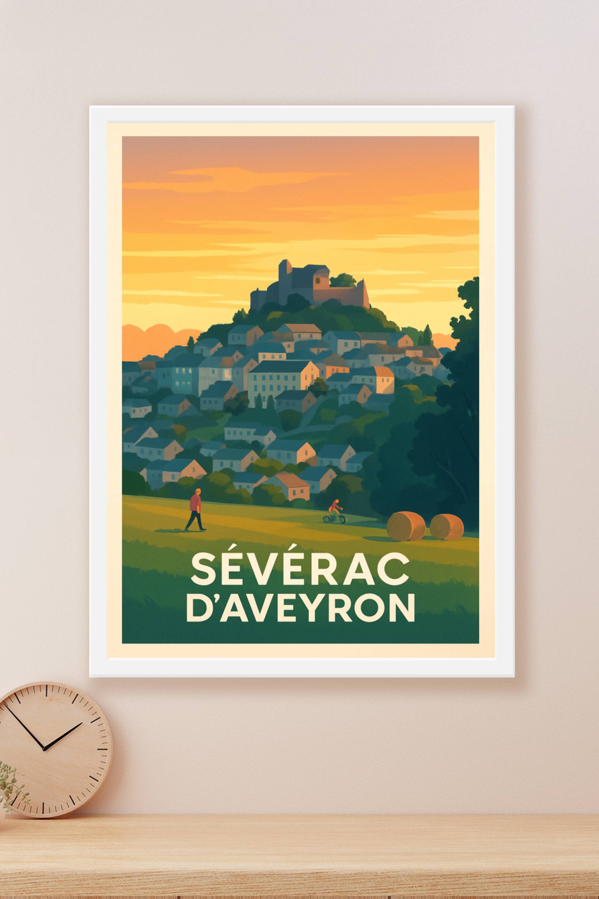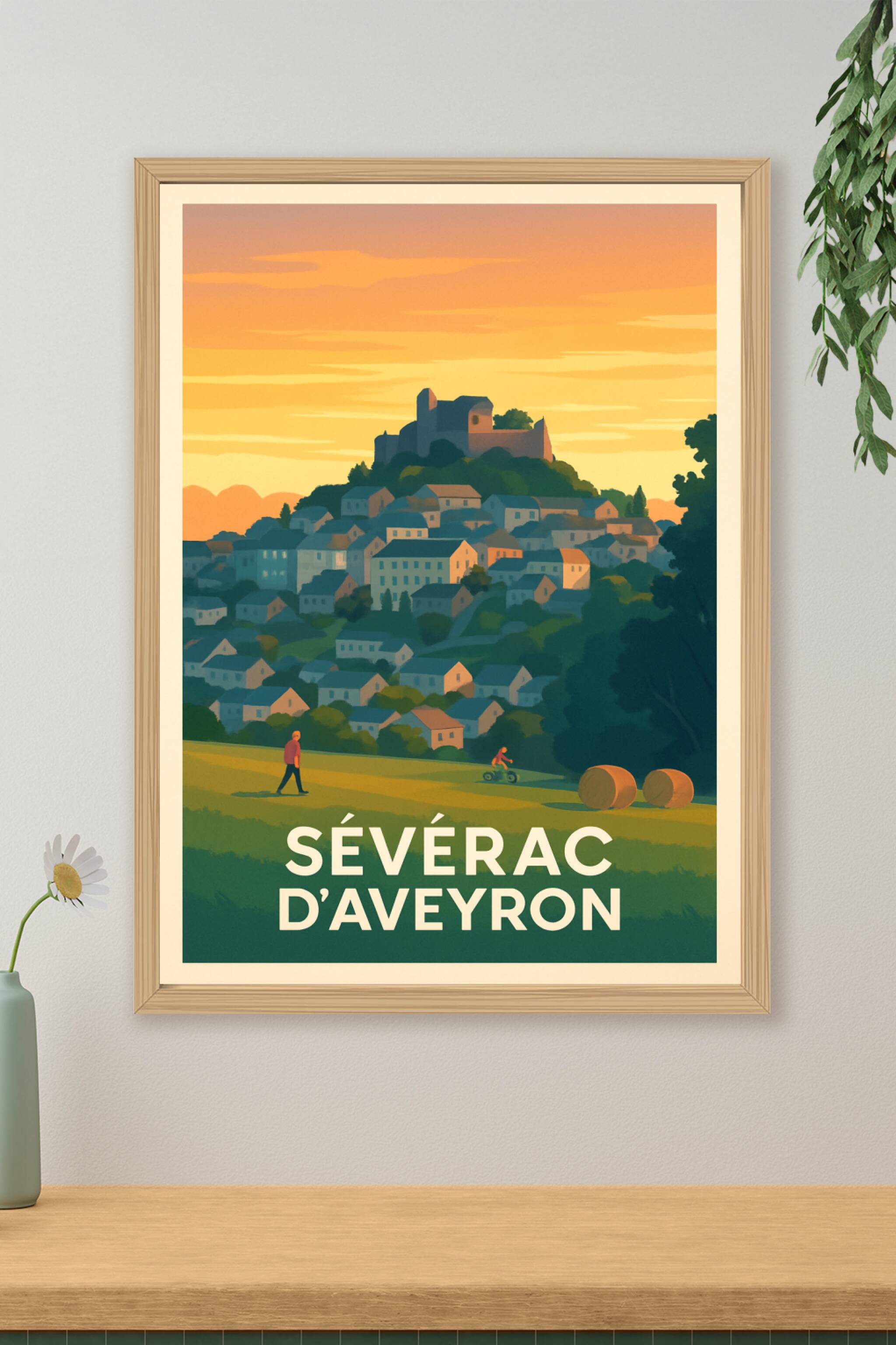 Découvrez la douceur de vivre de Séverac d'Aveyron à travers cette magnifique affiche illustrée aux tons chaleureux d'un coucher de soleil. Ce post...