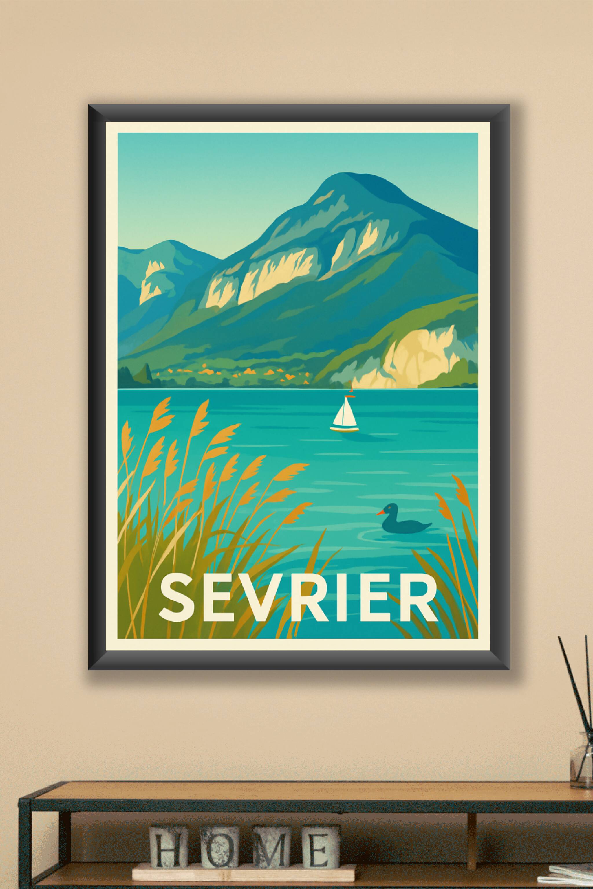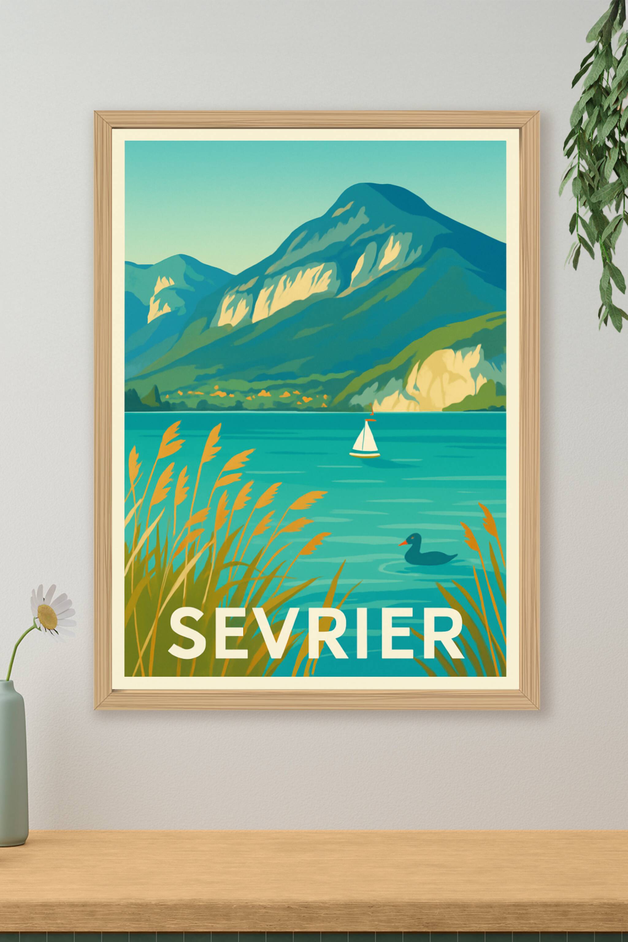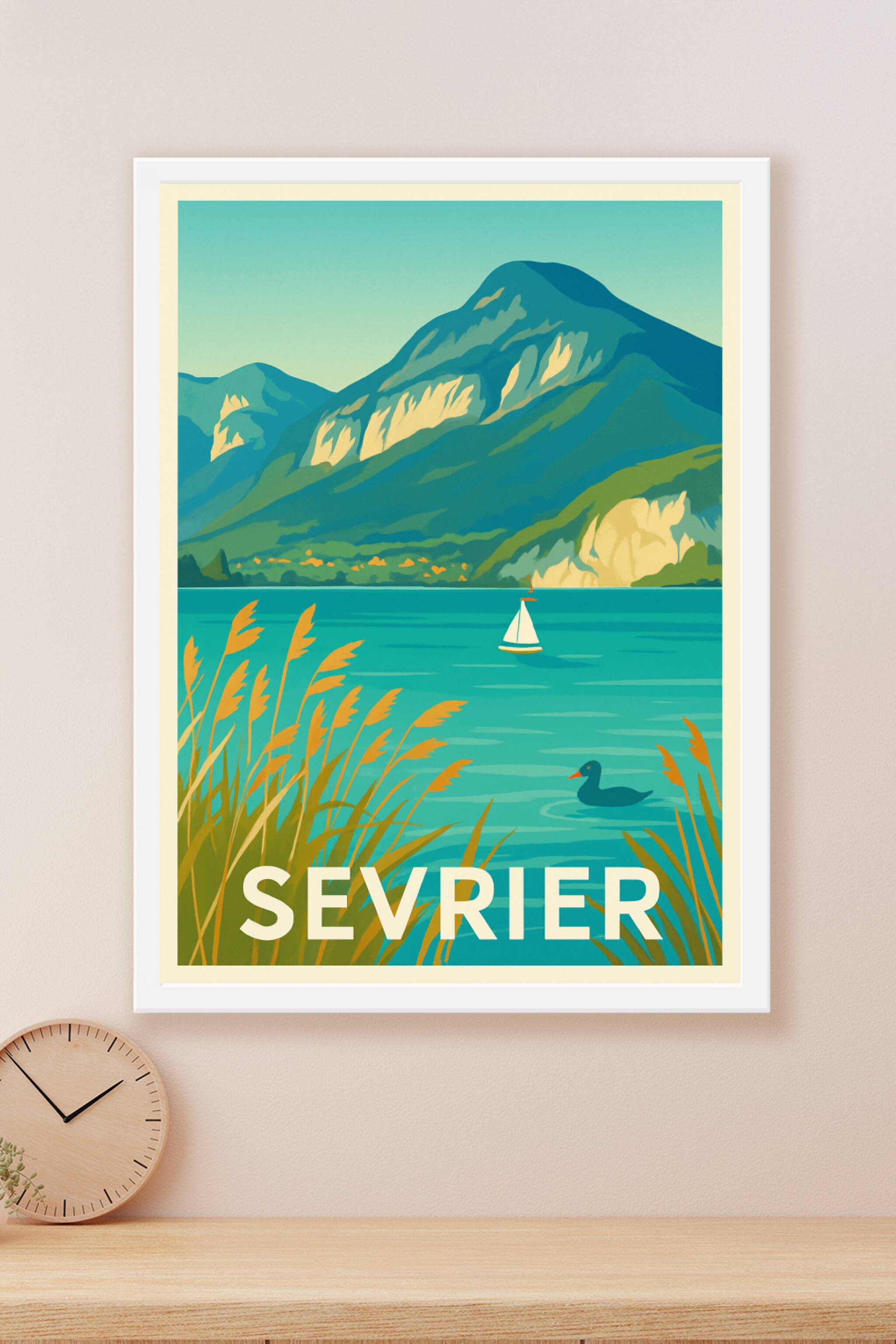 Découvrez la beauté naturelle de Sevrier avec ce poster illustré mettant en scène les montagnes majestueuses et les eaux turquoise du lac d'Annecy....