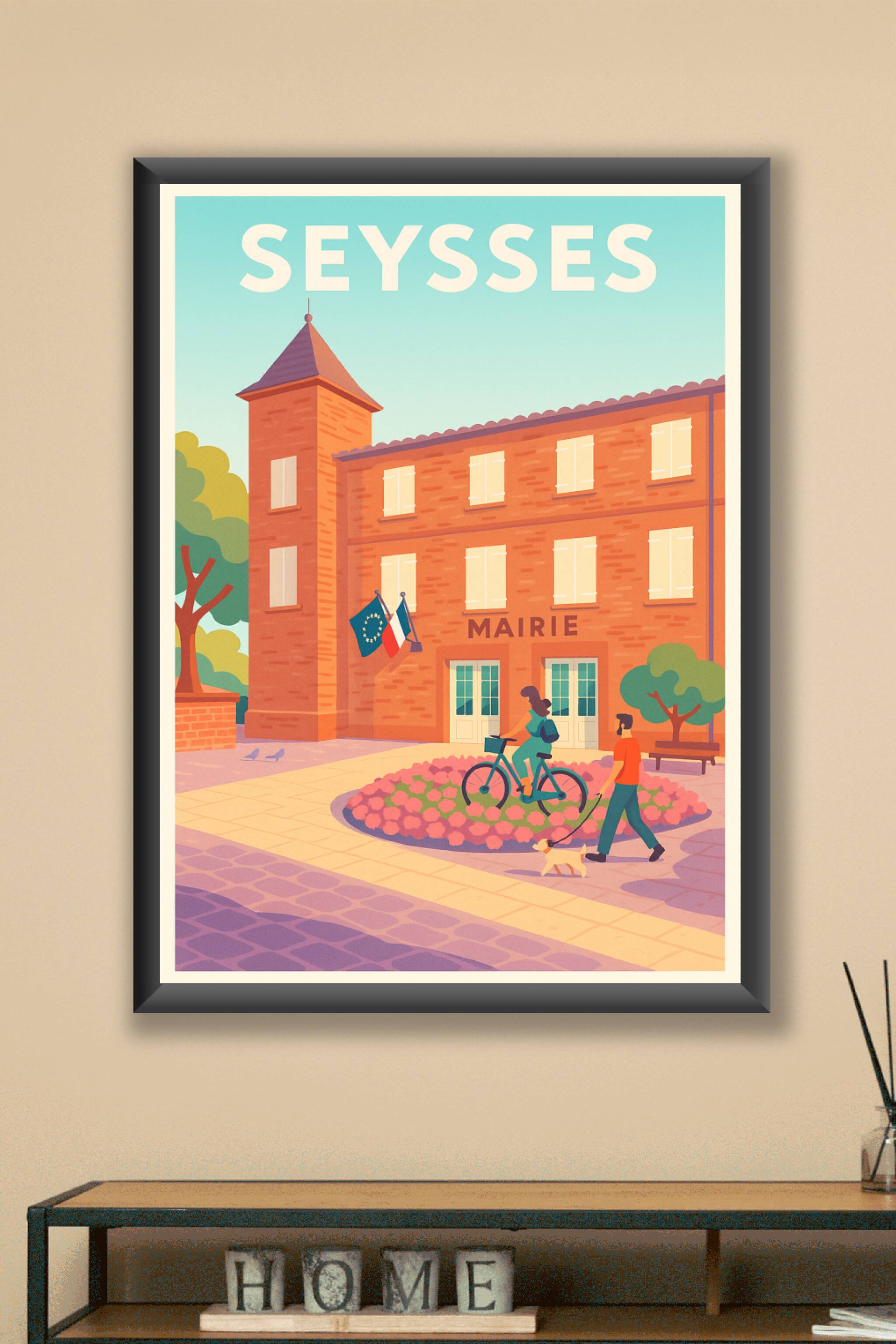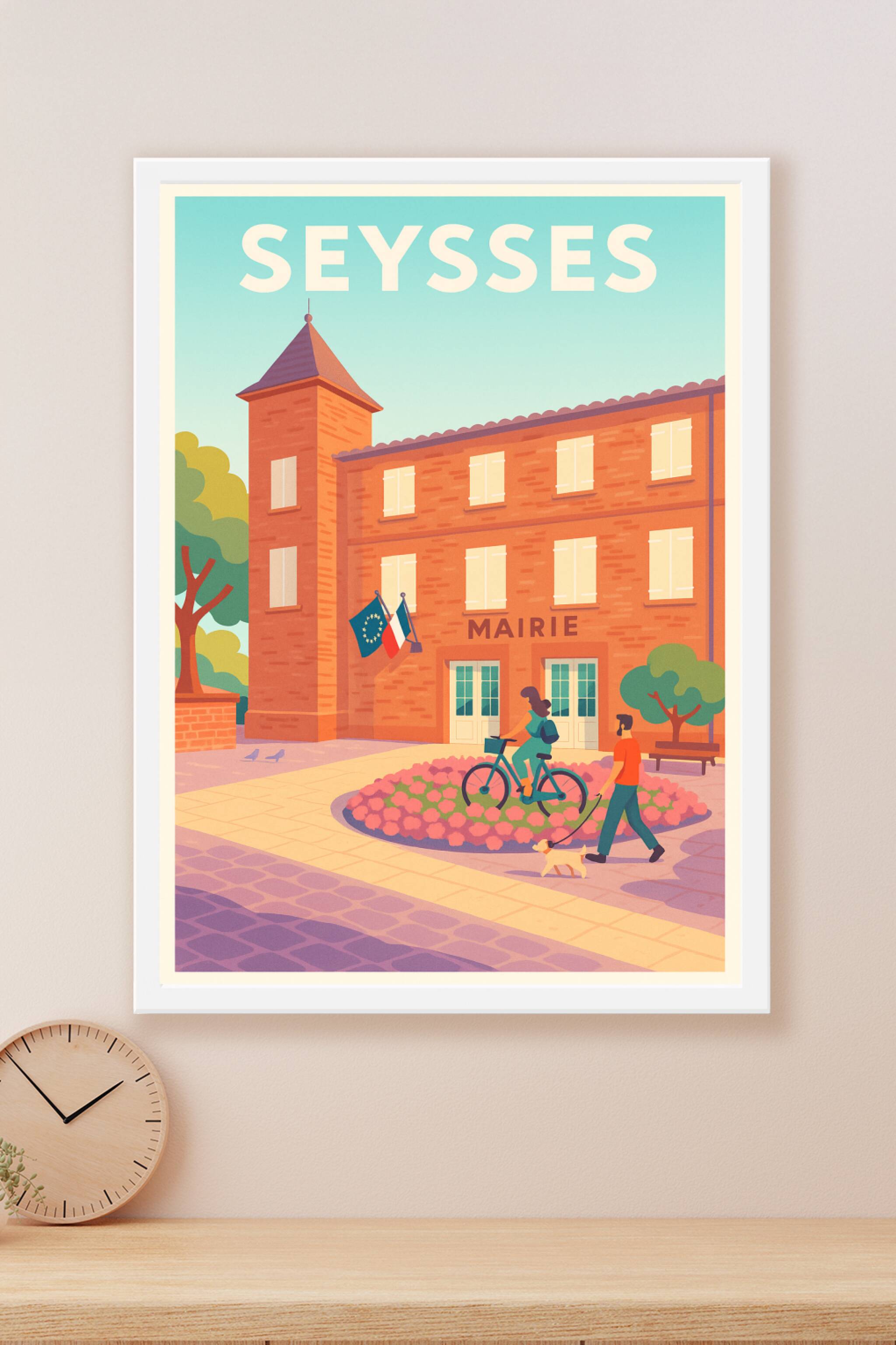 Découvrez l'ambiance paisible et authentique de Seysses à travers cette affiche illustrée mettant en scène la mairie, symbole du village. Le poster...