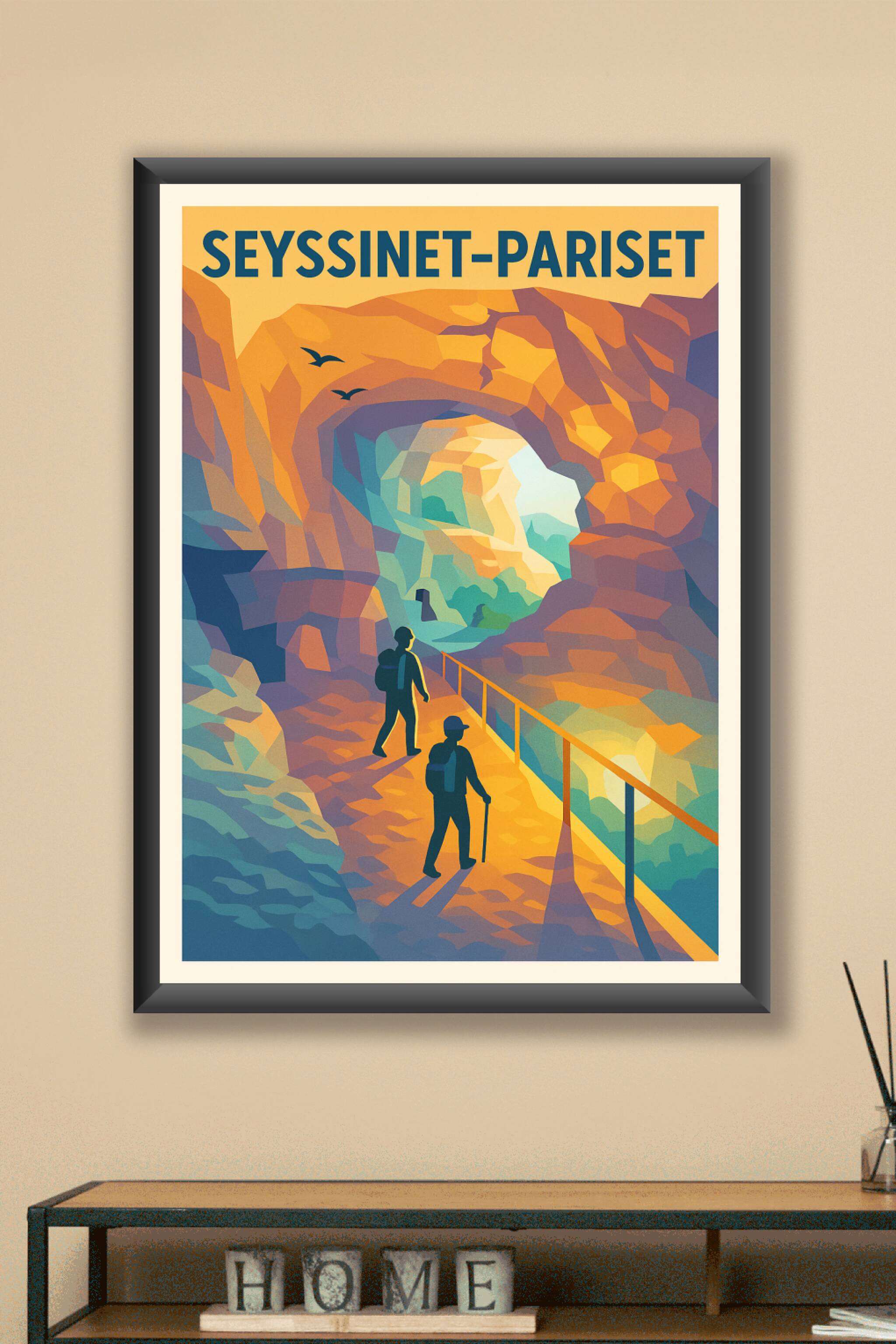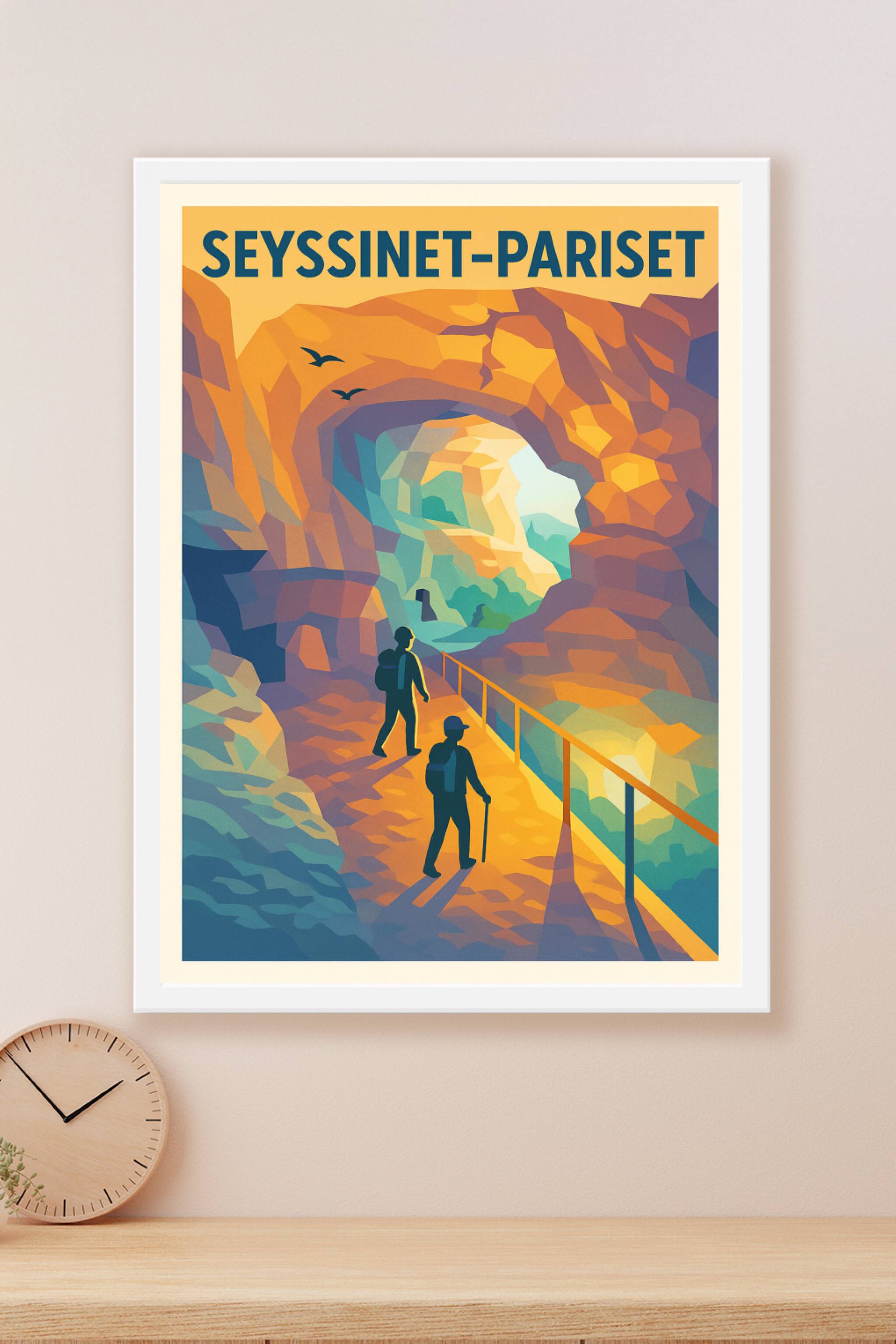 Explorez la beauté naturelle et l'aventure à Seyssinet-Pariset avec cette affiche au style graphique coloré, illustrant une scène de randonnée dans...