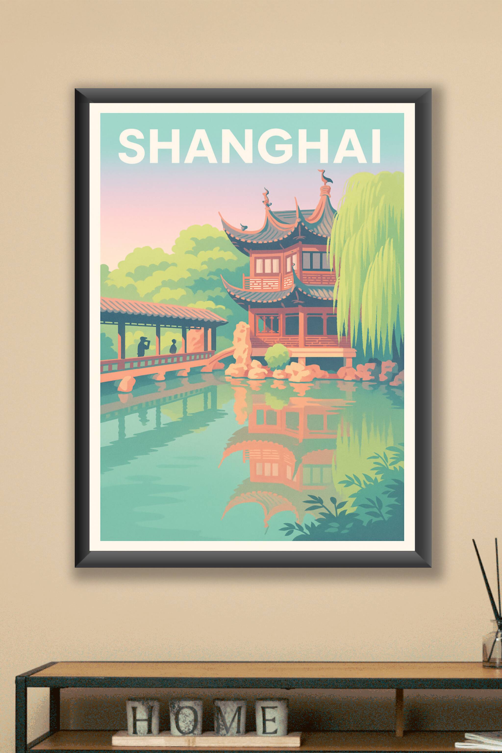 Découvrez l'élégance intemporelle de Shanghai avec cette affiche illustrée représentant un pavillon traditionnel au bord de l'eau, baigné dans des ...