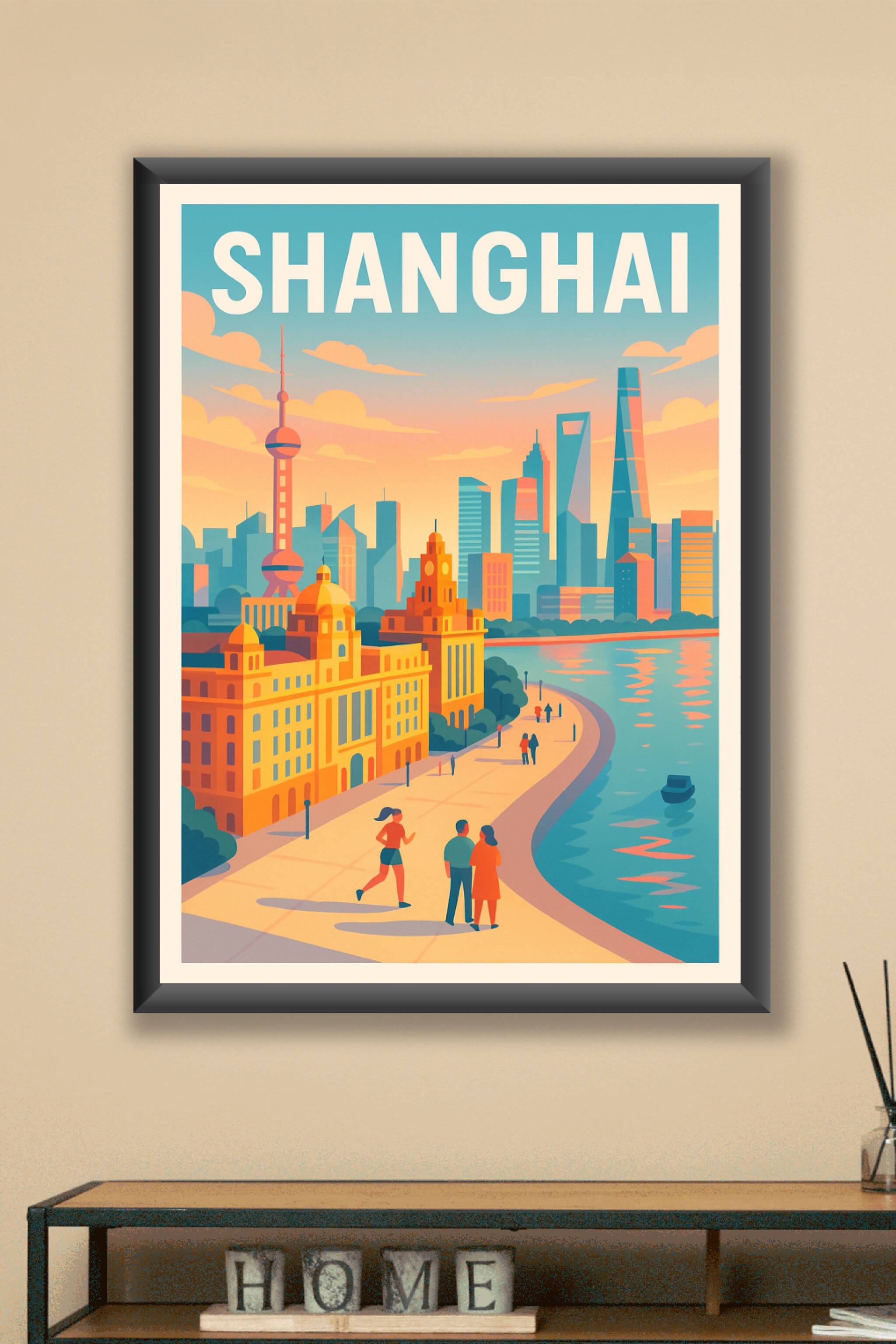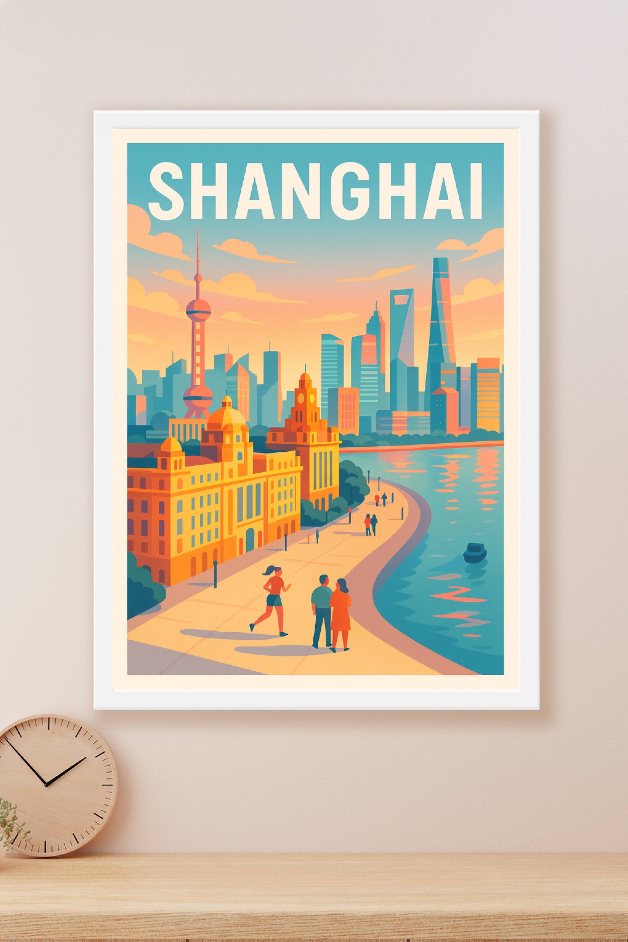 Découvrez Shanghai sous un nouveau jour avec cette affiche illustrée qui capture la beauté lumineuse de son célèbre front de mer au coucher du sole...