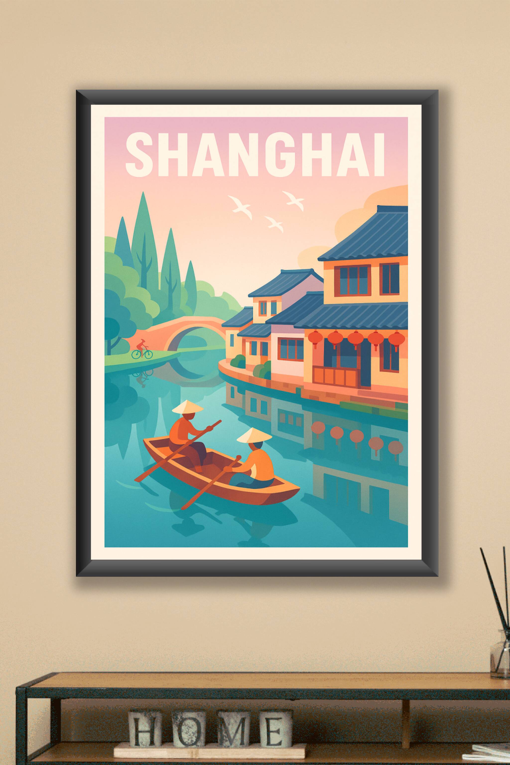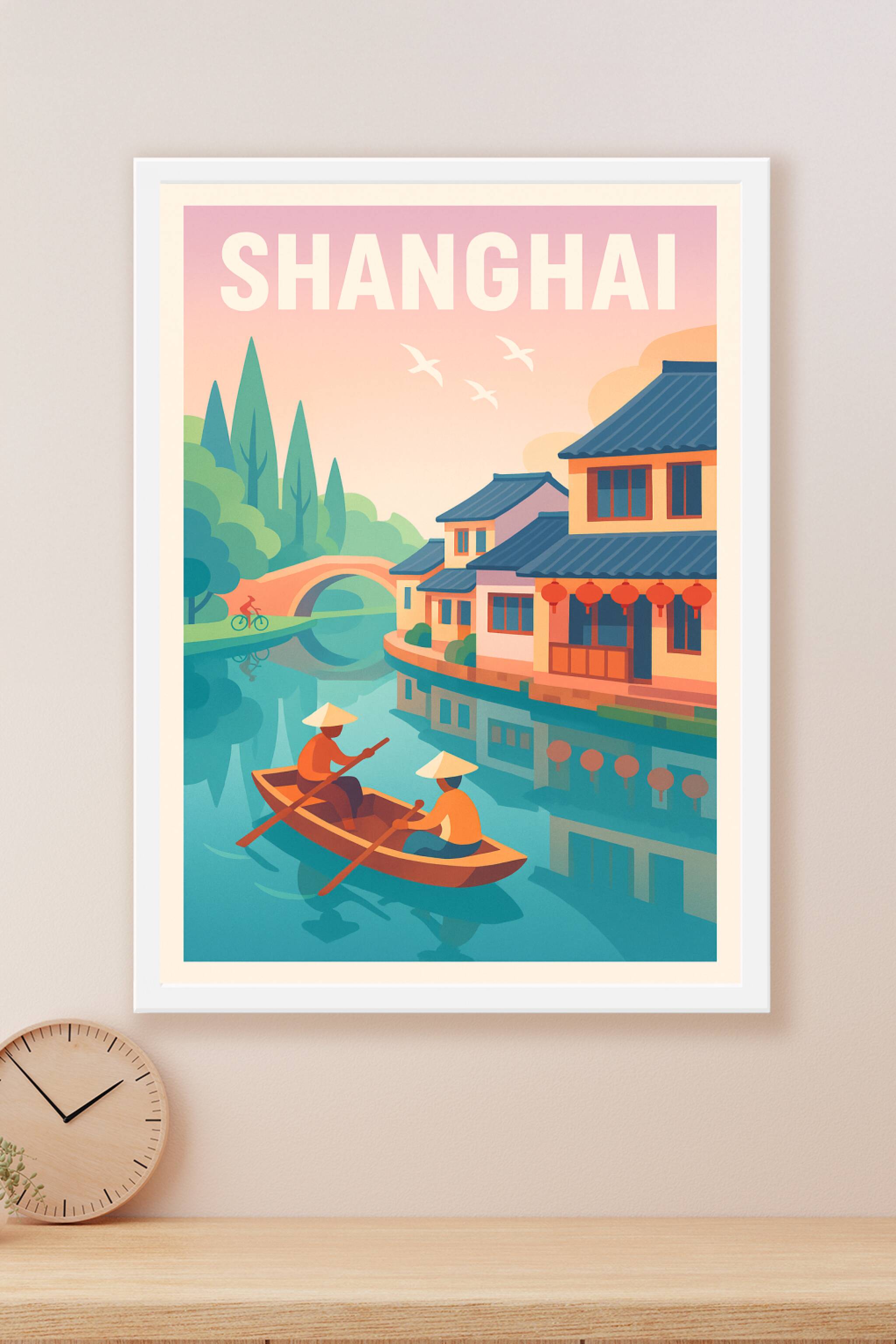 Découvrez la douceur et le charme paisible de Shanghai avec cette affiche illustrée au style rétro moderne. Ce poster capture un moment tranquille ...