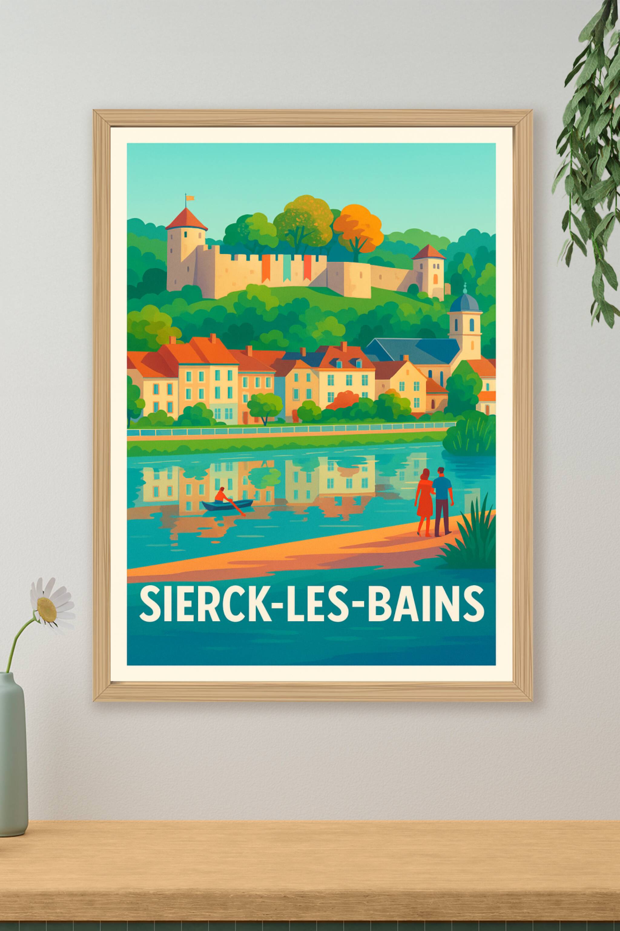 Découvrez la douceur de vivre de Sierck-les-Bains avec cette magnifique affiche illustrée, mettant en scène ses maisons pittoresques, son château h...
