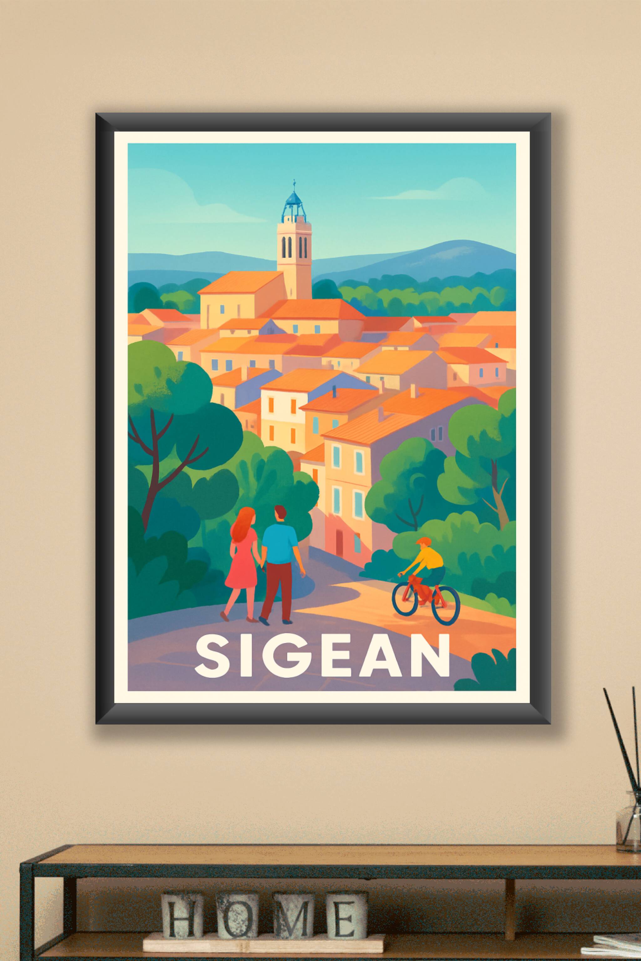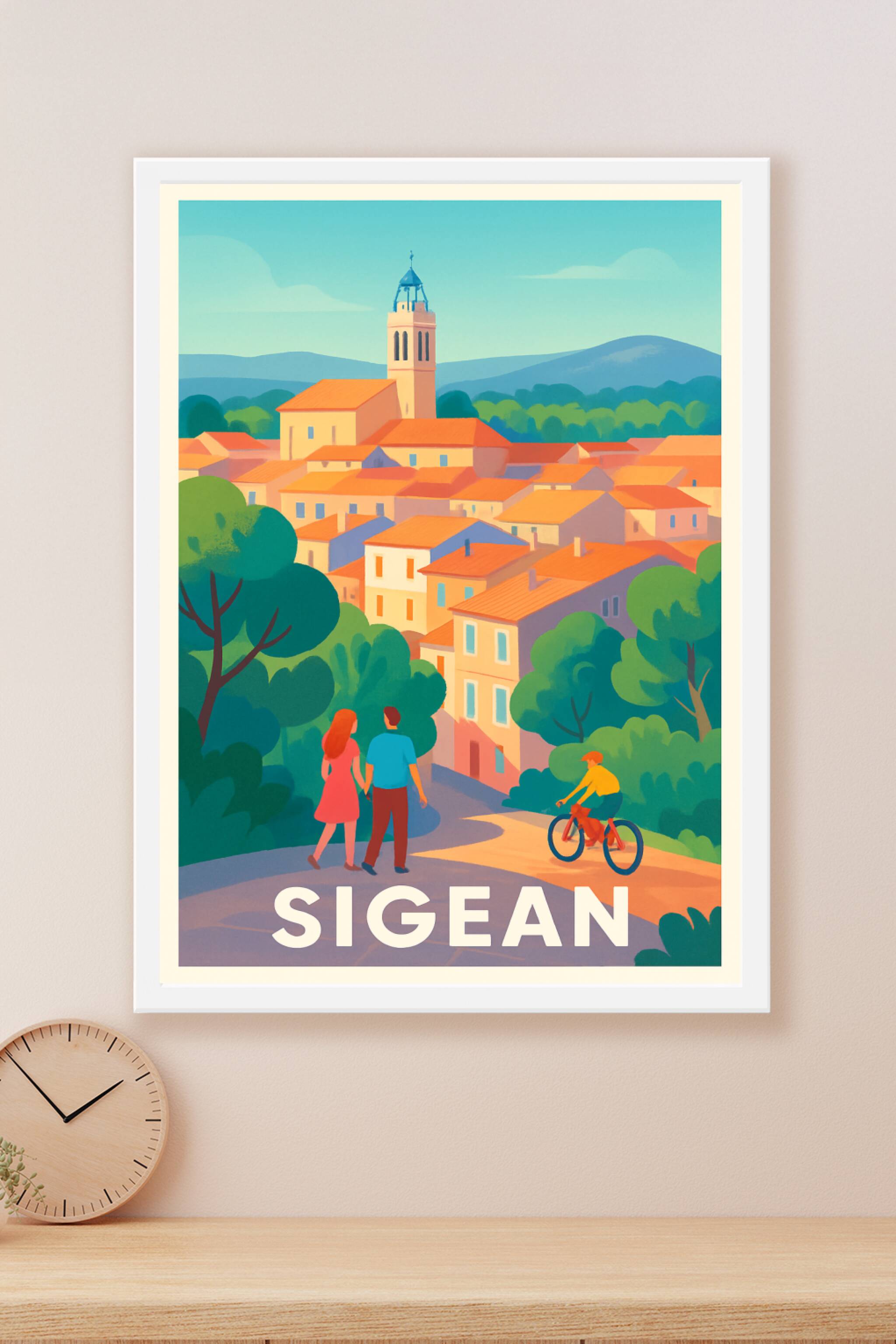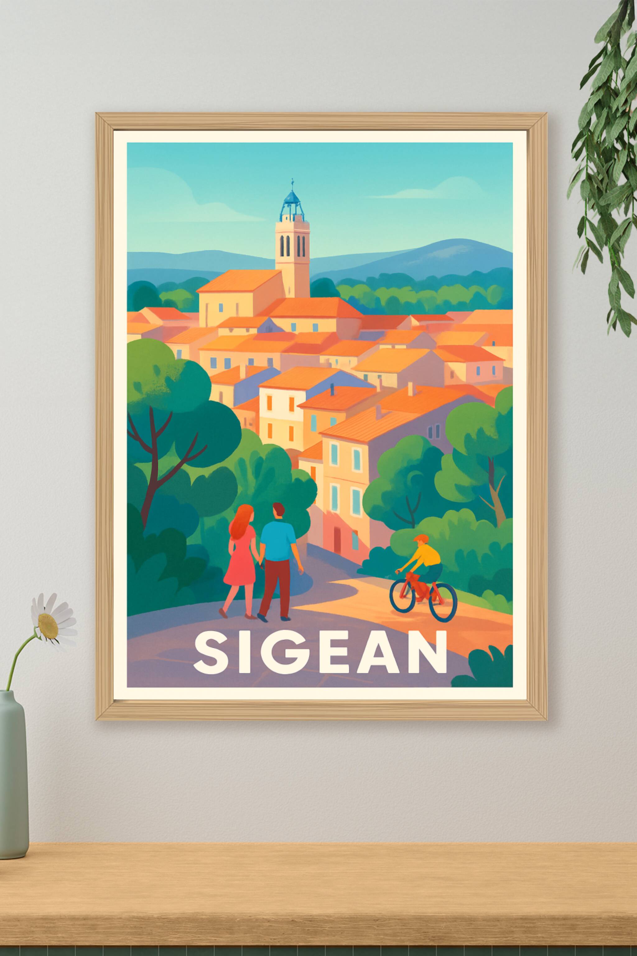 Découvrez la douceur de vivre dans le village pittoresque de Sigean avec cette affiche illustrée aux couleurs chaudes et harmonieuses. Cette scène ...