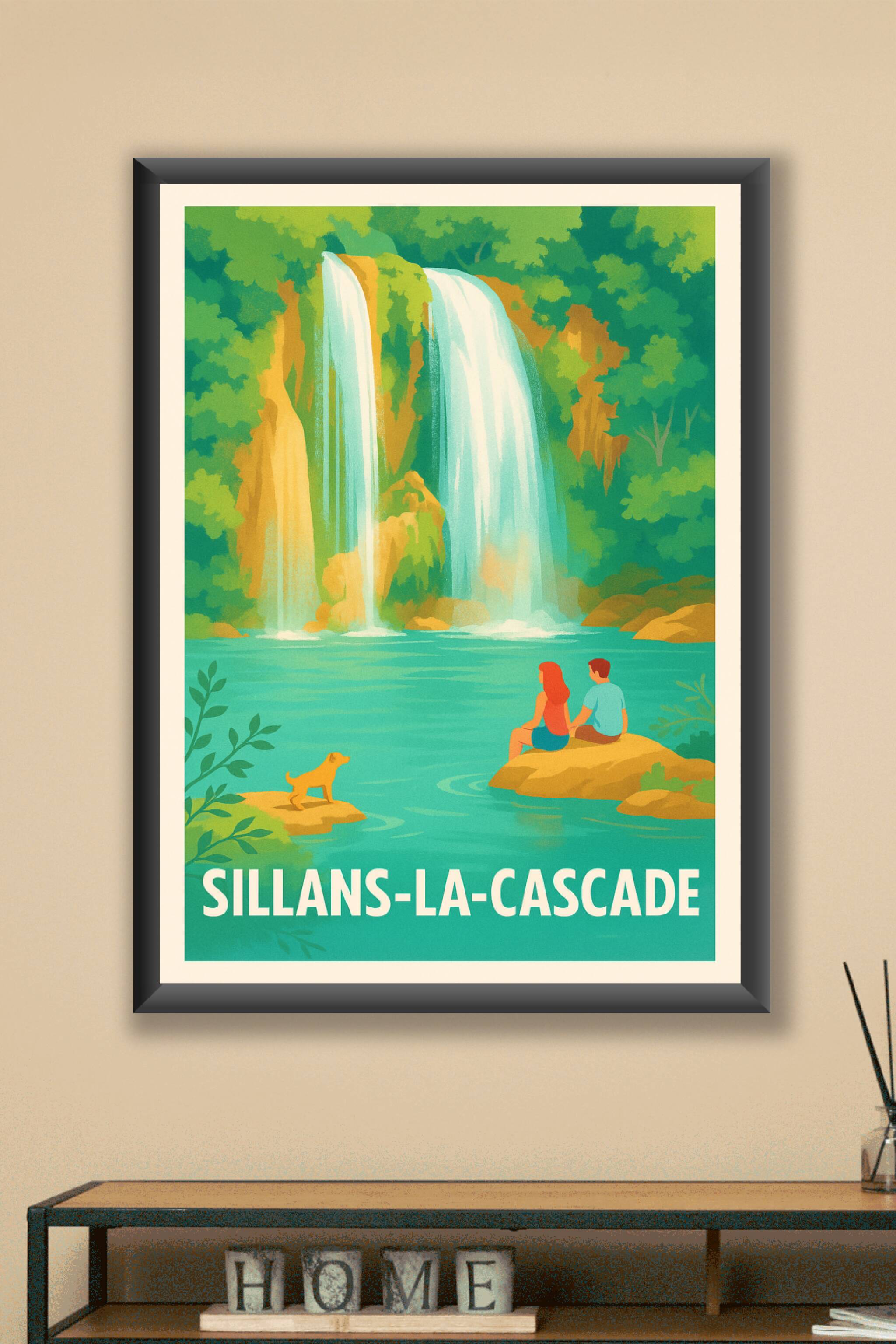 Découvrez la beauté sereine de Sillans-la-Cascade avec cette affiche illustrée, qui capture la majesté de ses cascades et la quiétude de son bassin turquoise. Une scène idyllique où un couple et leur chien profitent d’un instant de calme au bord de l’eau, entourés d’une végétation luxuriante.Ce poster est imprimé en tirage "Fine Art" sur papier coton 305g, garantissant des couleurs vives et une qualité d'impression exceptionnelle. Disponible en plusieurs formats, de A1 à A4, avec ou sans cadre, cette affiche apportera une touche de fraîcheur et d’évasion à votre intérieur. Offrez-vous un souvenir ou une décoration raffinée, 100% fabriquée en France, parfaite pour les amoureux de la nature et des paysages pittoresques.