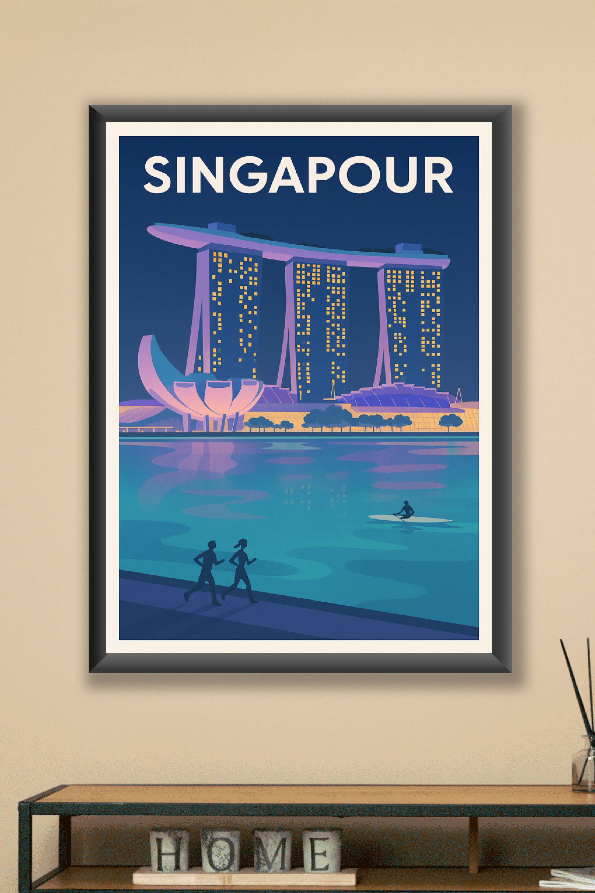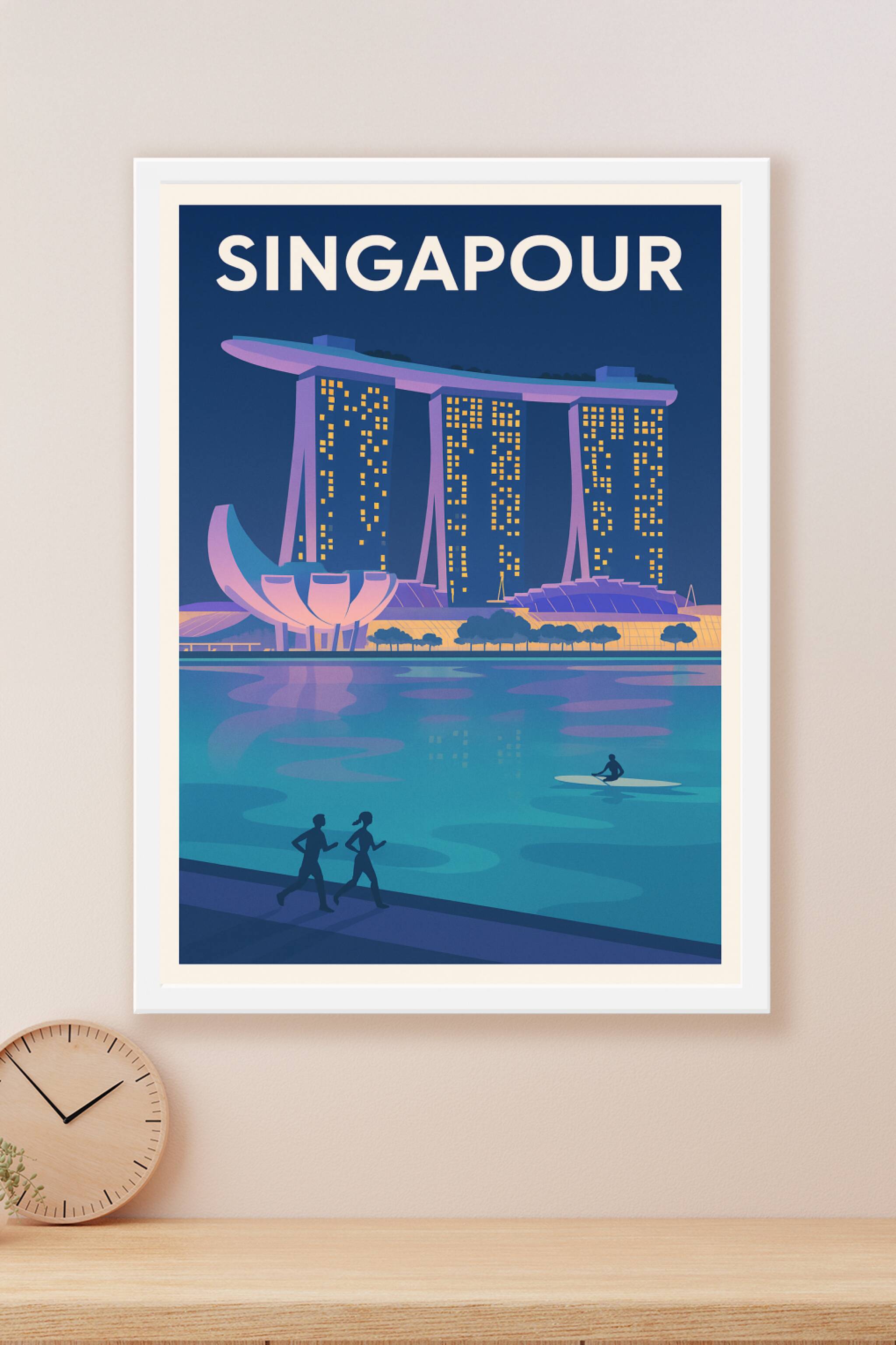 Découvrez la magie de Singapour avec cette affiche évoquant le légendaire Marina Bay Sands illuminé à la tombée de la nuit. Ce poster au style rétr...
