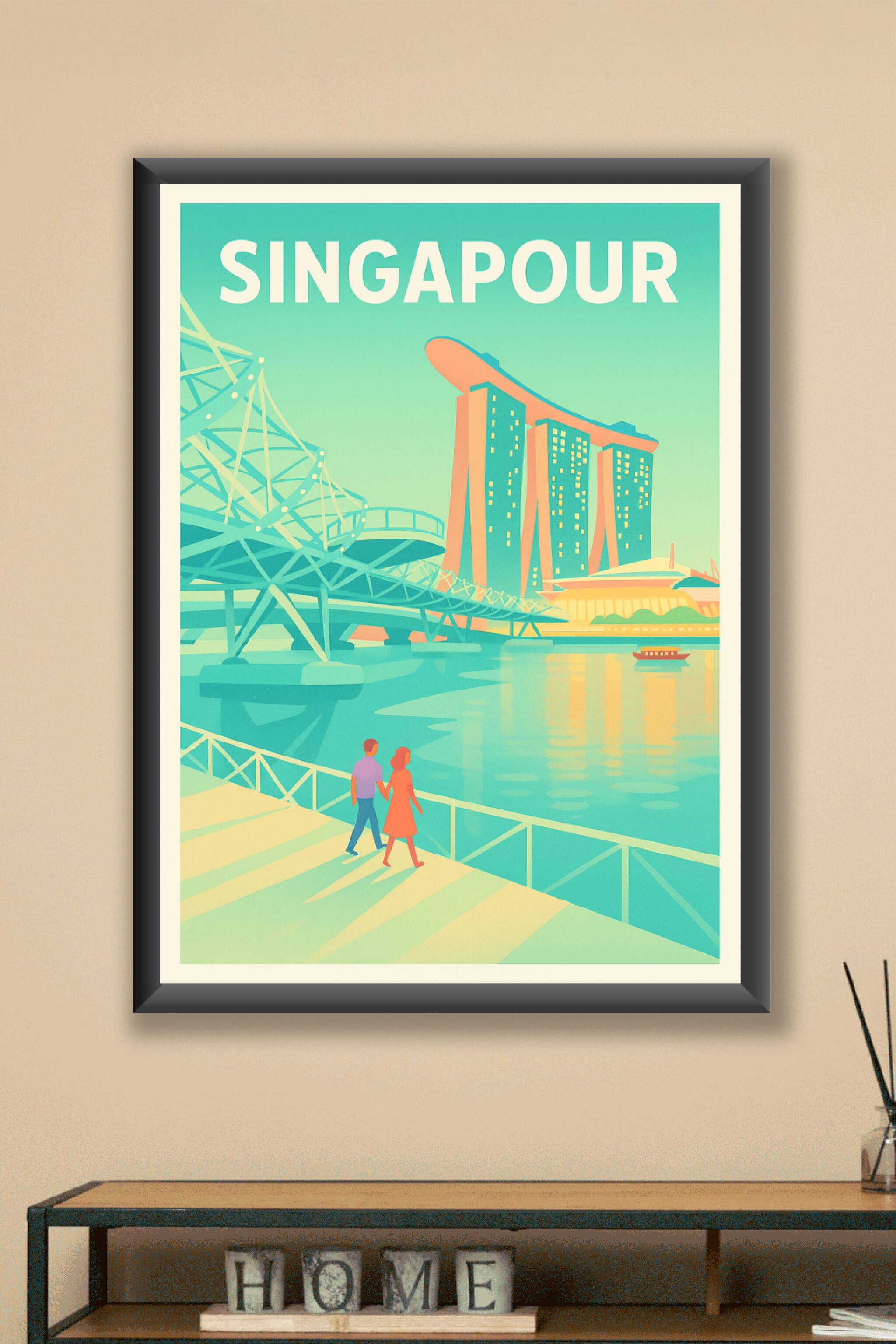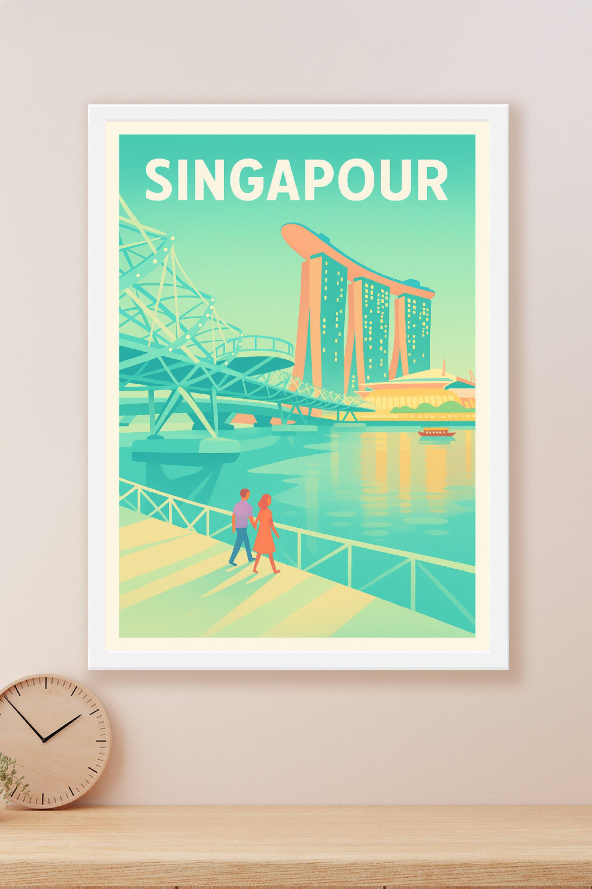 Découvrez le charme unique de Singapour avec cette affiche illustrée mettant en scène l'emblématique Marina Bay Sands et la passerelle en hélice, s...
