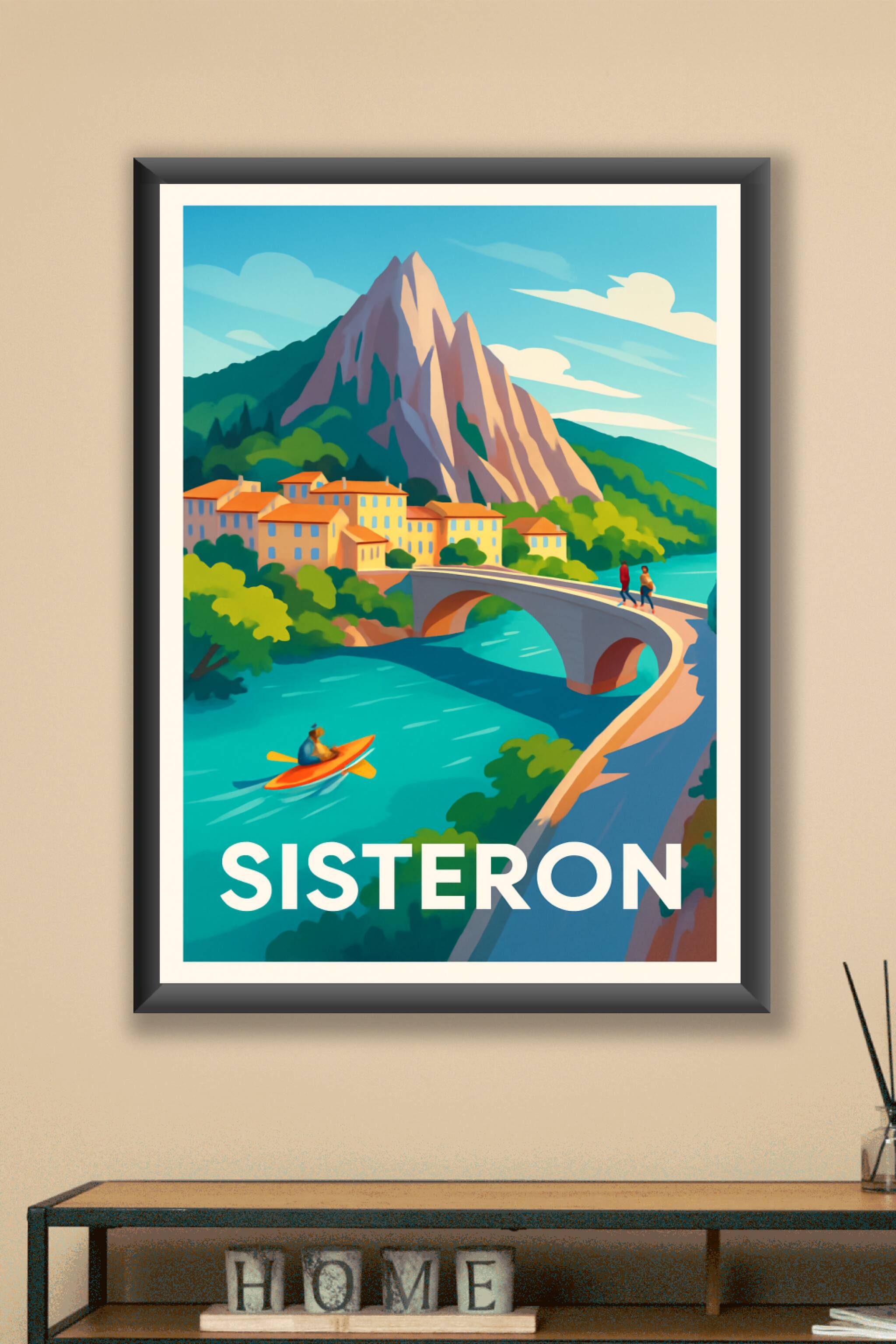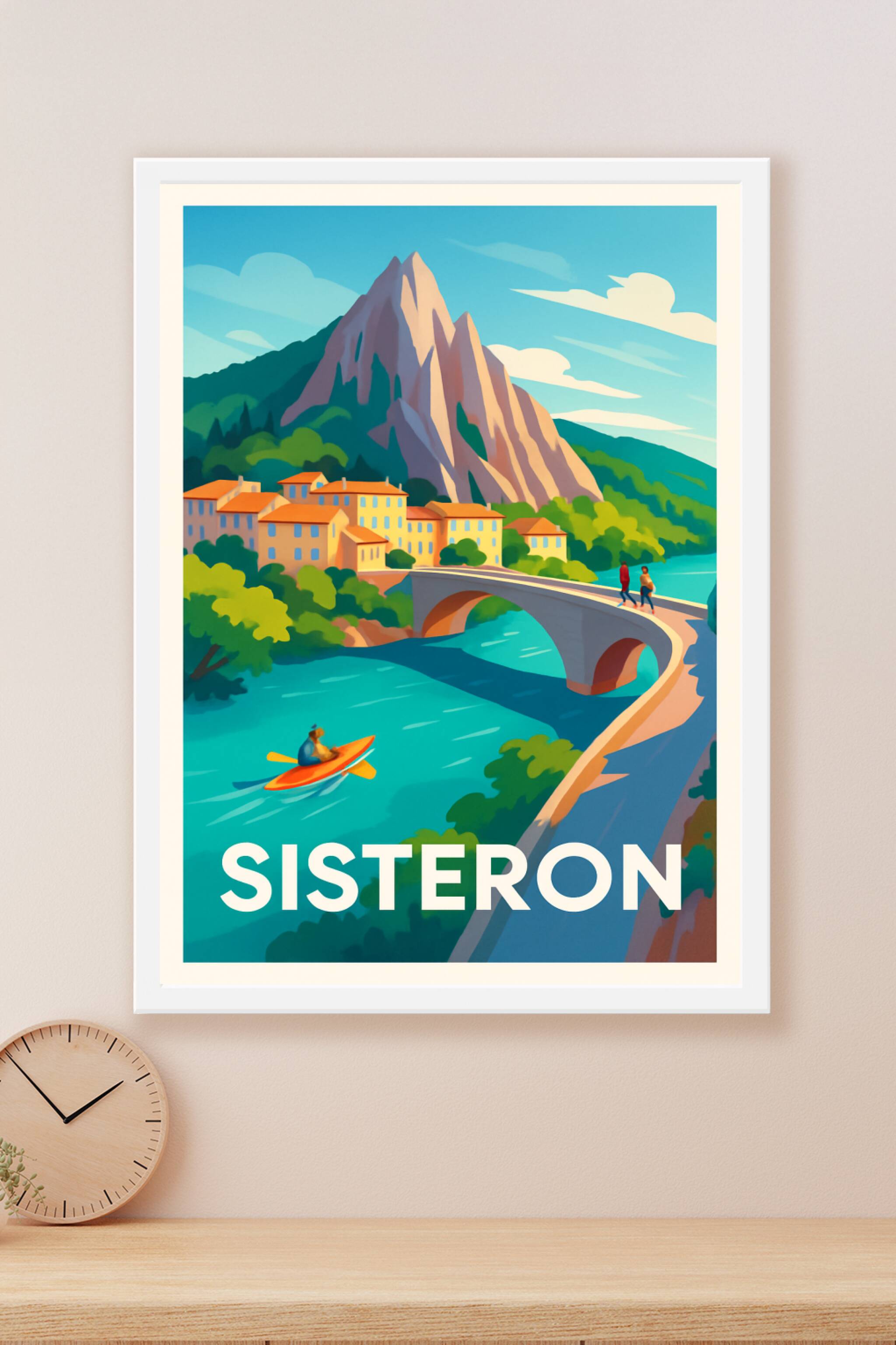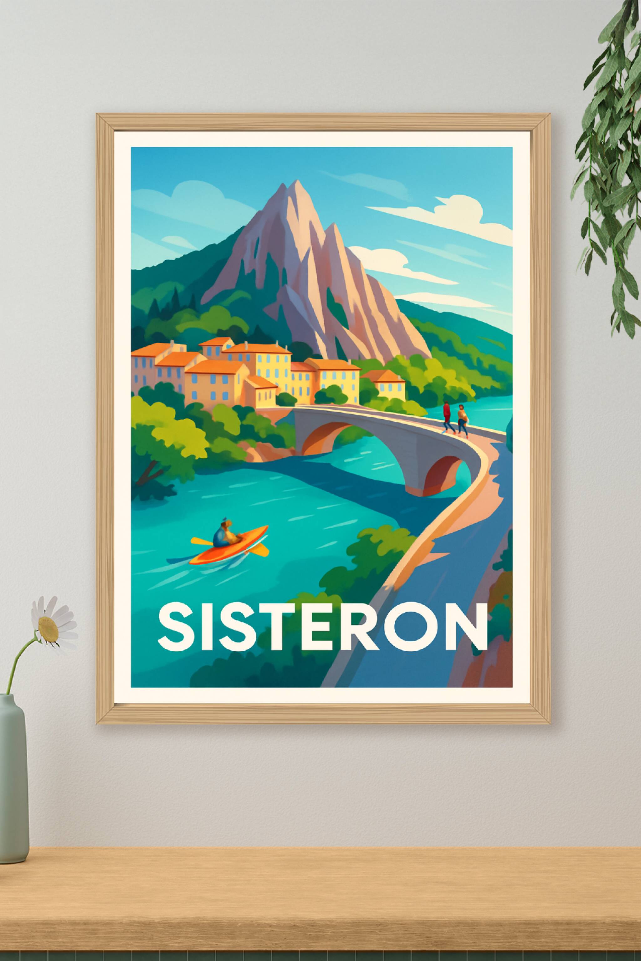 Découvrez l'essence de Sisteron avec cette affiche au style vivant et coloré, qui met en scène la célèbre citadelle, le pont pittoresque et les eau...