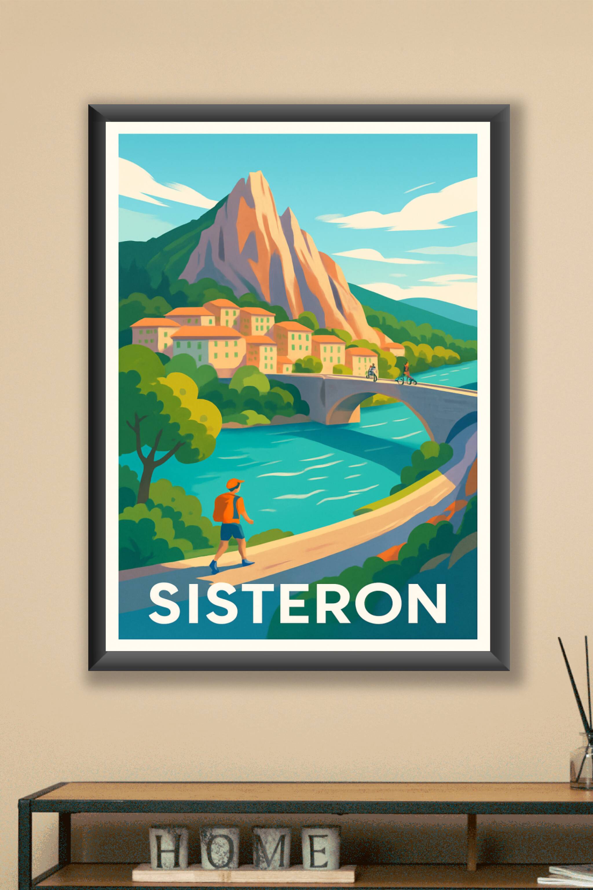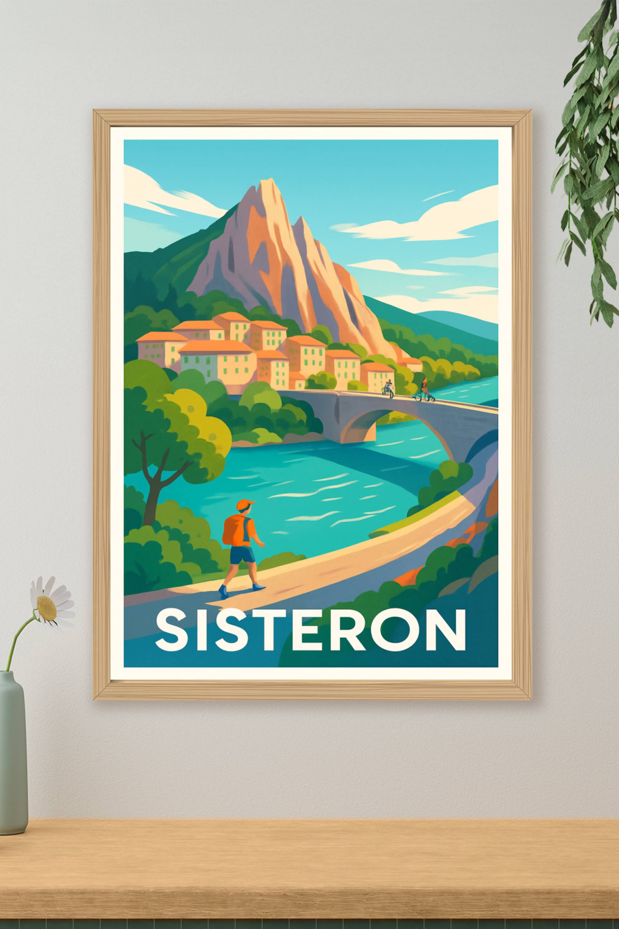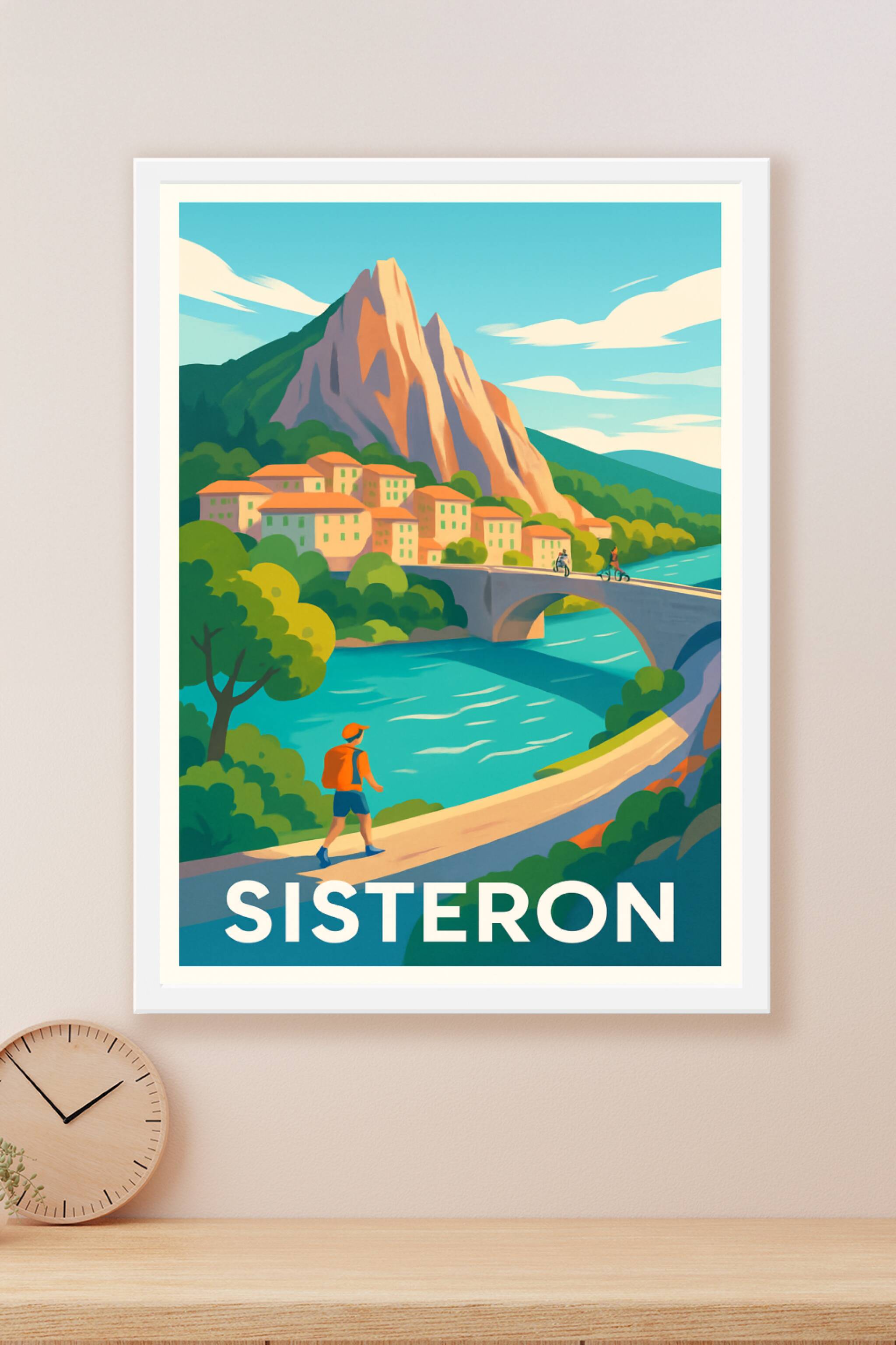 Découvrez Sisteron à travers cette affiche illustrée au style rétro contemporain qui met en lumière la majestueuse montagne de la Citadelle surplom...