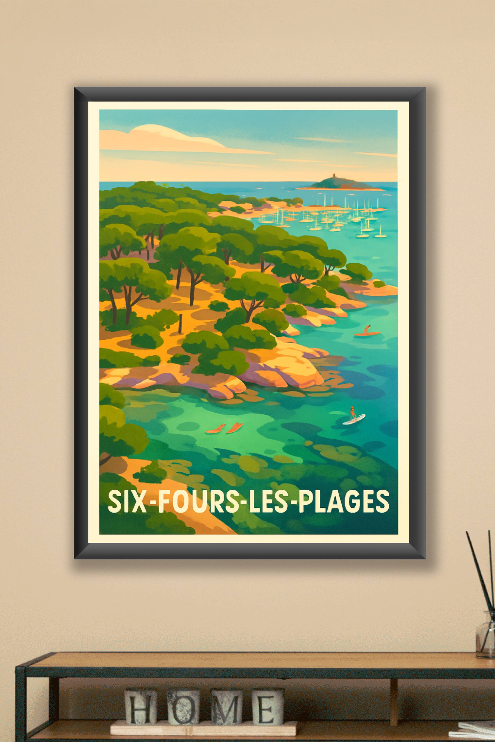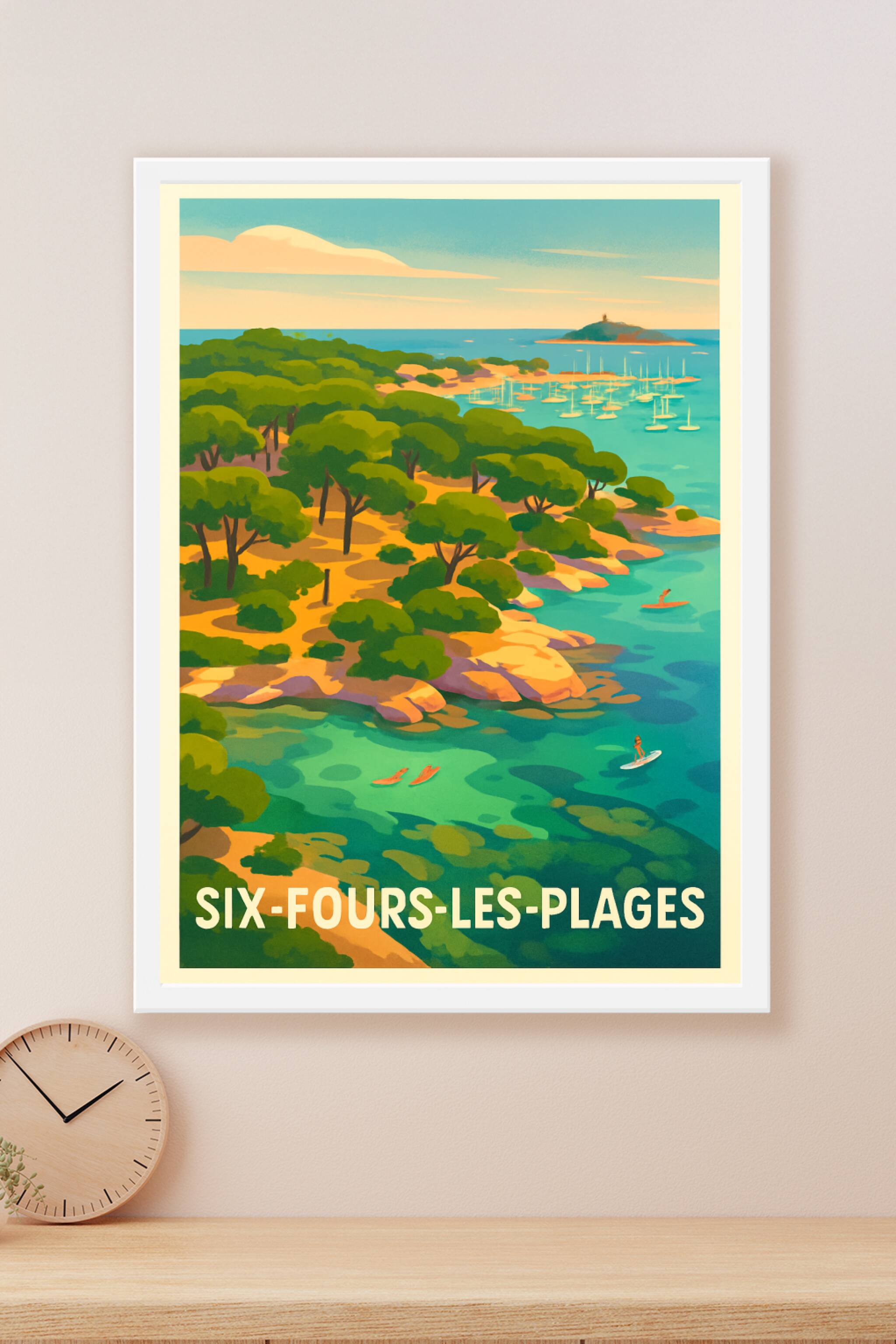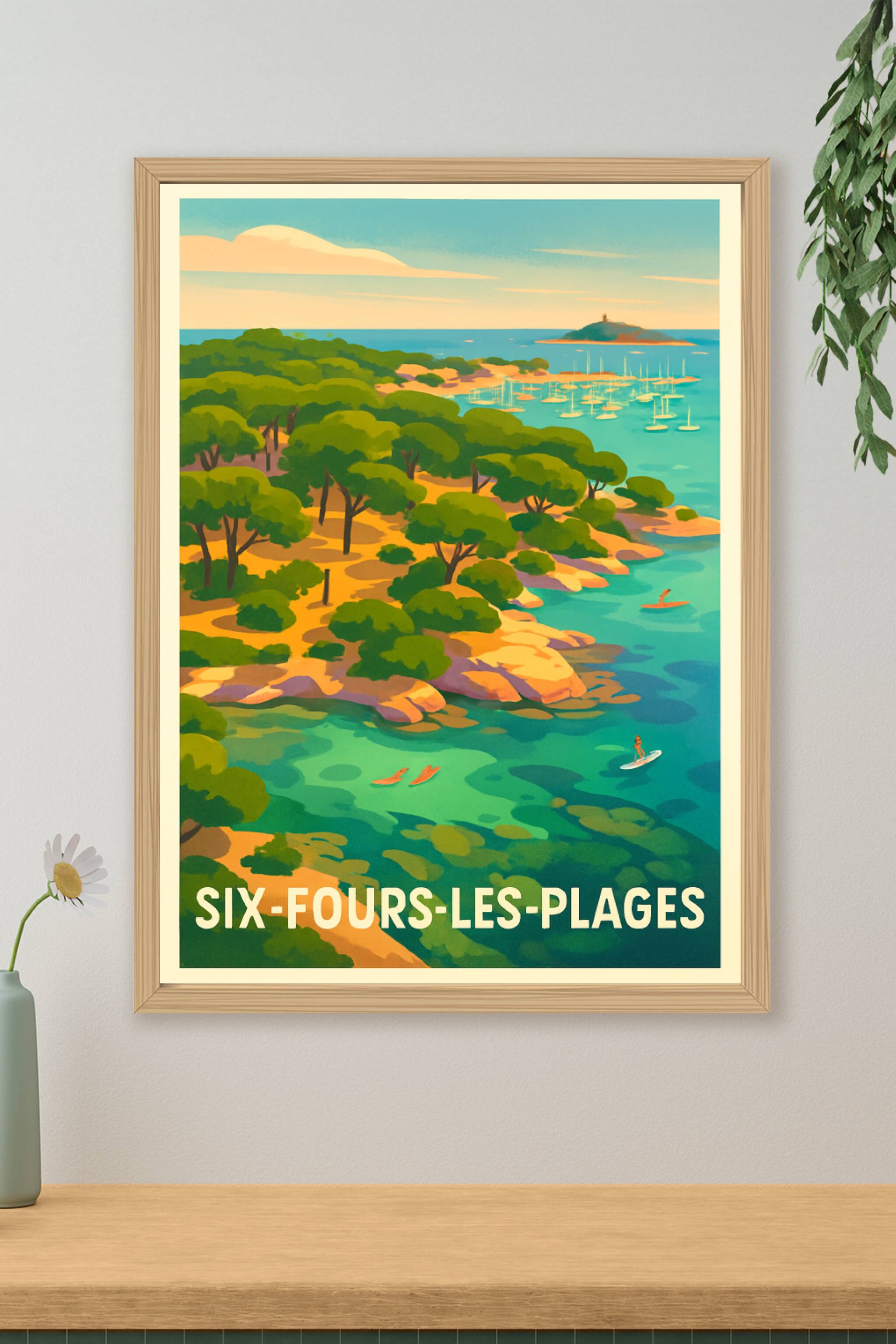 Découvrez la beauté authentique de Six-Fours-les-Plages à travers cette affiche au style vintage illustré, révélant ses criques turquoise et ses fo...