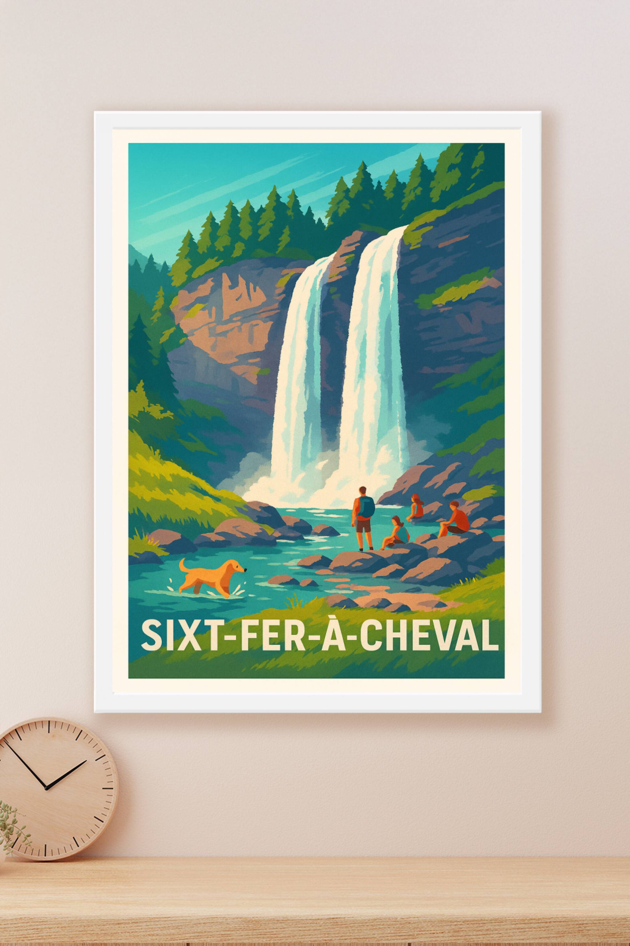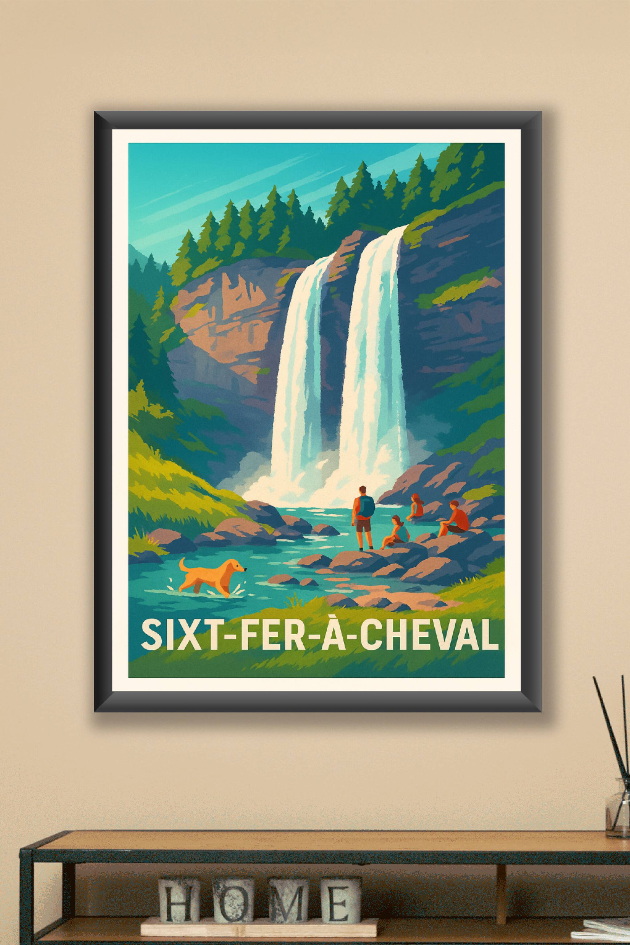 Découvrez la beauté spectaculaire de Sixt-Fer-à-Cheval avec cette affiche illustrée mettant en scène une cascade majestueuse entourée de forêts épa...