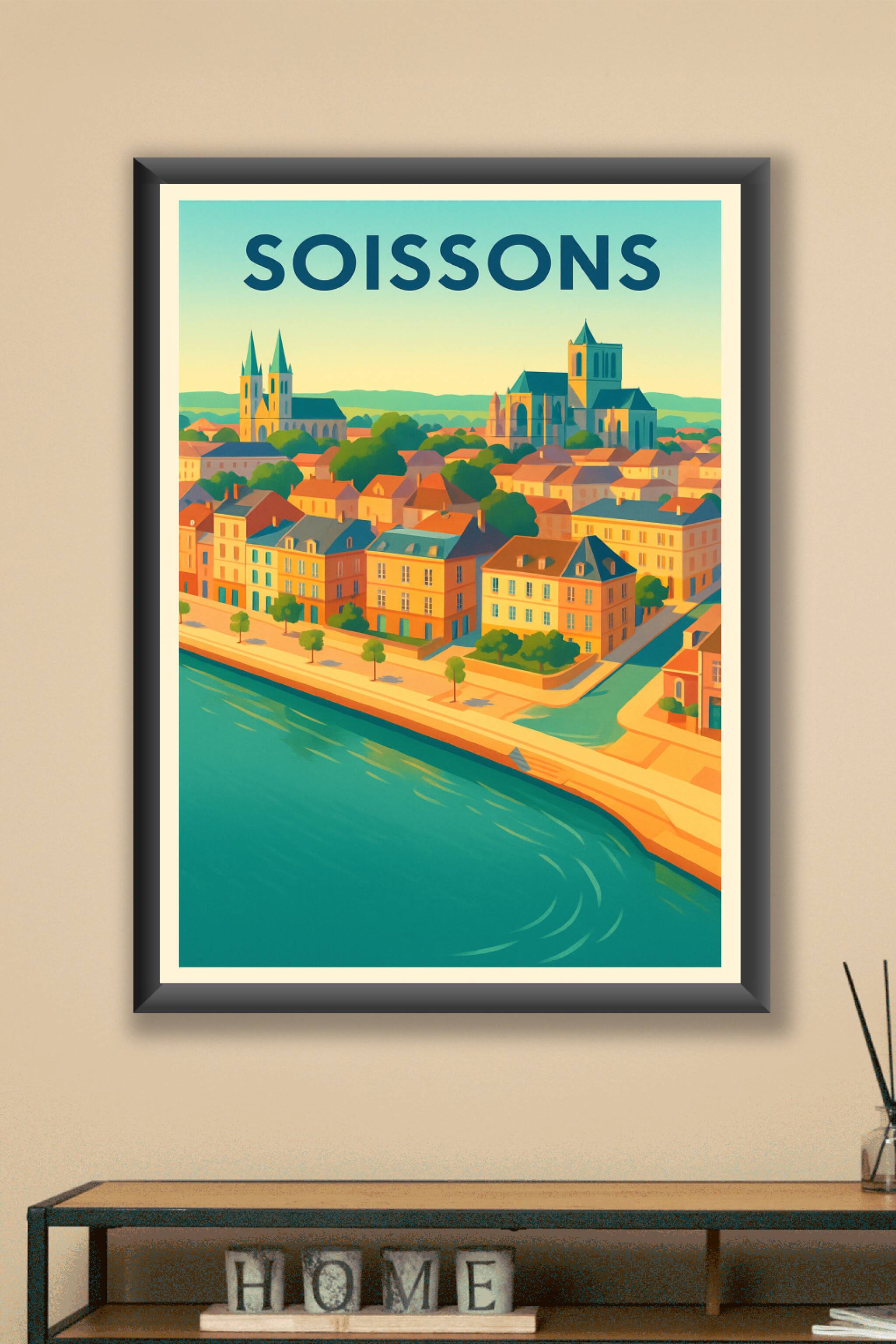 Découvrez le charme intemporel de Soissons avec cette affiche illustrée qui met en lumière les bâtiments emblématiques et le cadre paisible au bord...