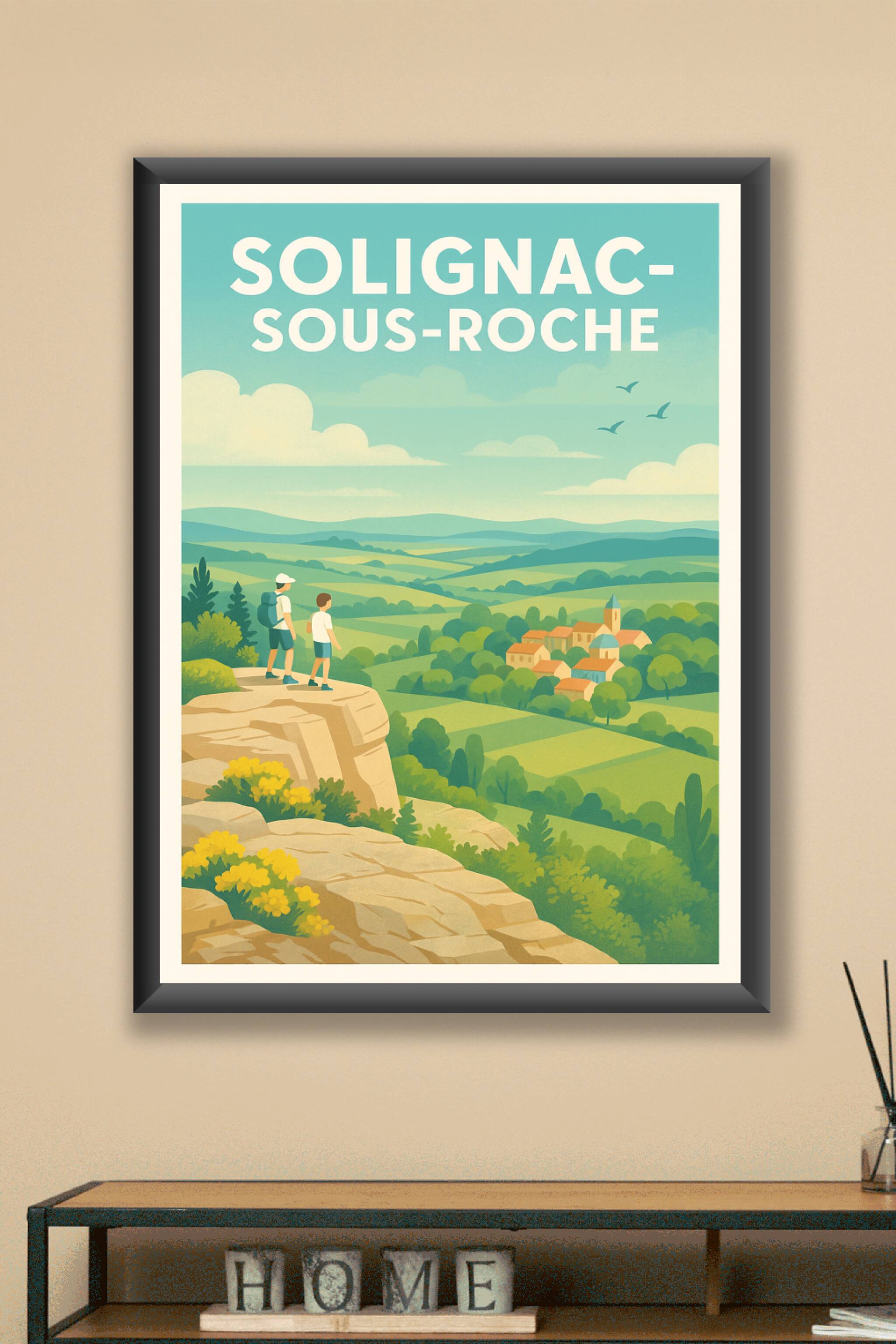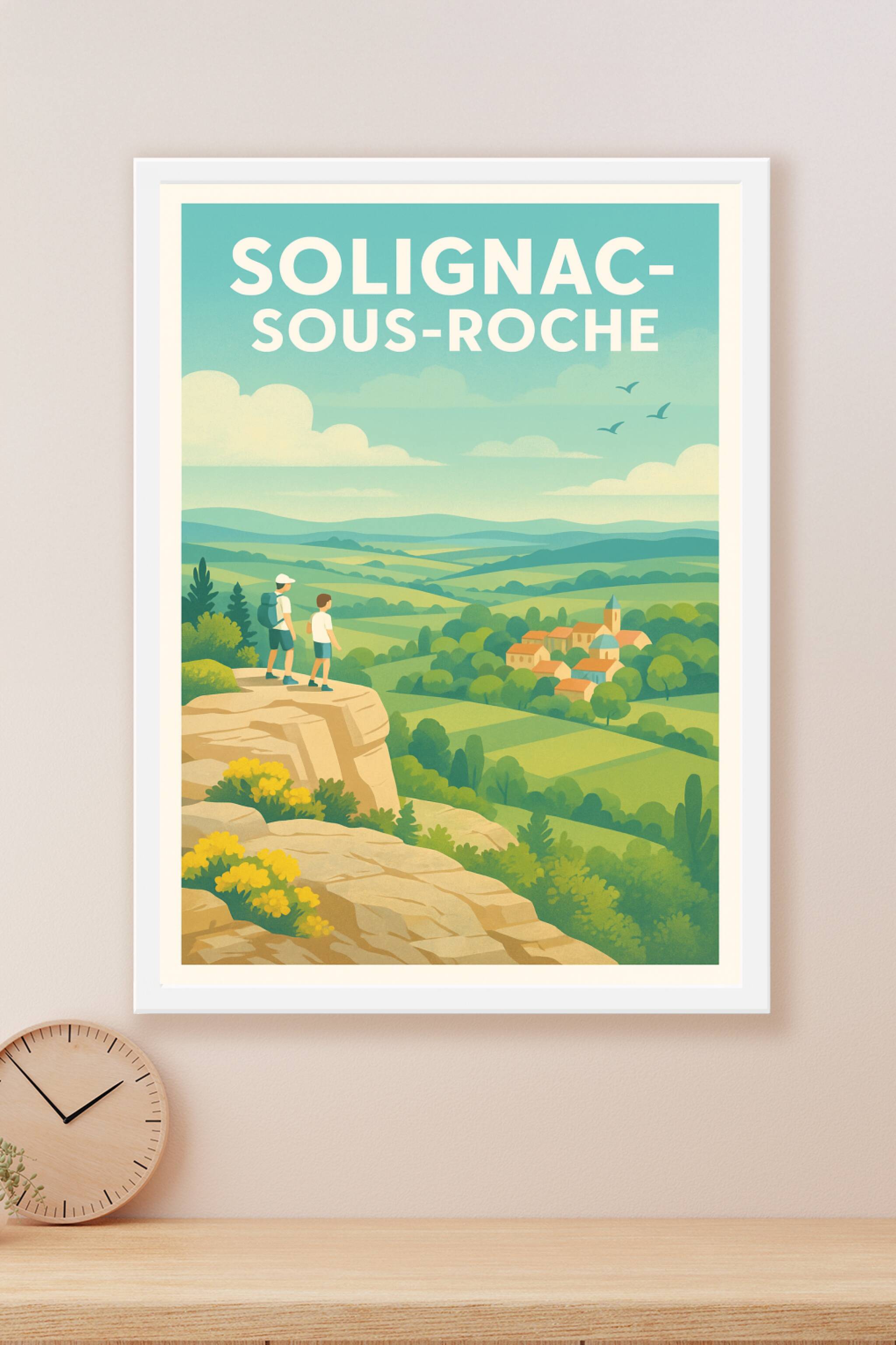 Découvrez la beauté sereine de Solignac-sous-Roche avec cette affiche illustrée au style rétro qui capture un paysage champêtre idyllique vu du sommet d'une falaise. Deux randonneurs admirent un village pittoresque niché parmi les collines verdoyantes. Ce poster est réalisé en tirage "Fine Art" sur papier 305g coton, garantissant une qualité d'impression supérieure et une longue tenue des couleurs. Disponible en plusieurs formats de A1 à A4, avec ou sans cadre, cette affiche sublime votre intérieur tout en vous invitant à une pause contemplative au cœur de la nature. Fabriquée en France, elle constitue un cadeau parfait ou un élément décoratif raffiné pour les amoureux des paysages et des escapades en plein air.